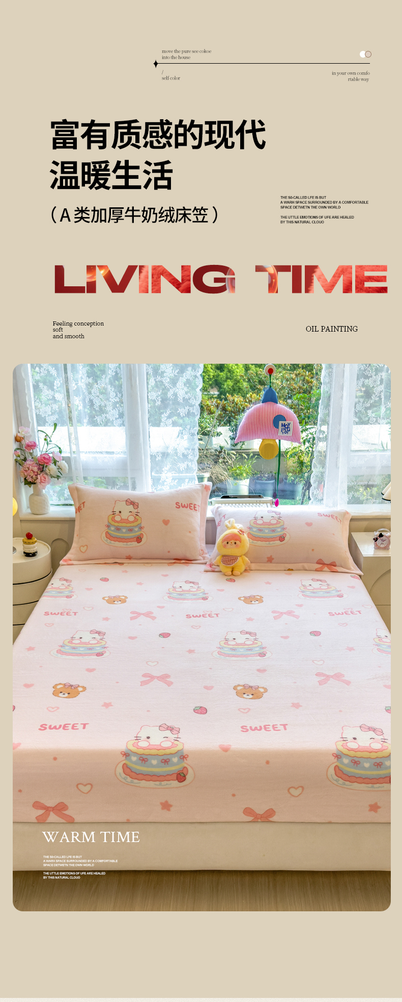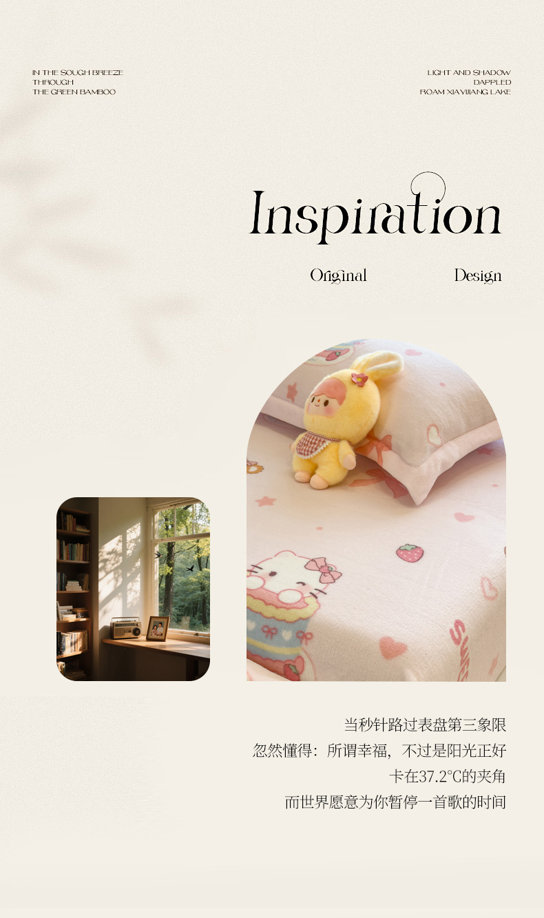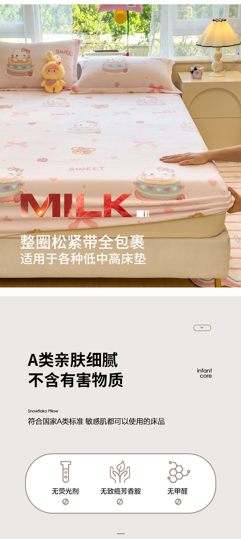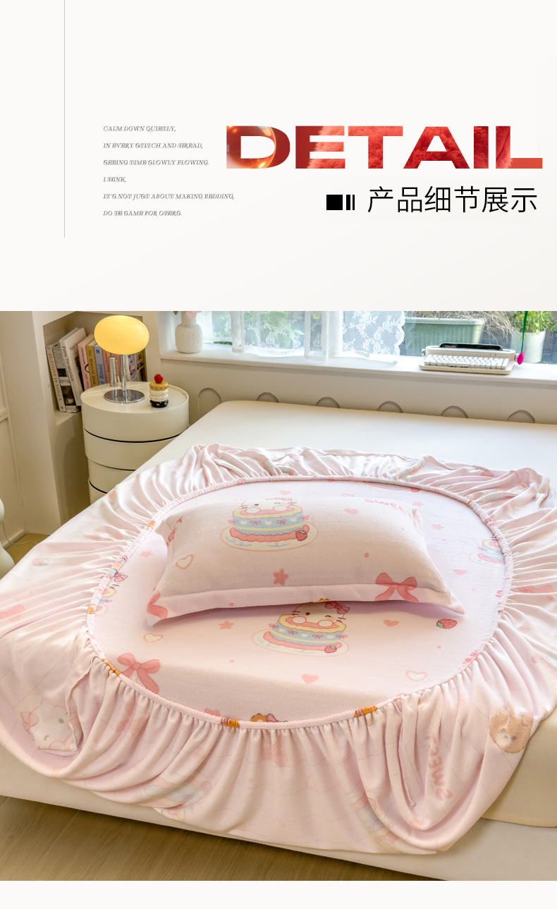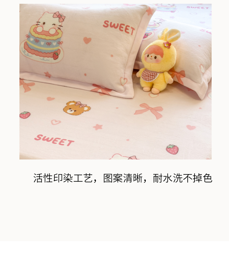 • 91家纺网 家纺一手货源 找家纺 丝羽坊 2025新款印花小清新牛奶绒印花床笠三件套 甜心猫