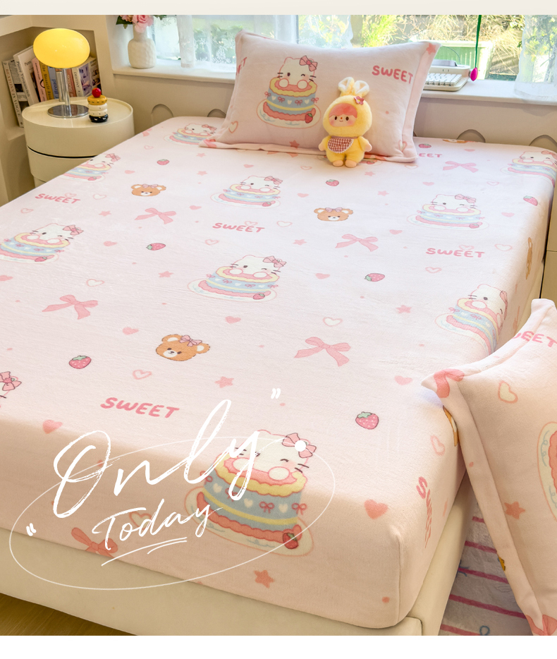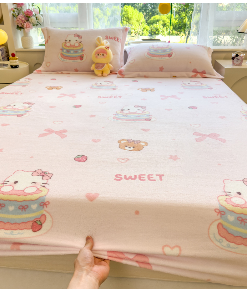 丝羽坊 2025新款印花小清新牛奶绒印花床笠三件套 甜心猫