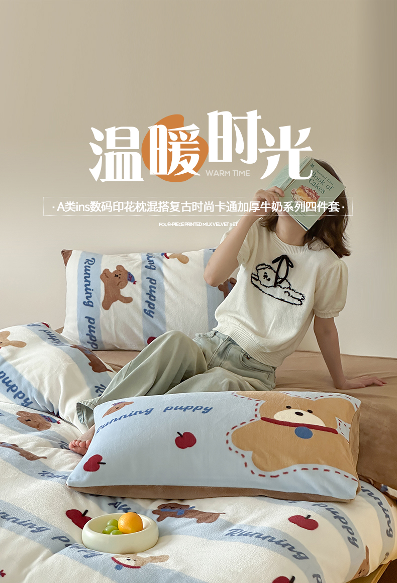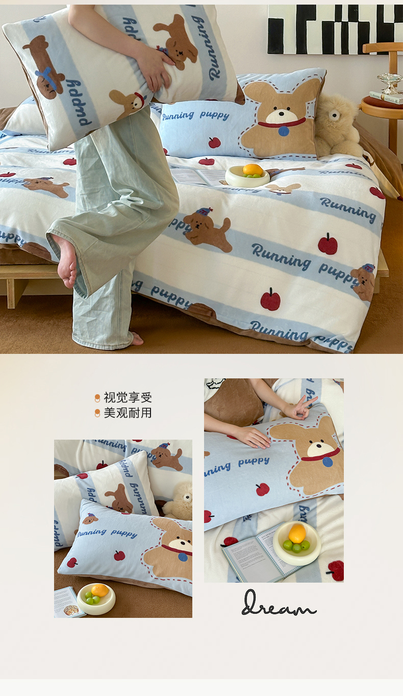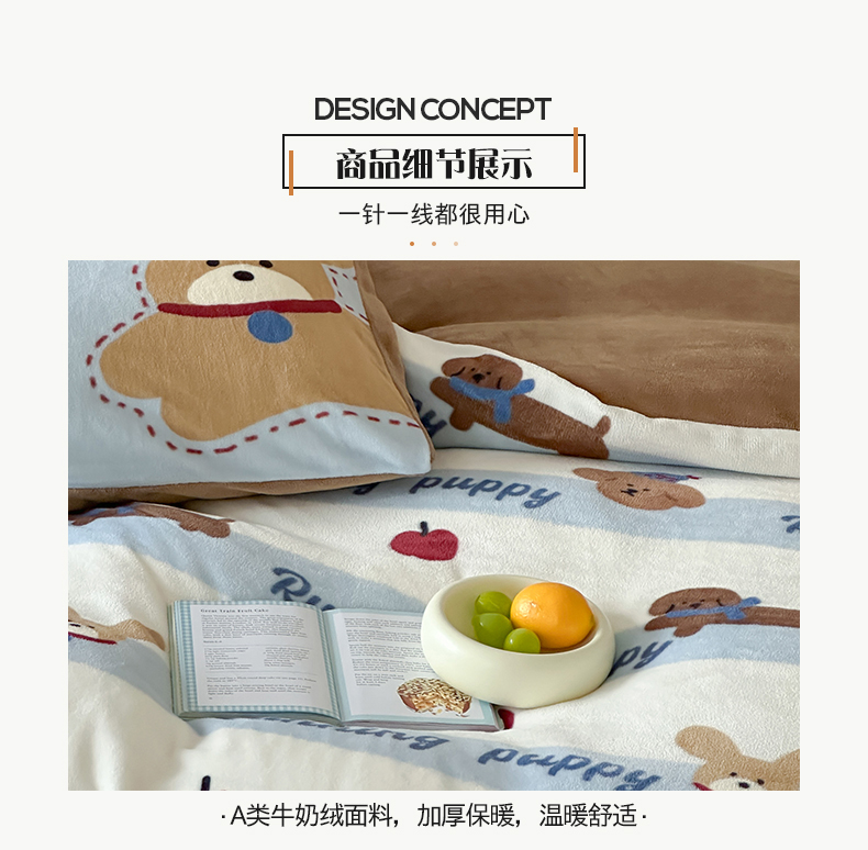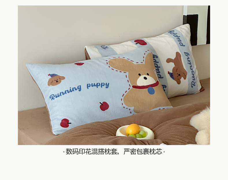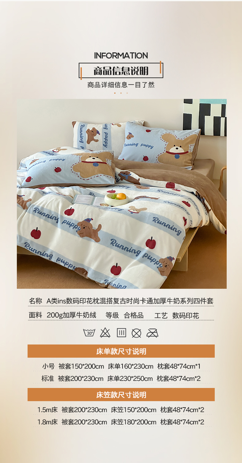 商品名称:桃子家居 2025新款A类ins数码印花枕混搭复古时尚卡通加厚牛奶系列四件套 绒-混搭俏皮狗蓝
