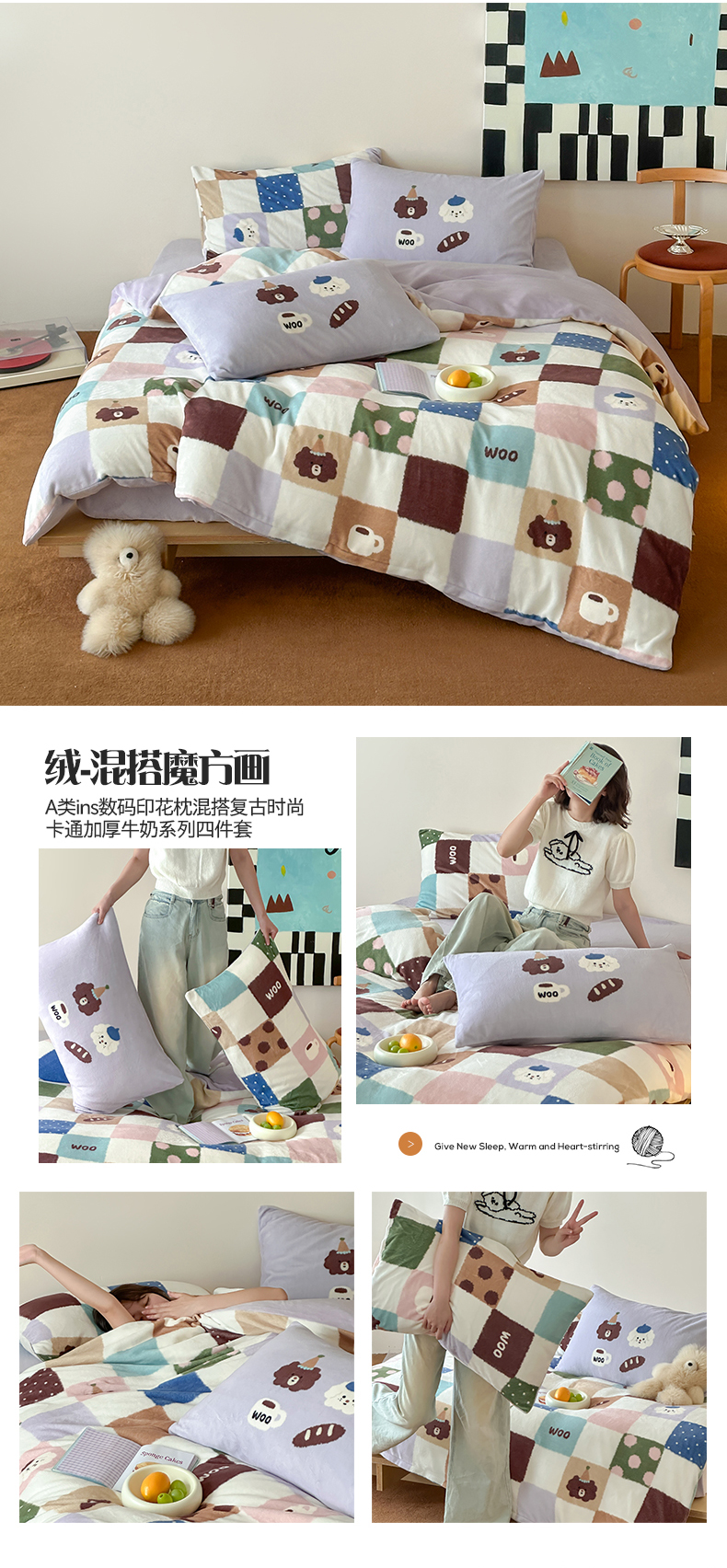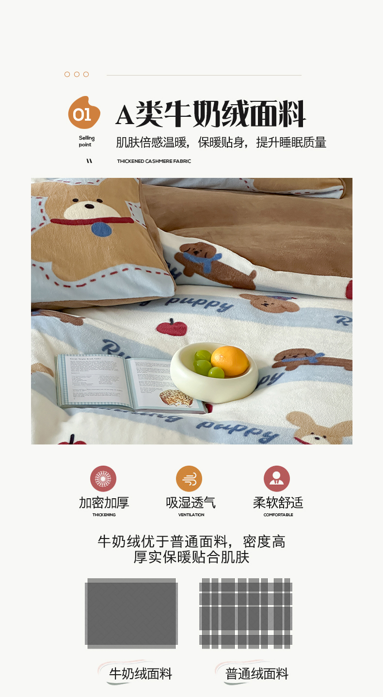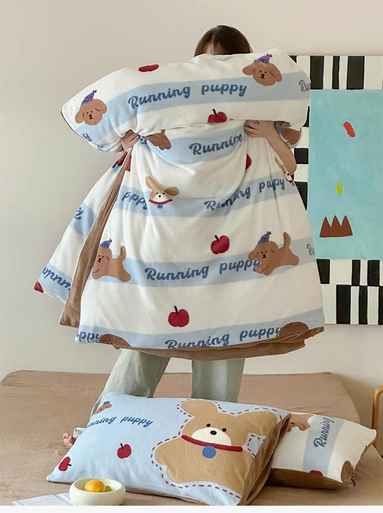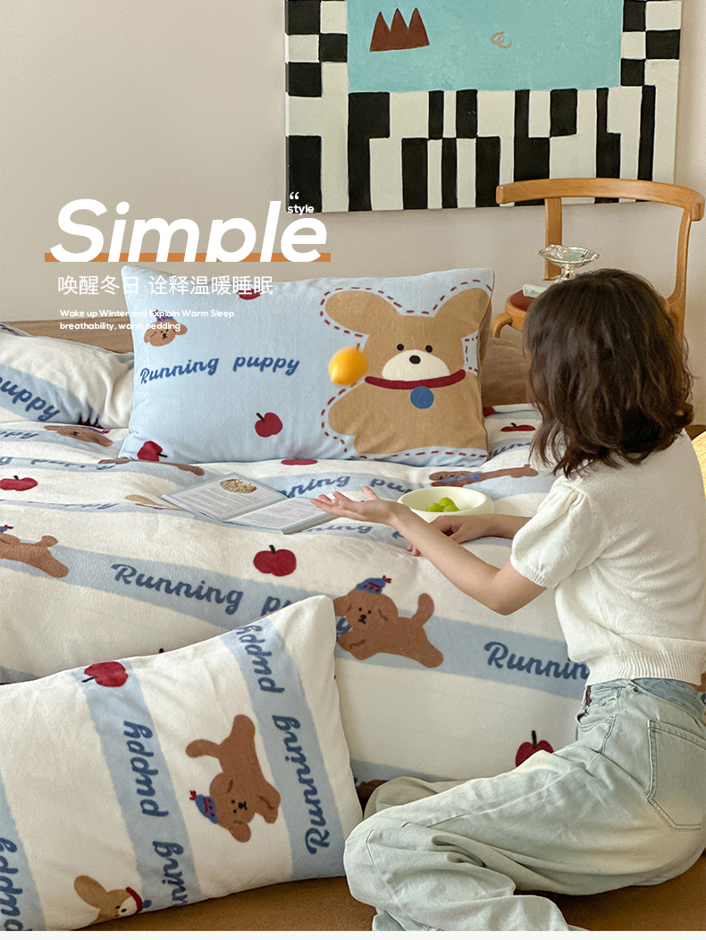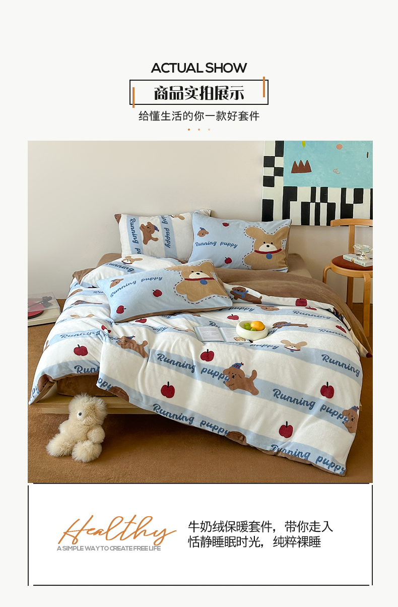 商品名称:桃子家居 2025新款A类ins数码印花枕混搭复古时尚卡通加厚牛奶系列四件套 绒-混搭俏皮狗蓝
