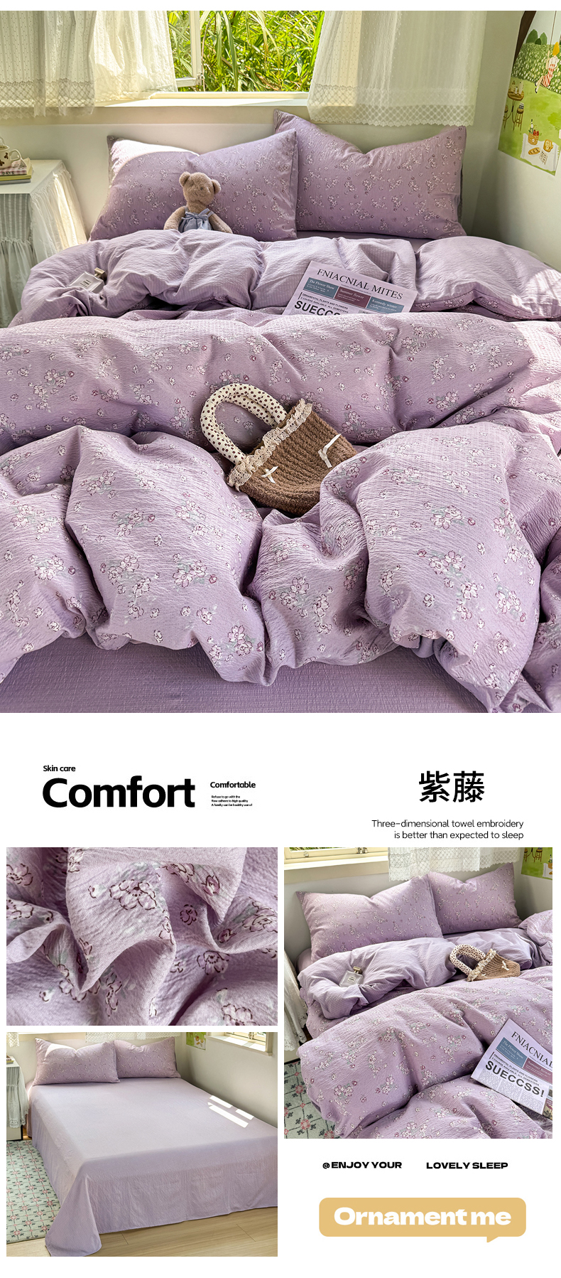 当前位置: 91家纺网 > 商品网购 > 床品套件 > 四件套 > 化纤活性四件套 > 优兰朵 2025新款超柔云感木棉印花小清新四件套 紫藤
