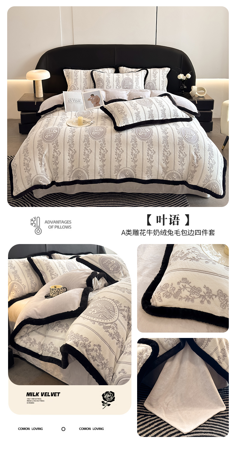 商品名称:卡罗兰 2025新款雕花牛奶绒兔毛包边四件套 叶语