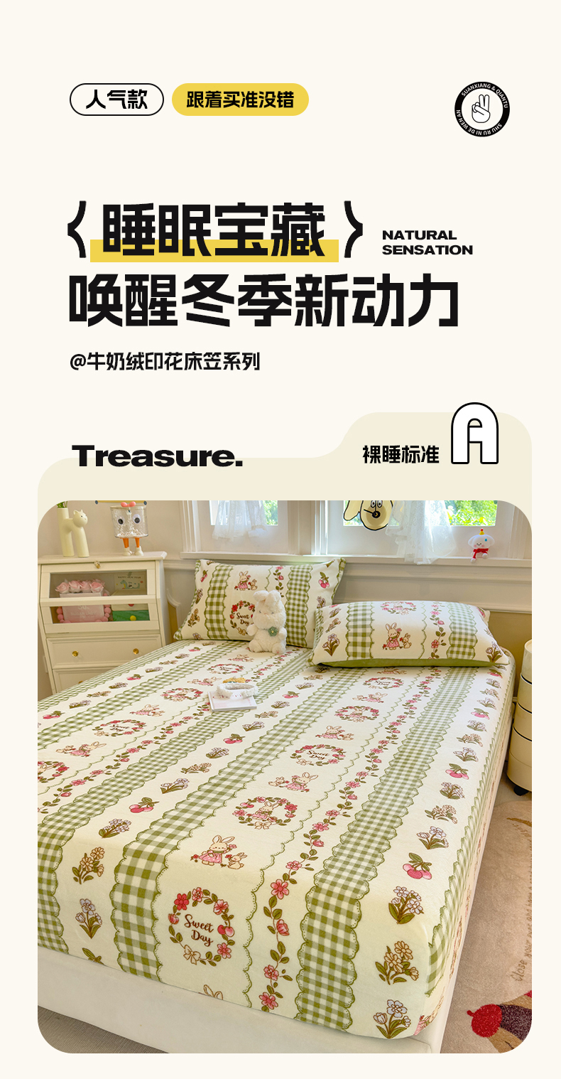 • 91家纺网 家纺一手货源 找家纺 摩妮卡 2025新款印花系列小清新牛奶绒印花床笠三件套 情系花香