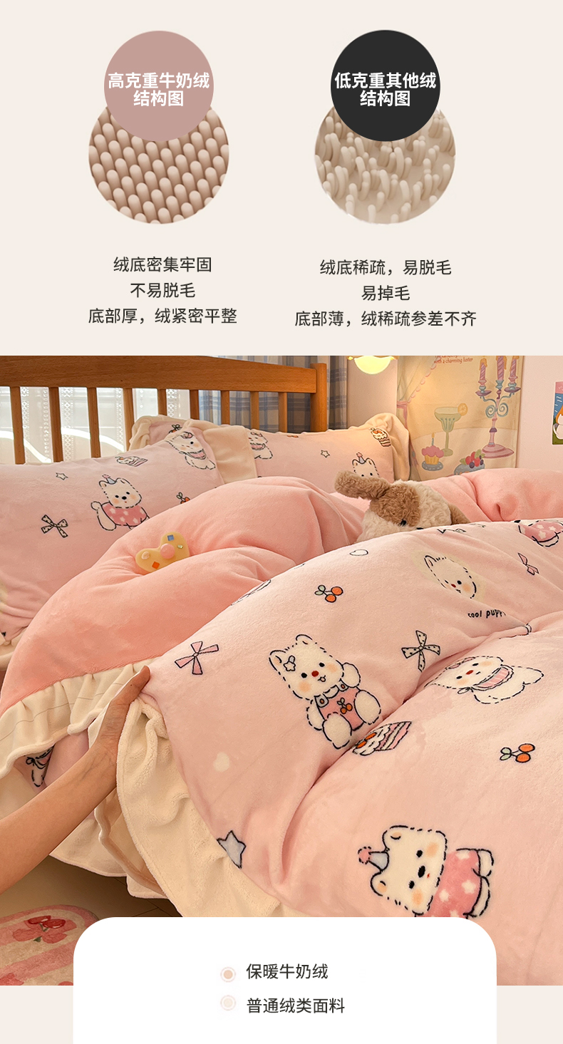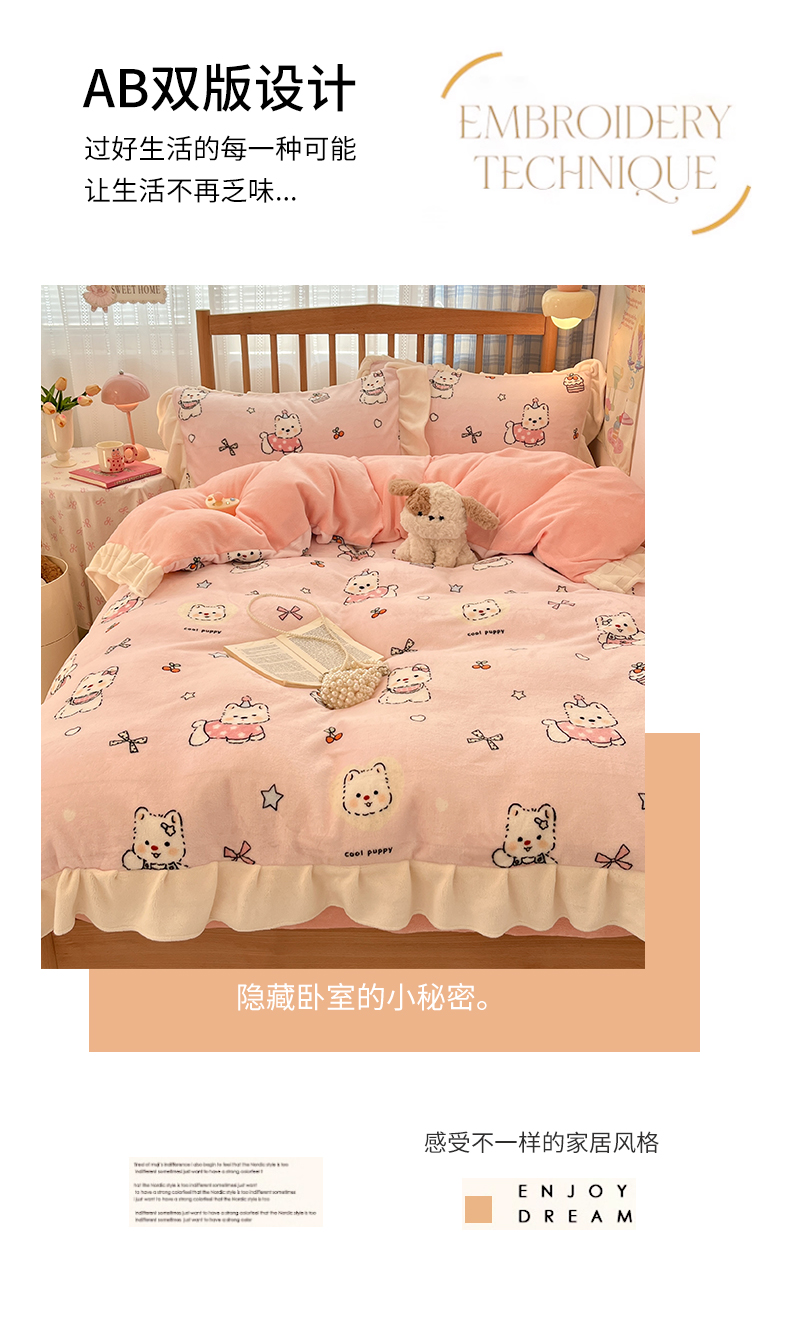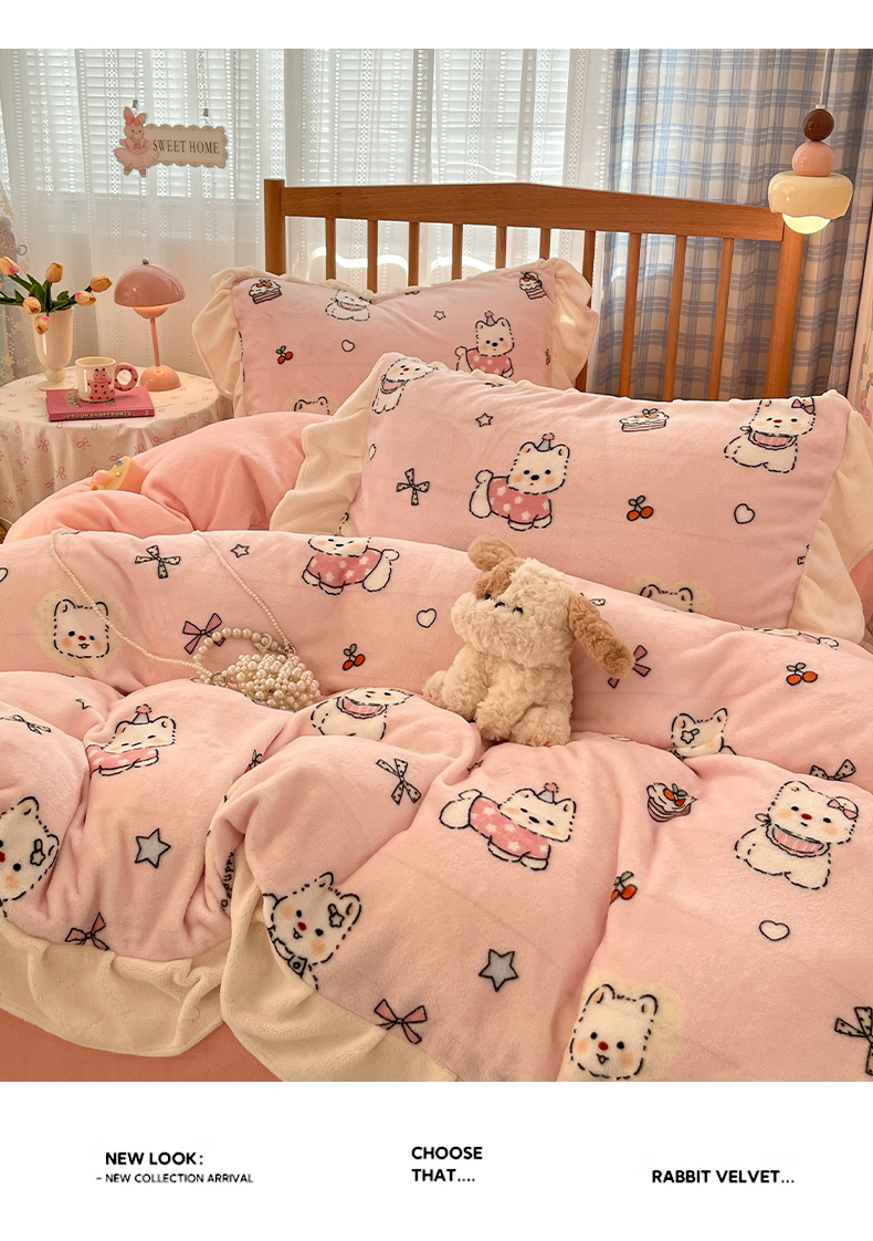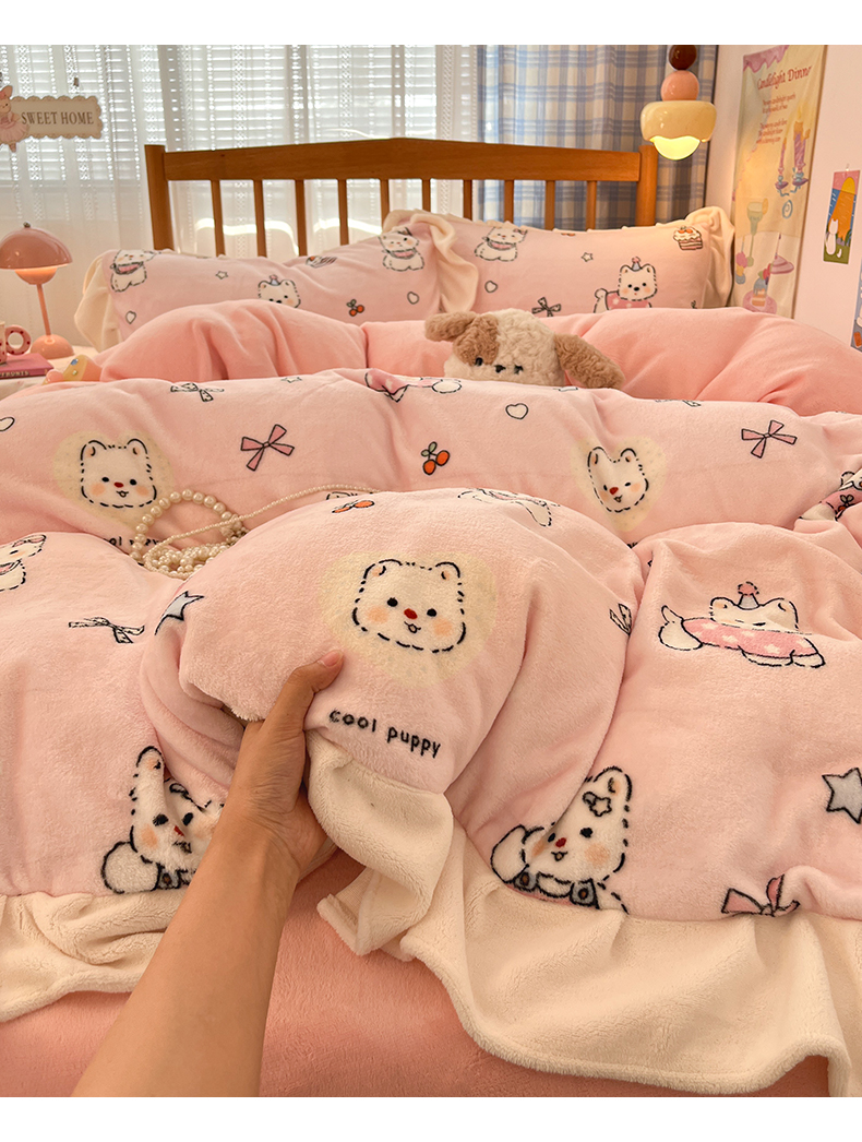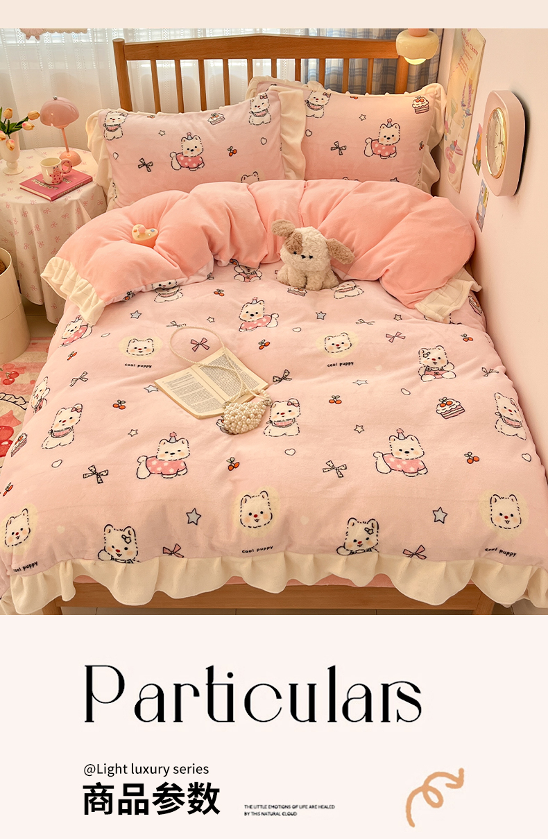当前位置: 91家纺网 > 商品网购 > 床品套件 > 四件套 > 牛奶绒四件套 > 川悦生活 2025新款A类韩版花边牛奶绒四件套 花边茶派小狗粉