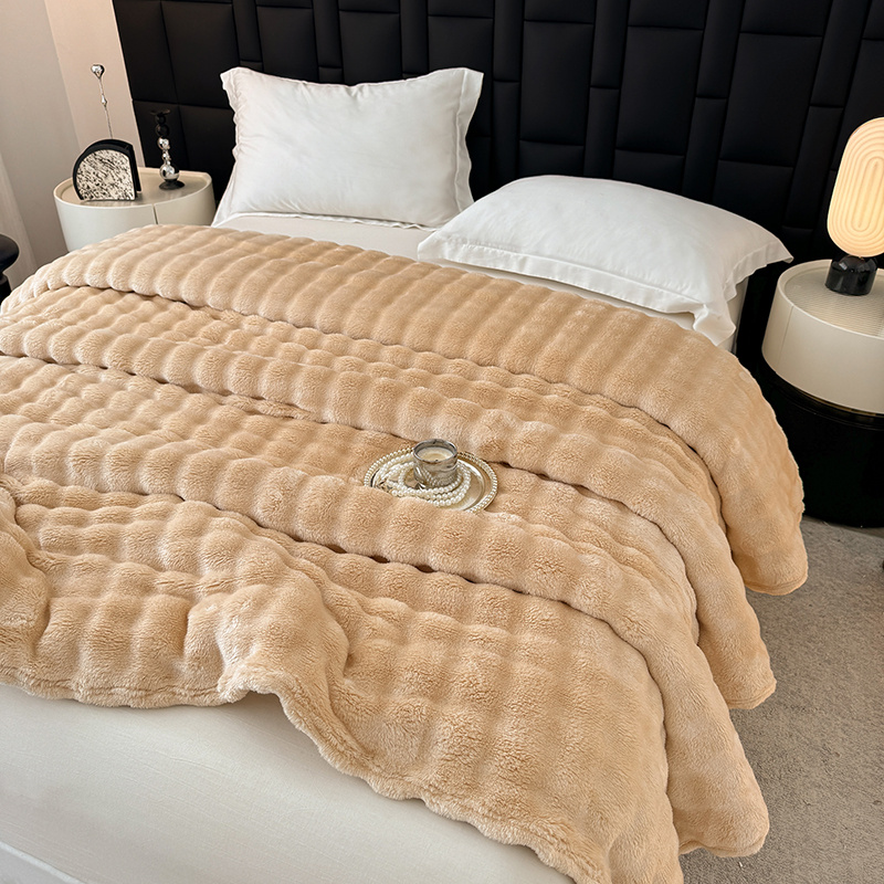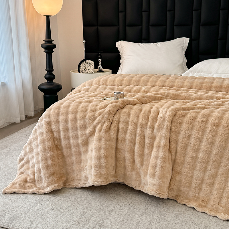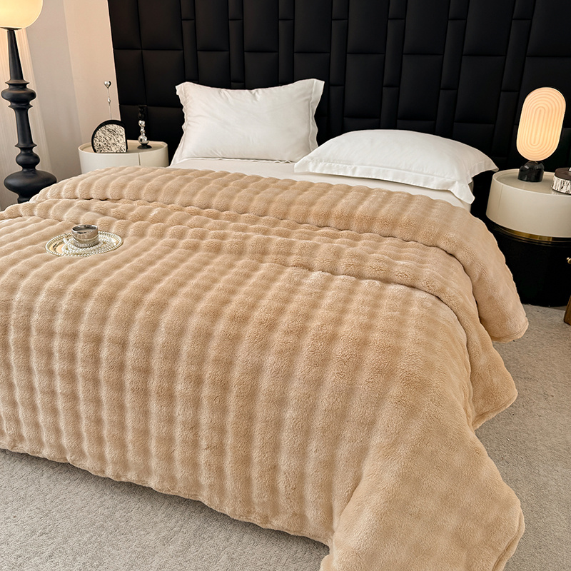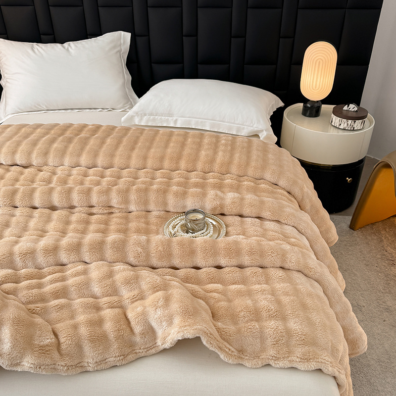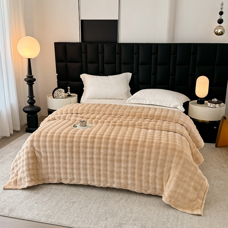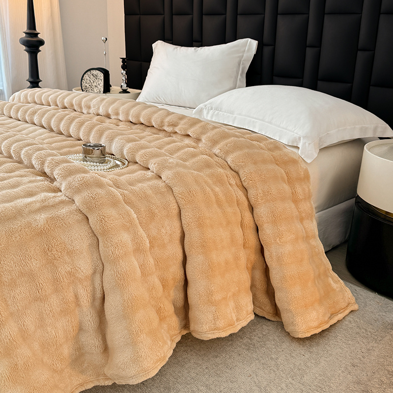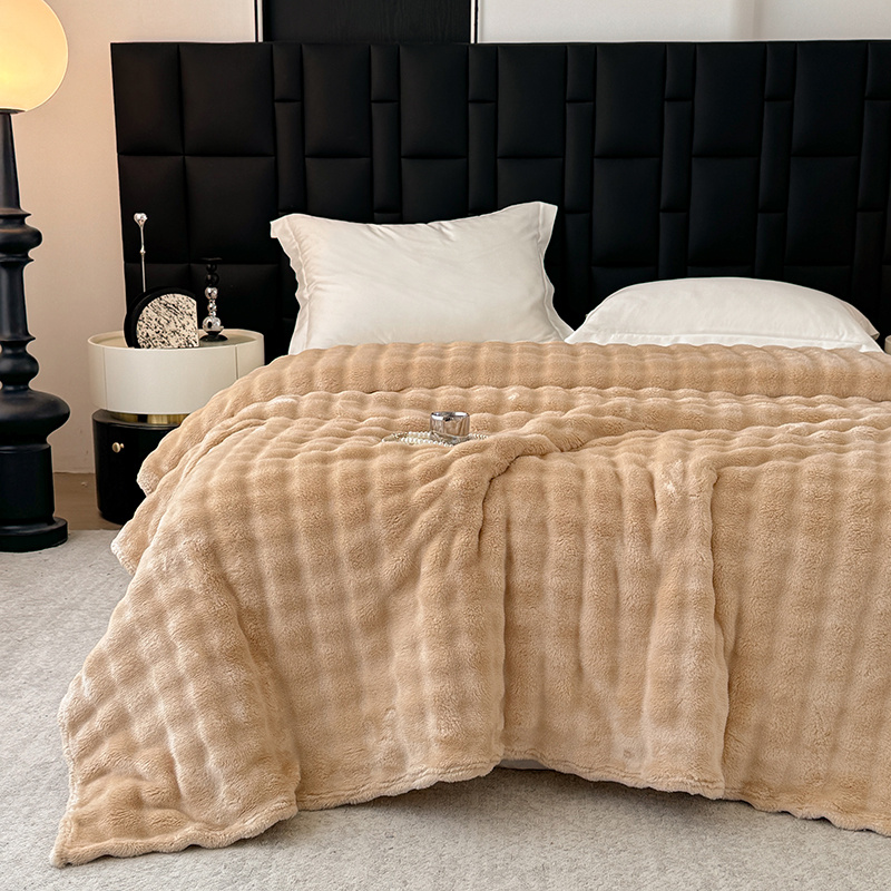 安琪家纺 2025新款300G炫彩水墨画仿兔毛绒大泡泡绒印花法兰绒毛毯大理石纹休闲毯沙发盖毯跨境外贸出口专供 泡泡纯色-驼色