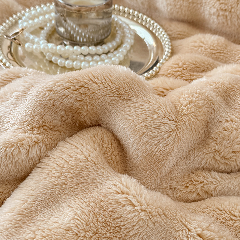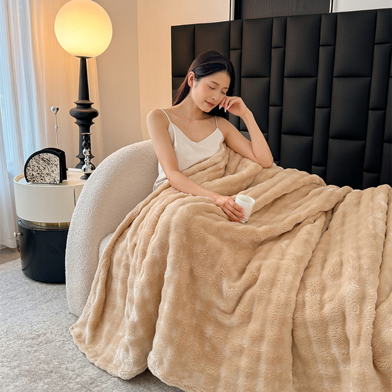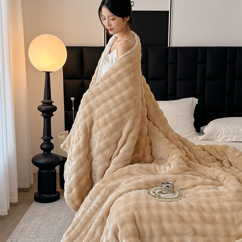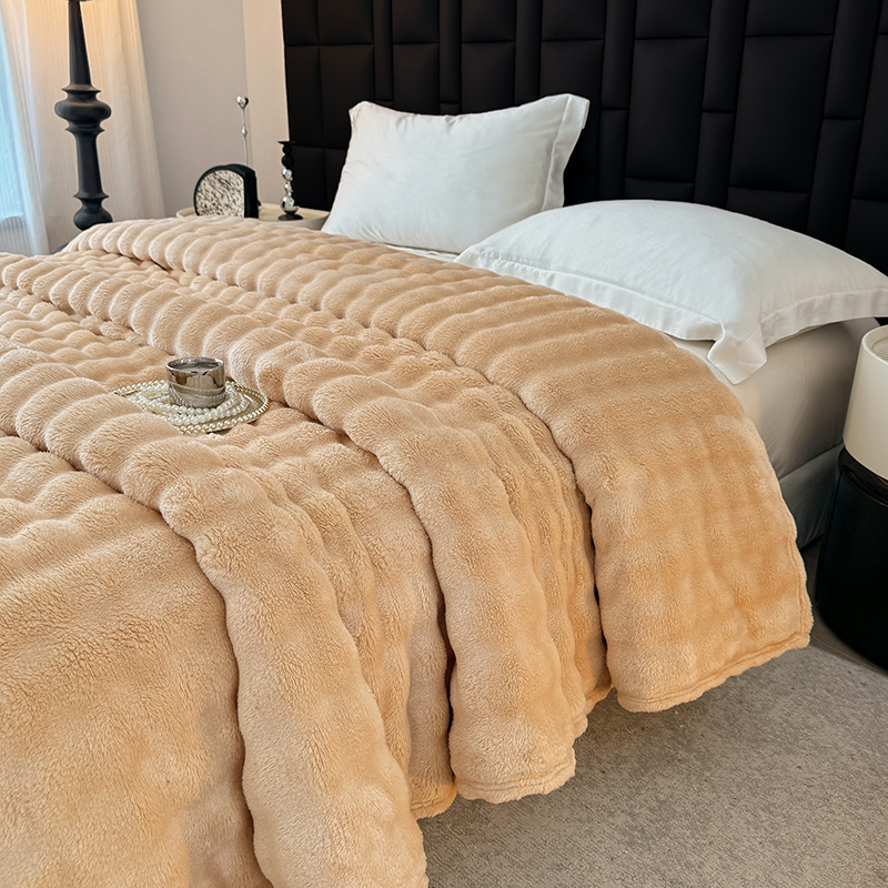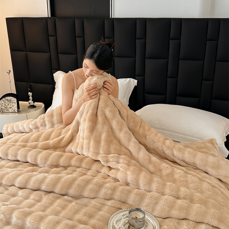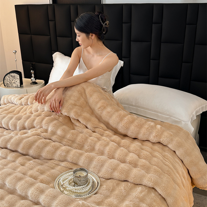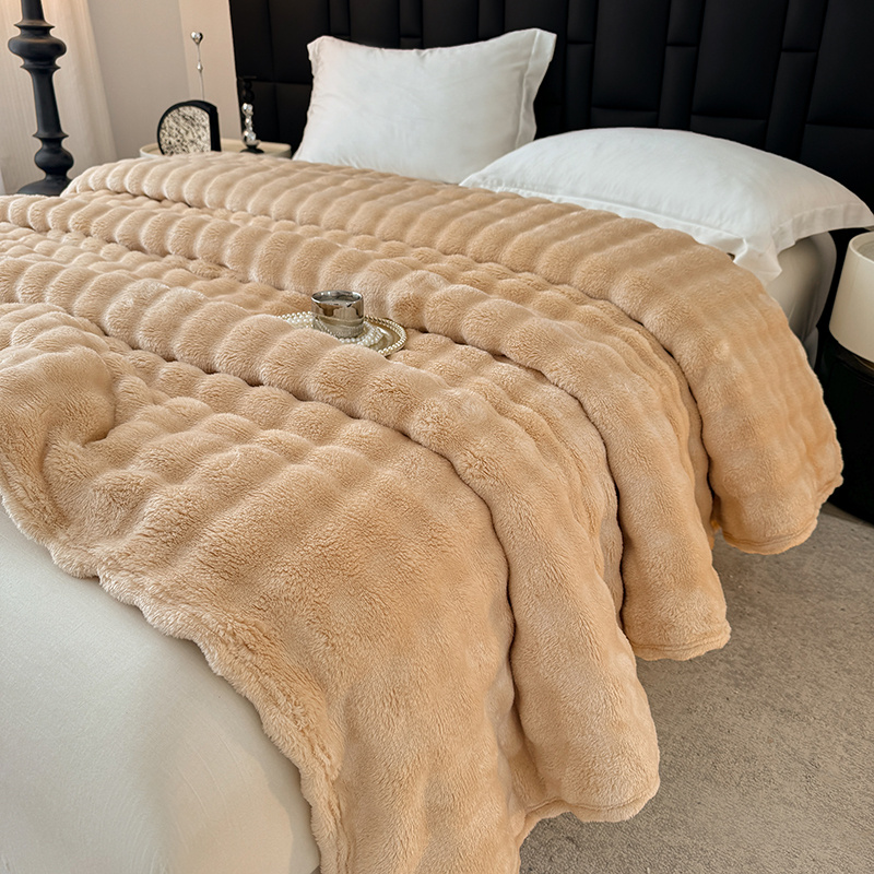 安琪家纺 2025新款300G炫彩水墨画仿兔毛绒大泡泡绒印花法兰绒毛毯大理石纹休闲毯沙发盖毯跨境外贸出口专供 泡泡纯色-驼色