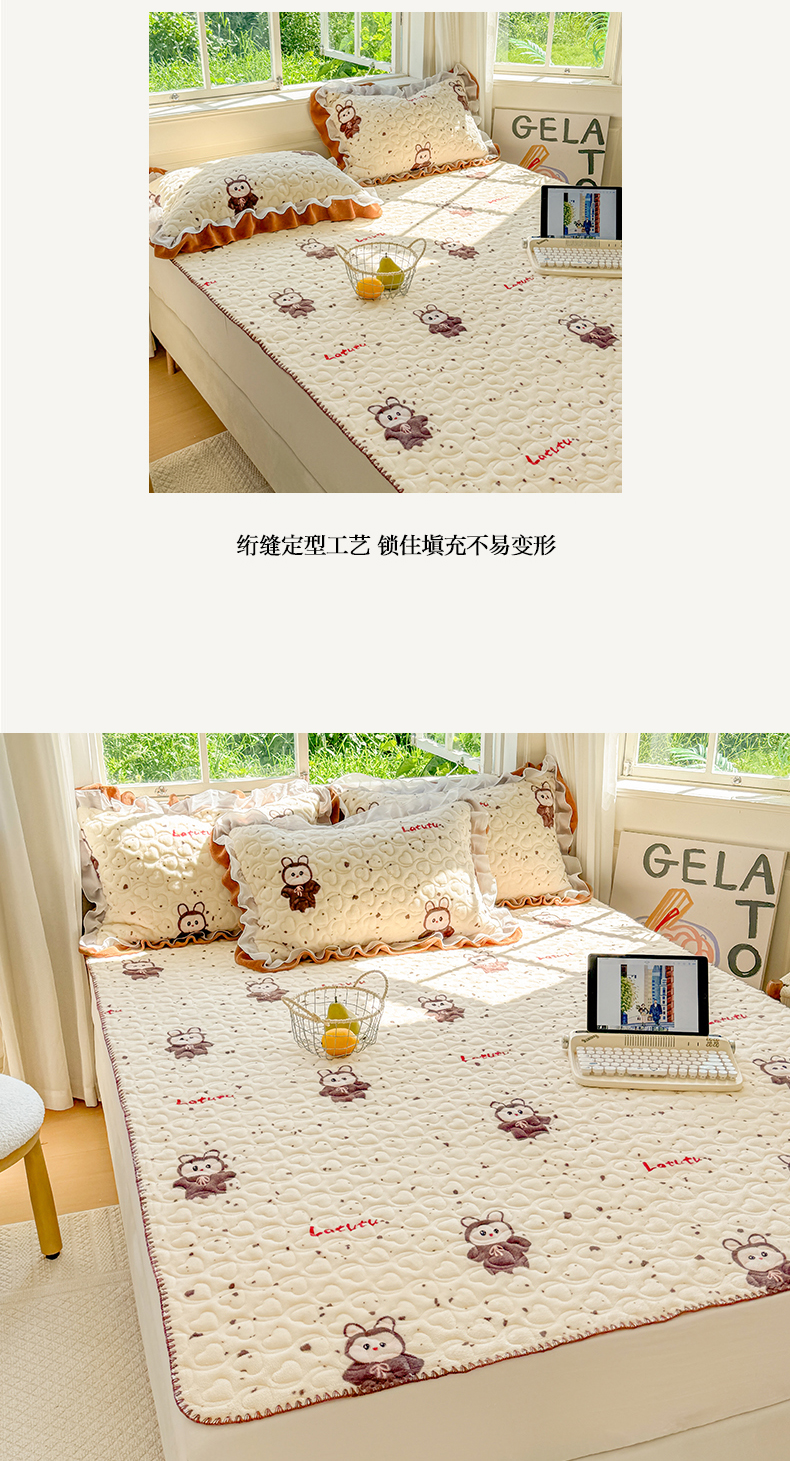 (总)禧缘家纺(原梦想家) 2025新款夹棉双层花边牛奶绒床笠三件套系列,布布乐园,步步生花,杏花微雨,雾都茶花,摩卡小镇,猫咪心事,浪漫花开,蓝铃风语,狗狗岛屿,落日云舒
