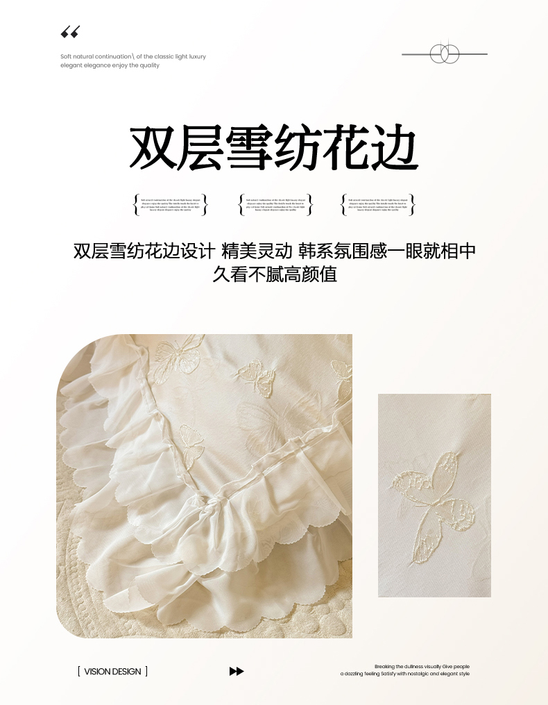 (总)艾米2025新款水洗真丝双层鱼尾边四件套-梦丽纱系列,白色,鹅黄,灰色,橘色,浅豆沙,浅粉,水绿,天蓝,香槟