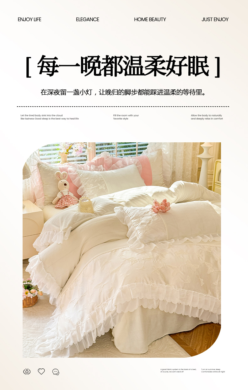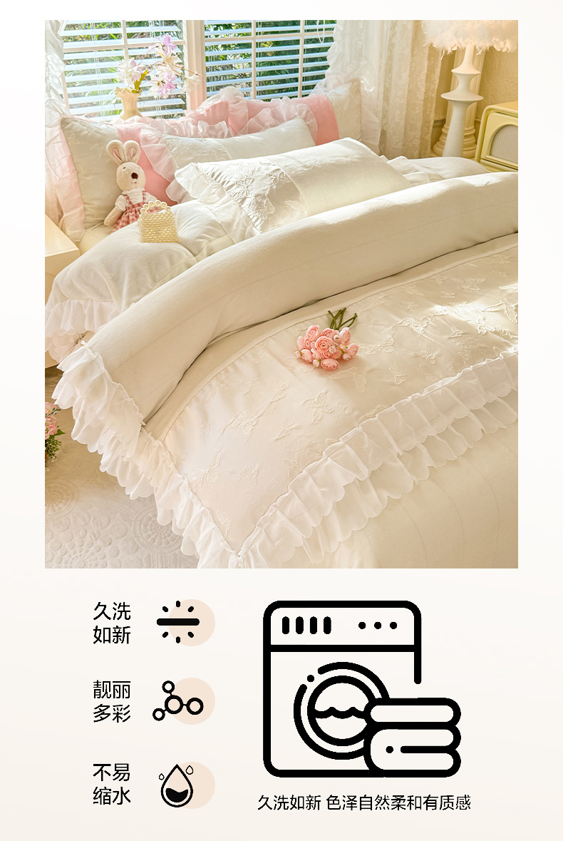 艾米家居 2025新款韩版双层花边轻奢浮雕系列水洗冰丝四件套 白花边,白花边