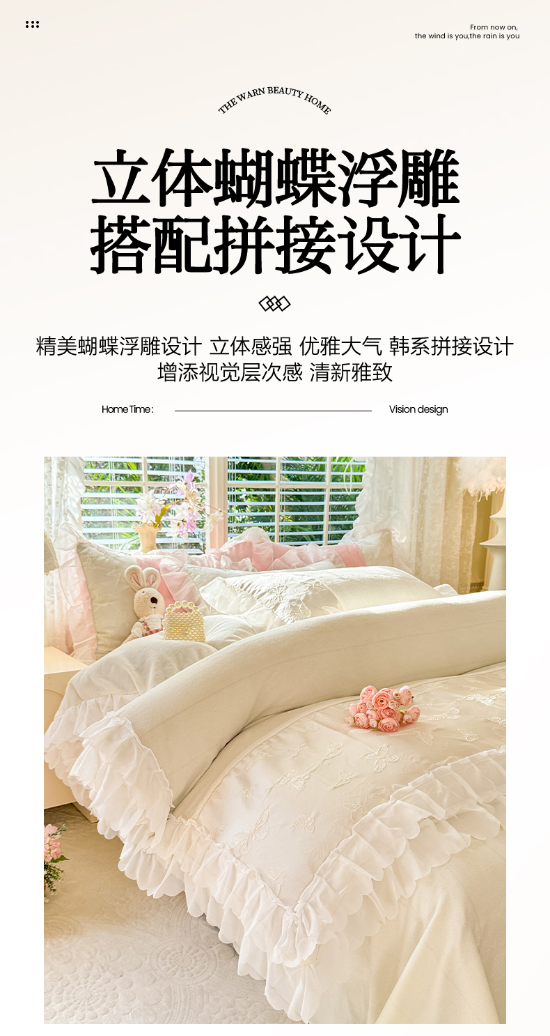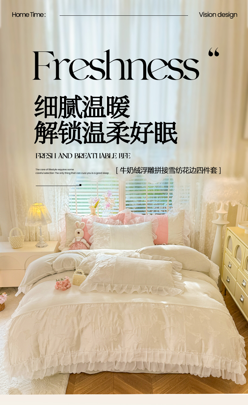 (总)艾米家居 2025秋冬新款浮雕牛奶绒花边四件套,白色,豆沙,粉色