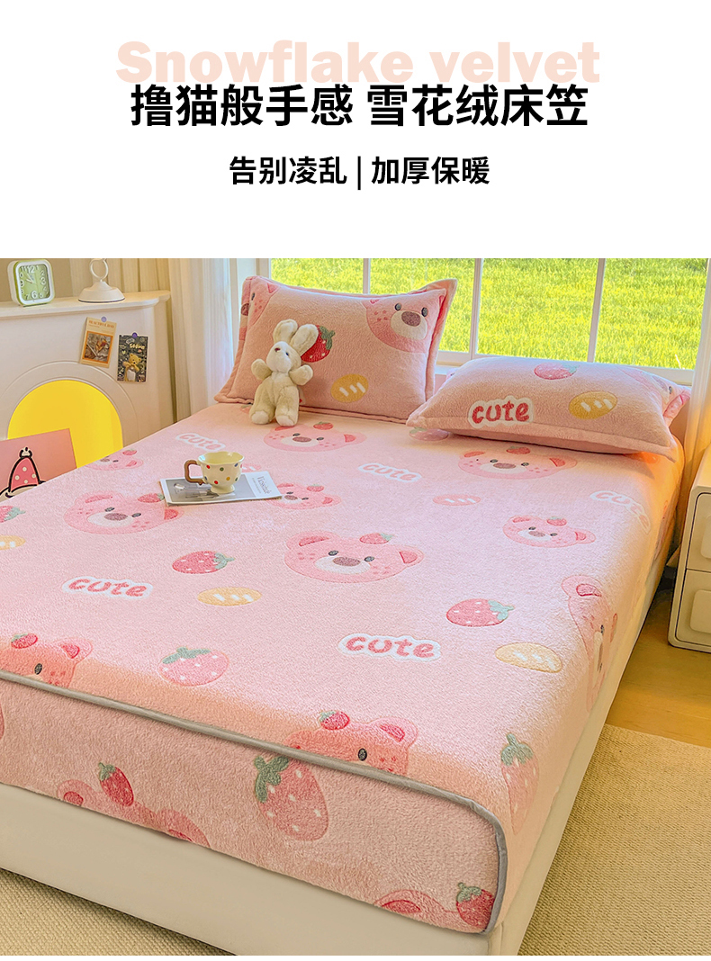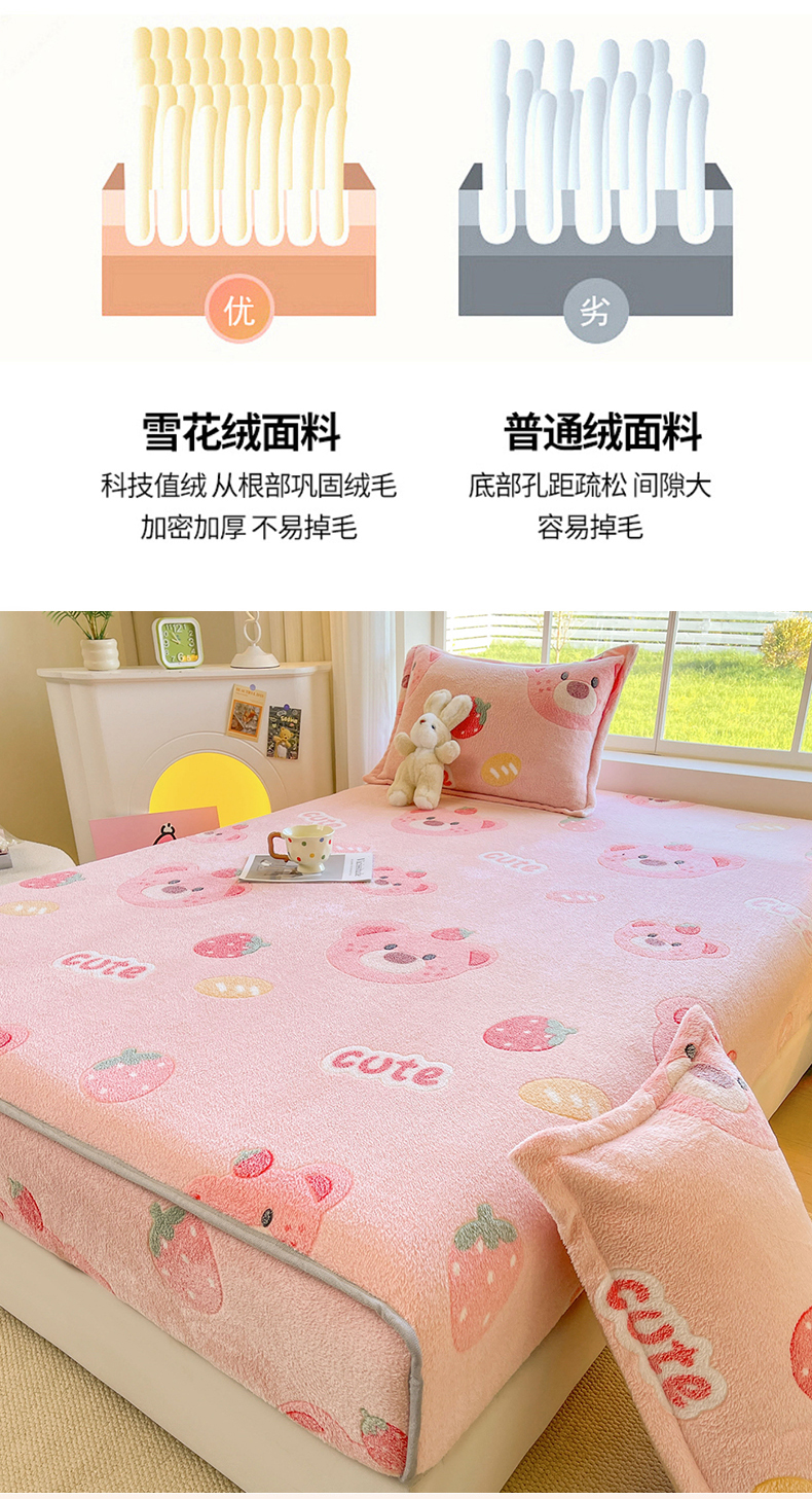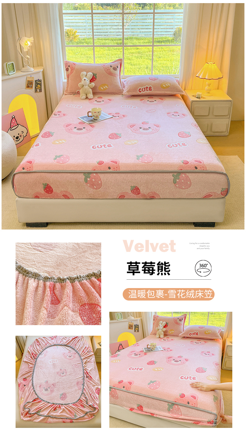 牵梦萦家纺 2025新款雪花绒立体包边床笠 草莓熊
