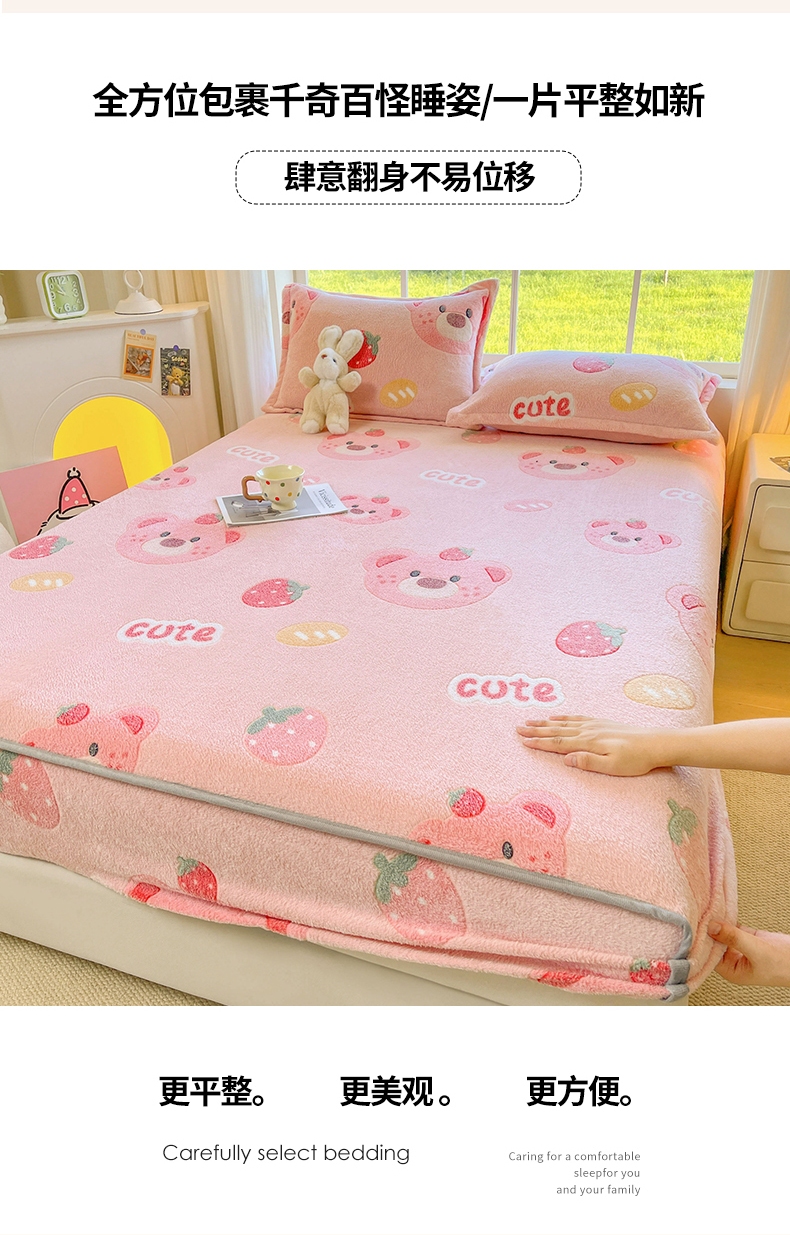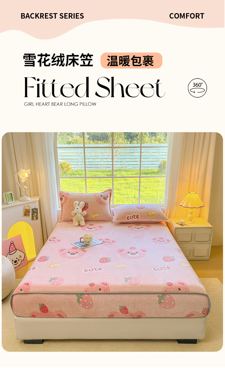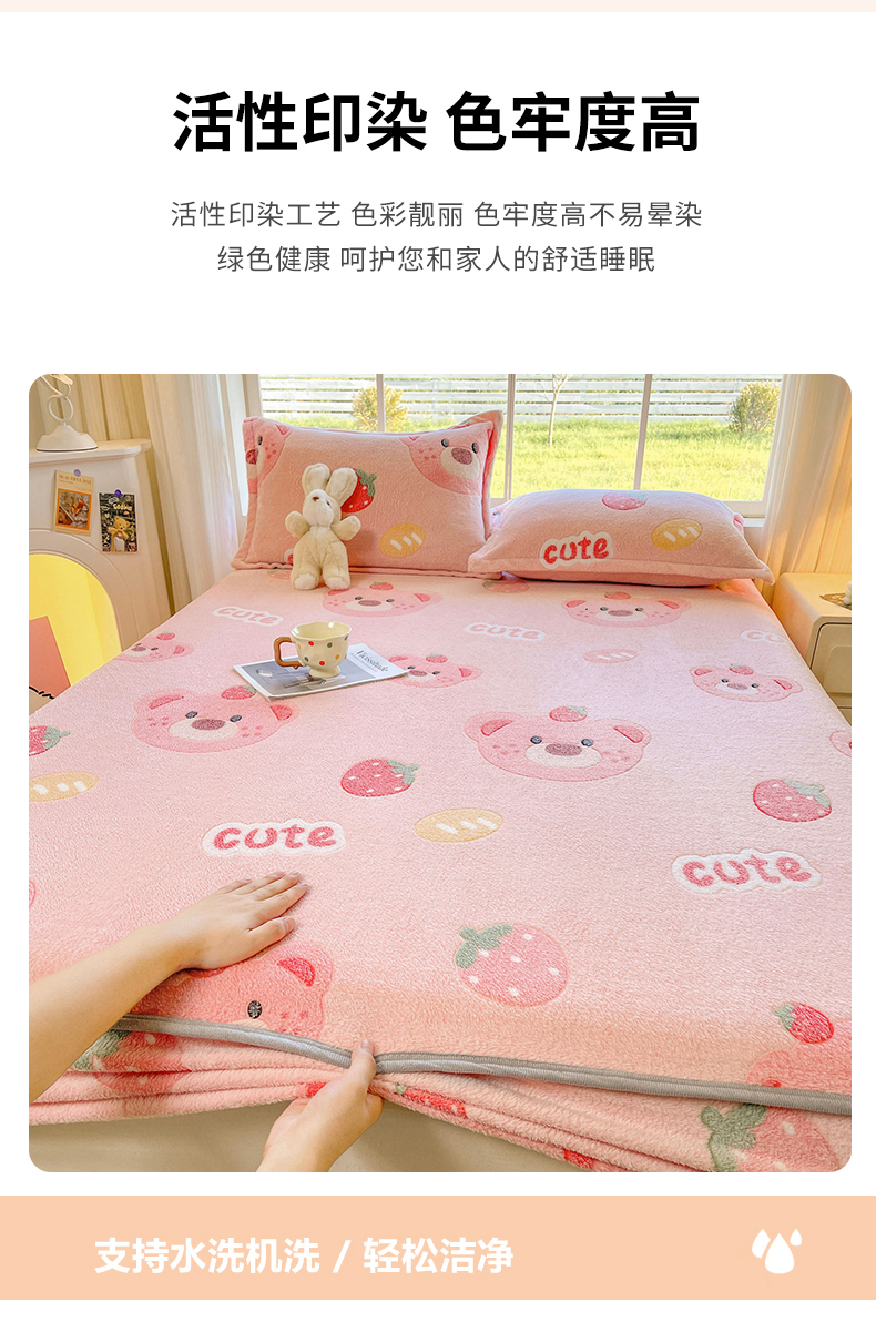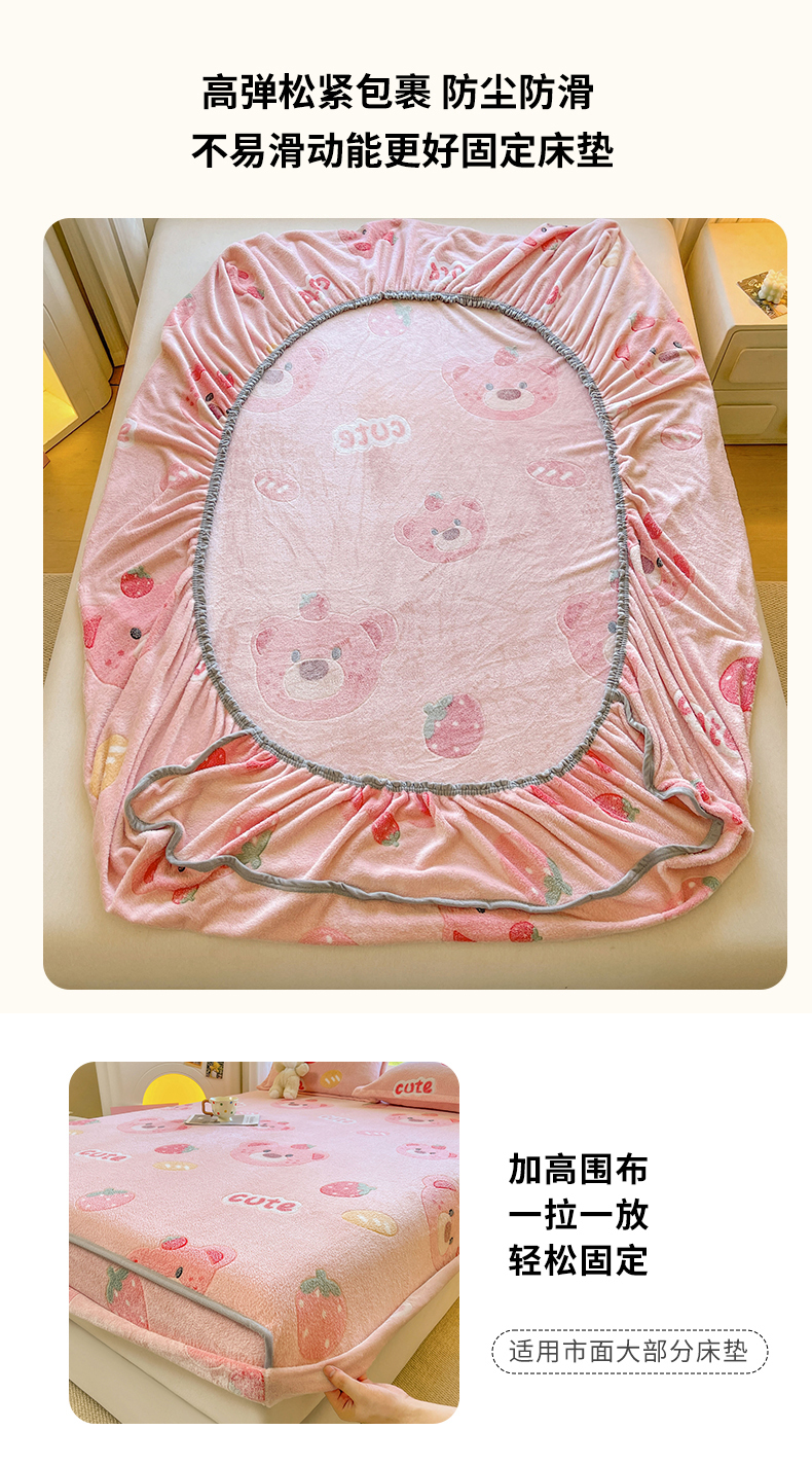 牵梦萦家纺 2025新款雪花绒立体包边床笠 草莓熊