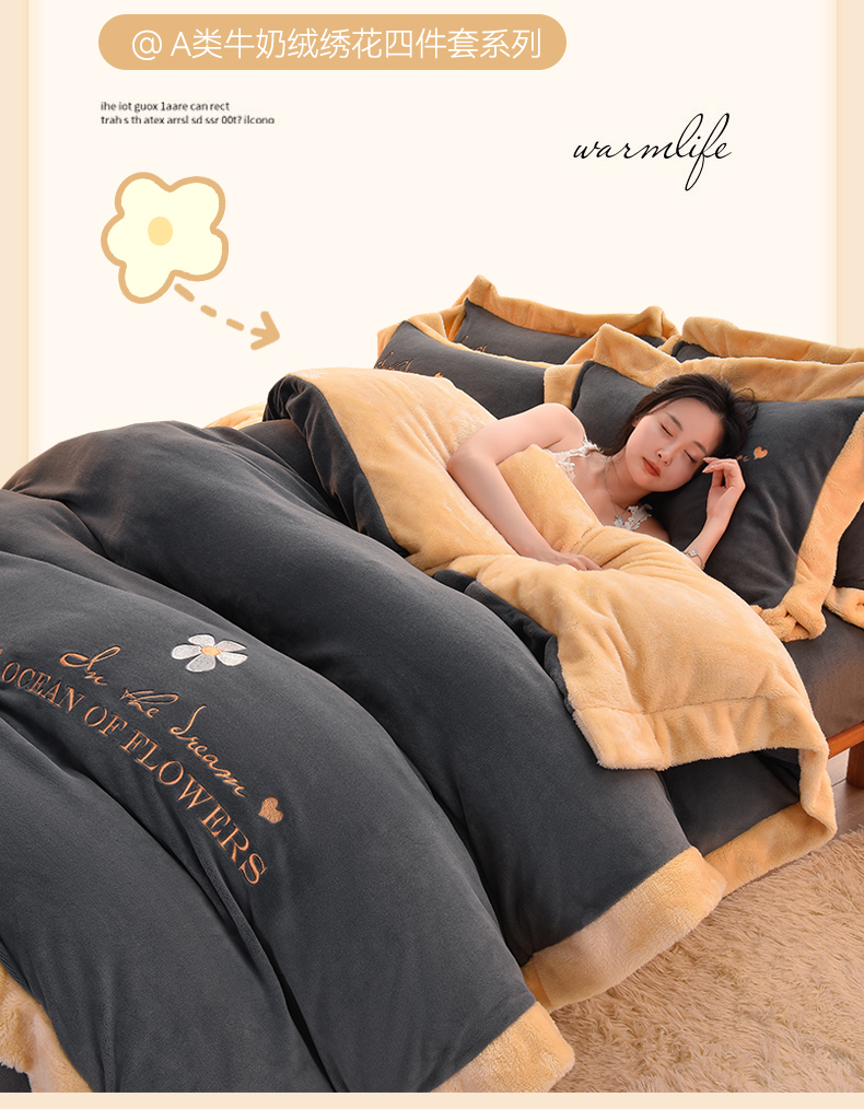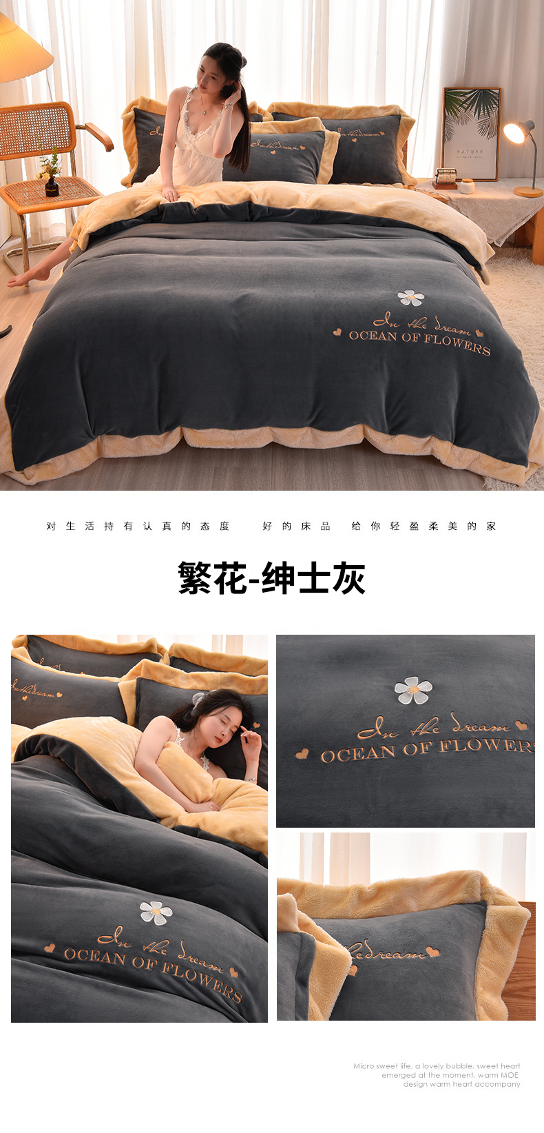 商品名称:笙意 新款牛奶绒刺绣四件套-繁花系列 繁花-绅士灰