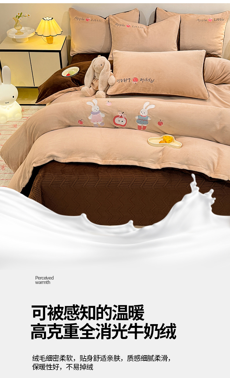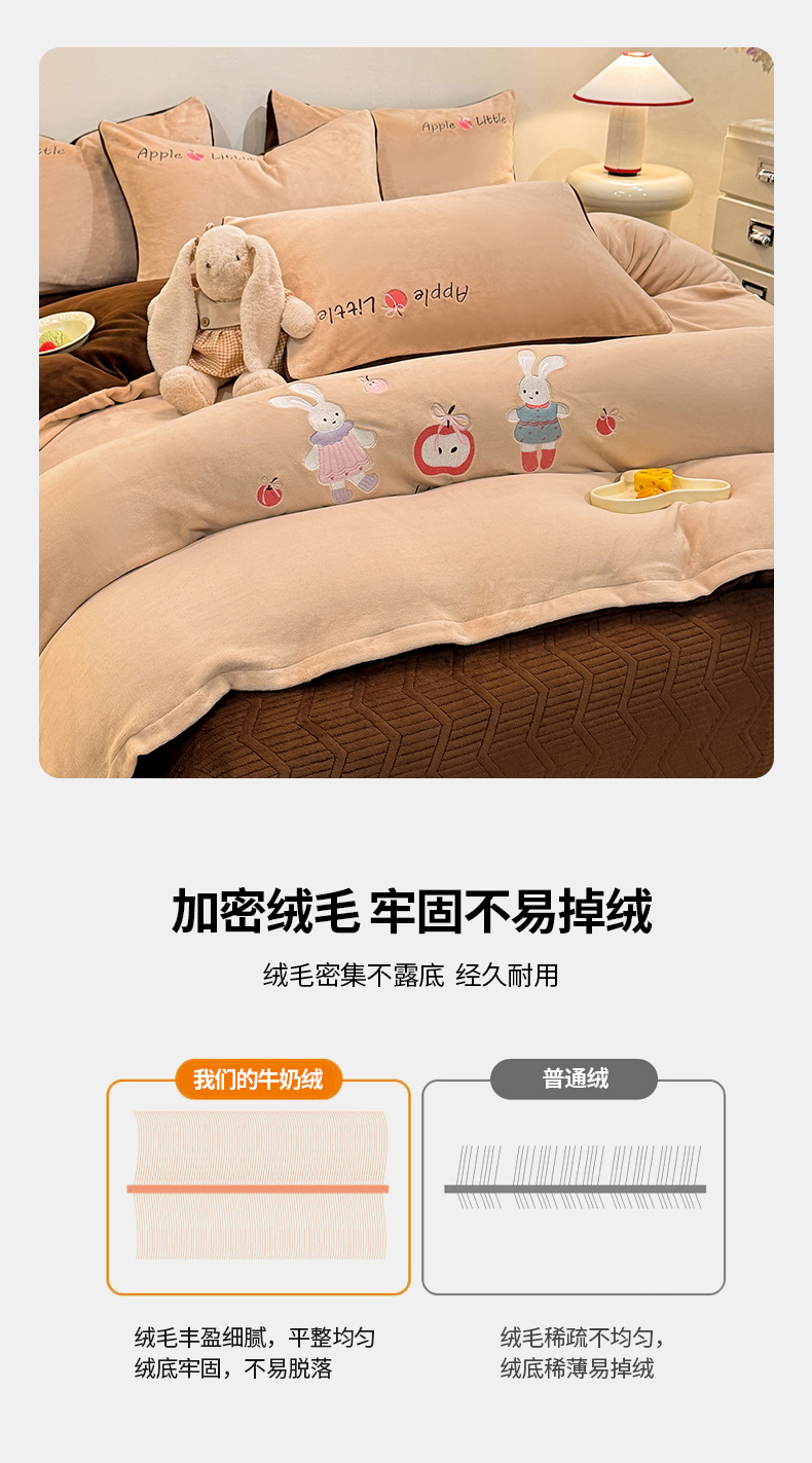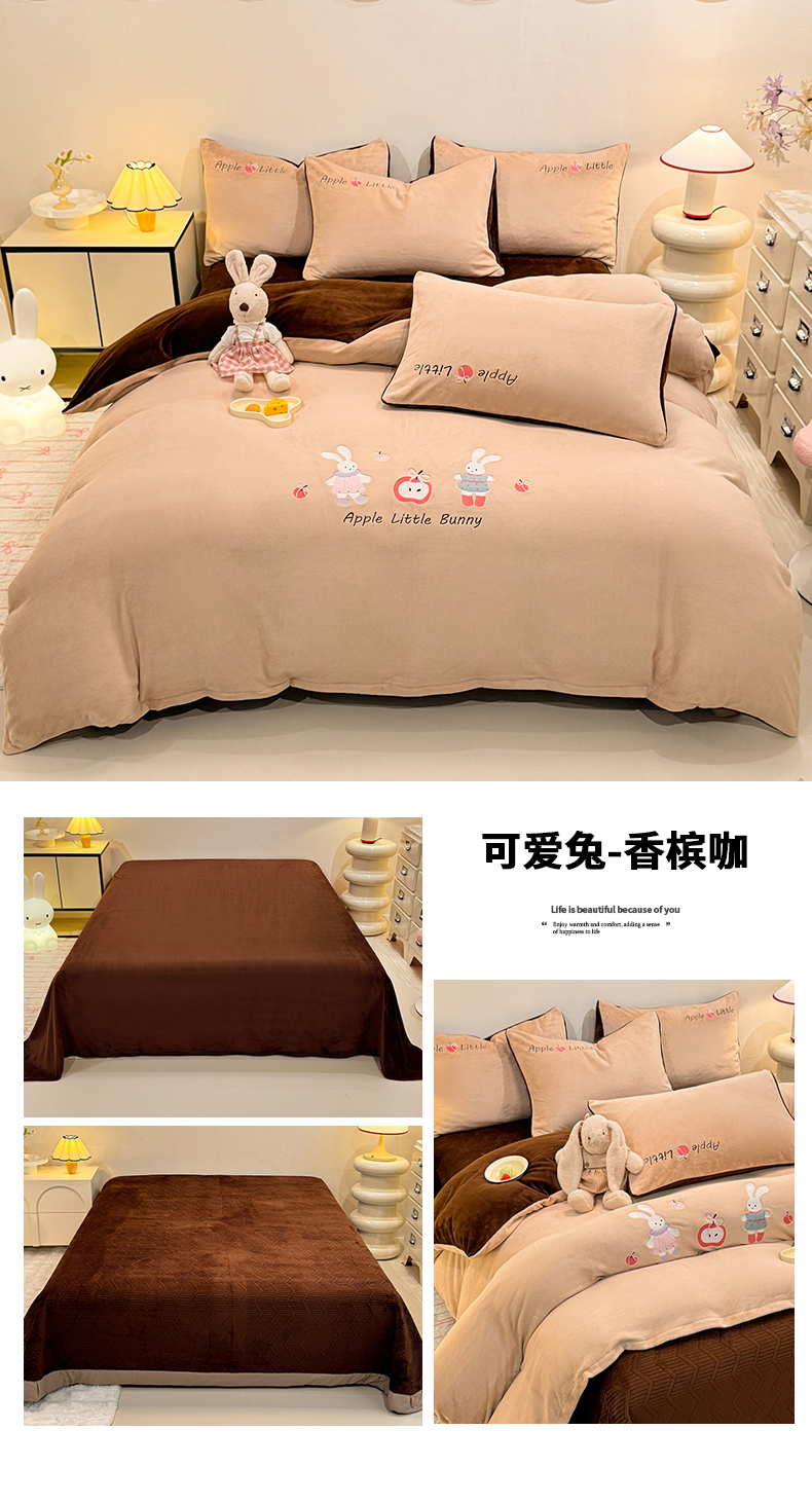 当前位置: 91家纺网 > 商品网购 > 床品套件 > 四件套 > 牛奶绒四件套 > 新方向 2025新款全消光A类刺绣牛奶绒四件套-可爱兔 可爱兔-香槟咖