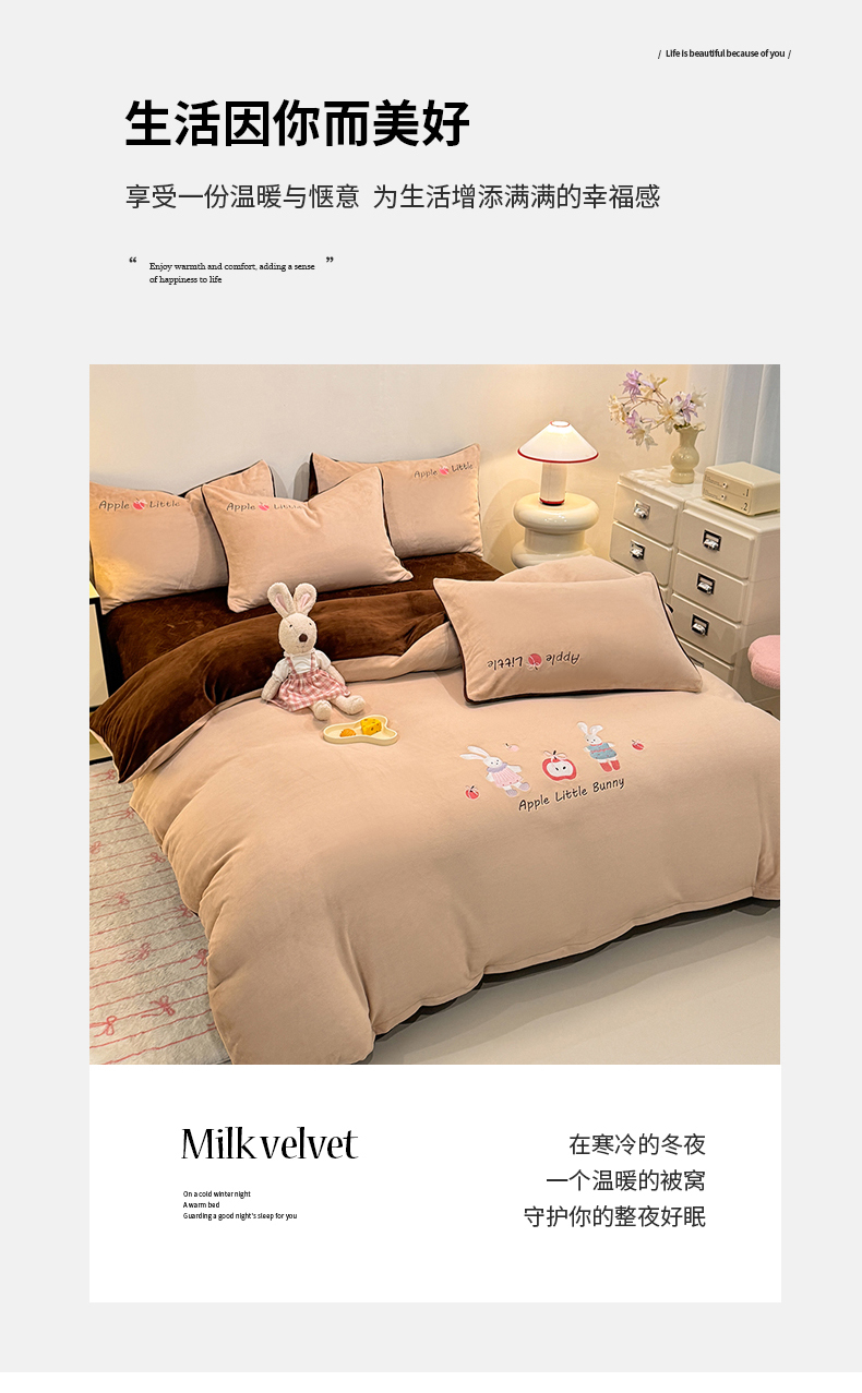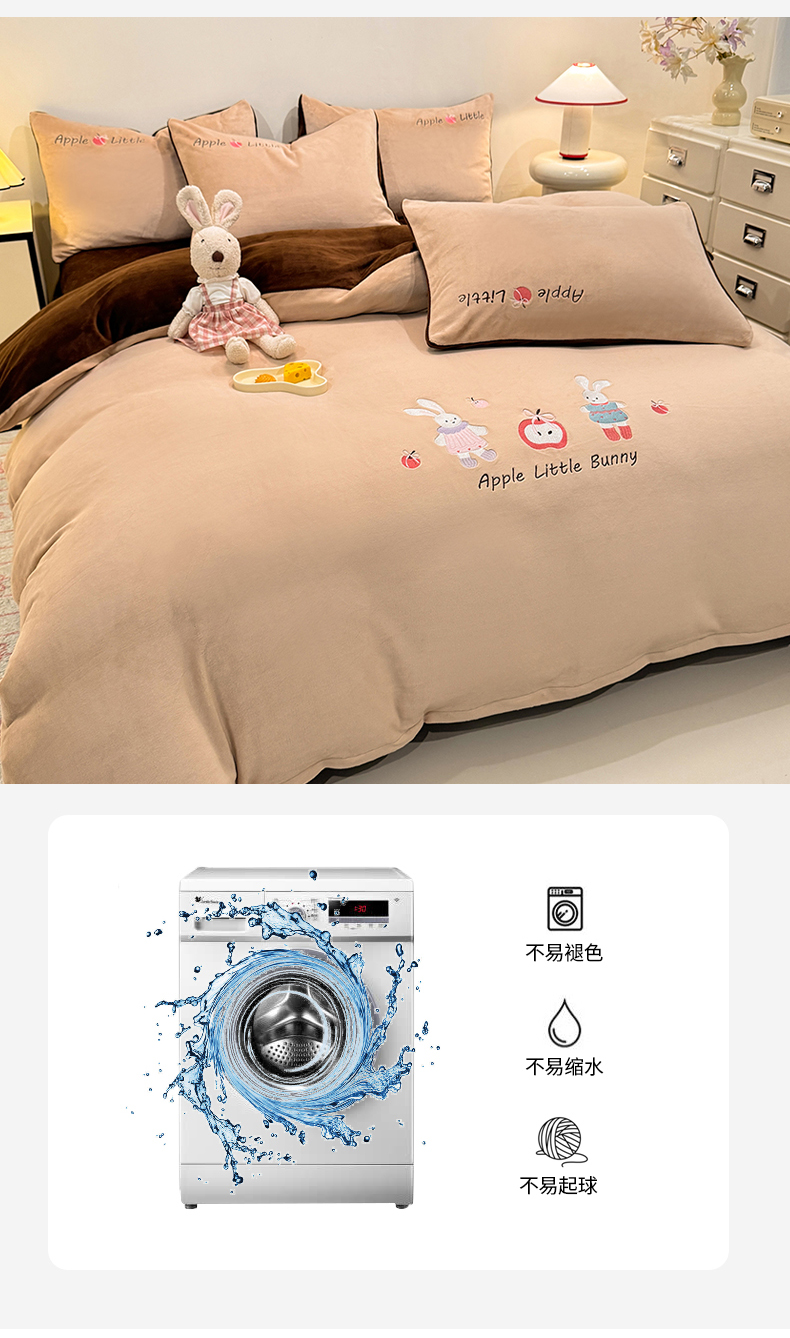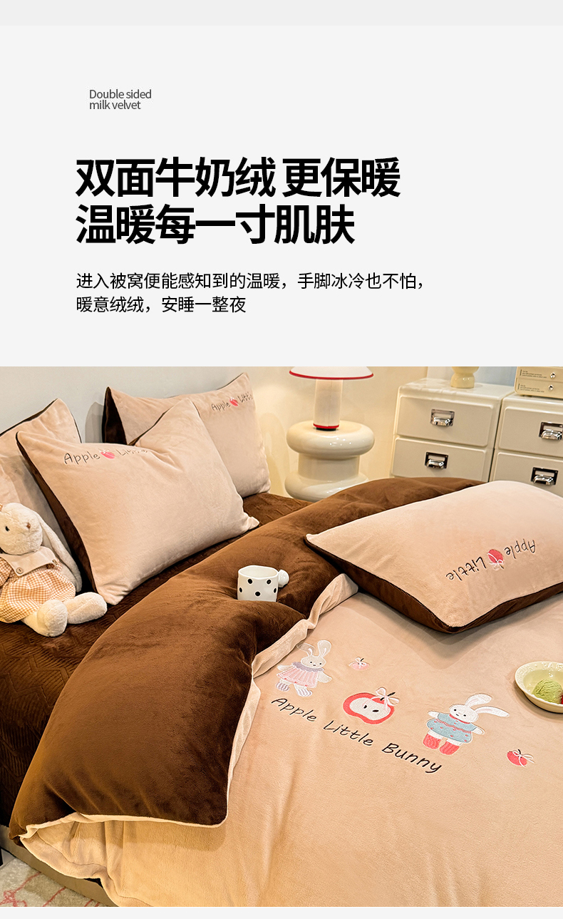 当前位置: 91家纺网 > 商品网购 > 床品套件 > 四件套 > 牛奶绒四件套 > 新方向 2025新款全消光A类刺绣牛奶绒四件套-可爱兔 可爱兔-香槟咖