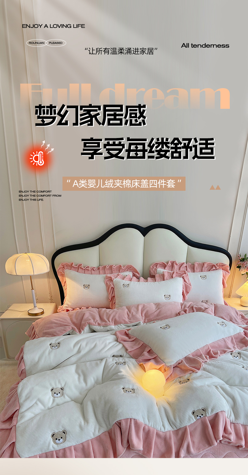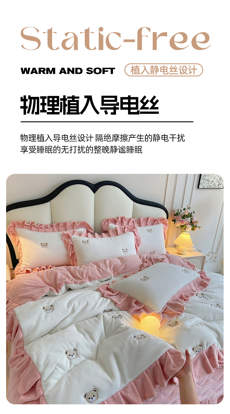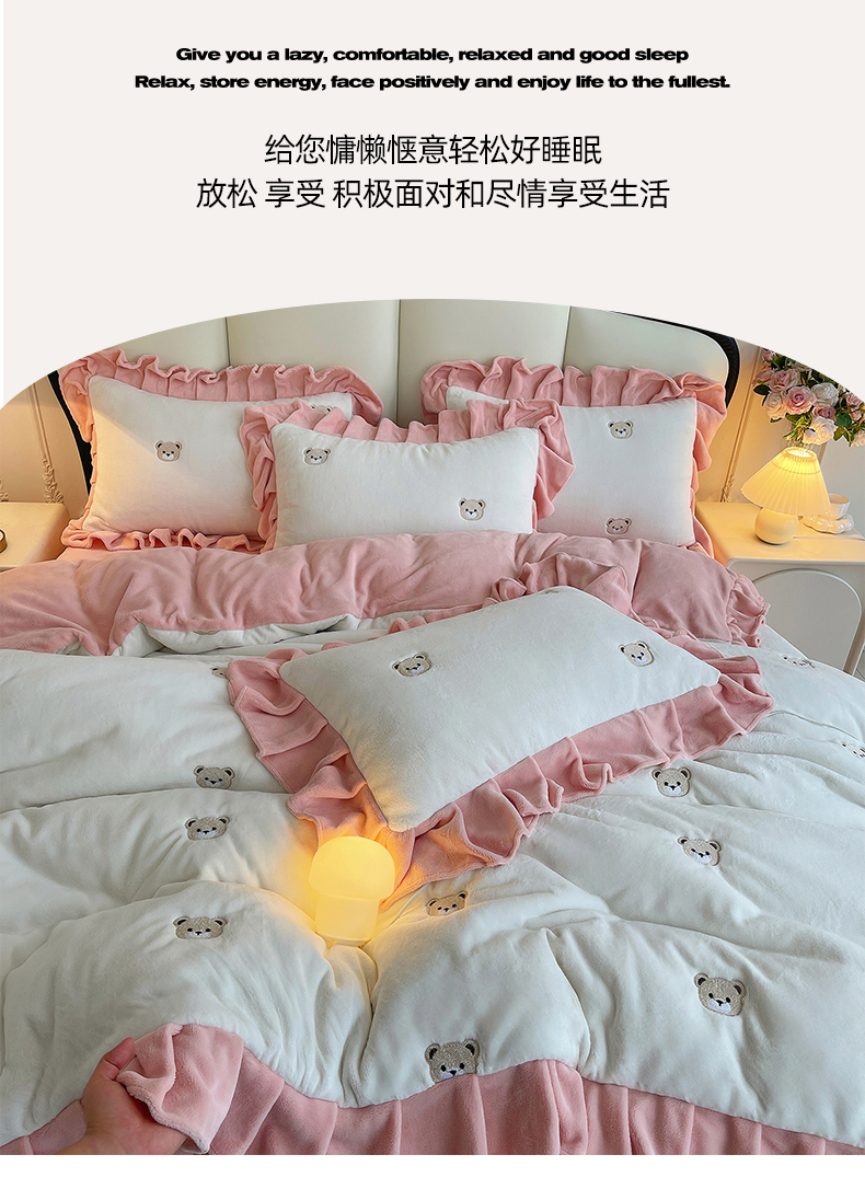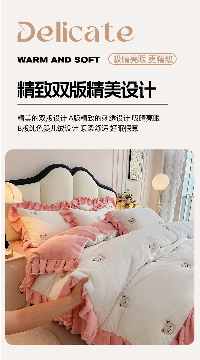 商品名称:茉保家纺 2025新款高克重9.5斤婴儿绒牛奶绒绣花夹棉床盖四件套 小熊-白拼粉