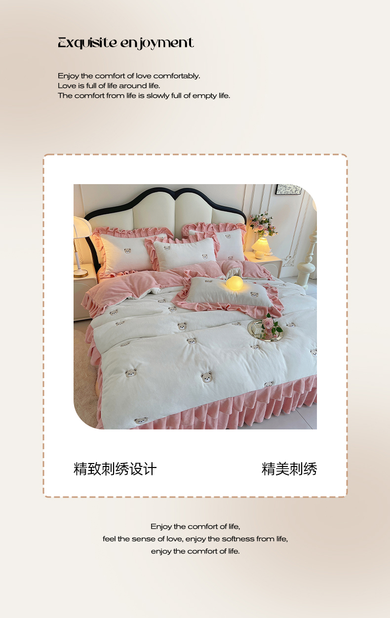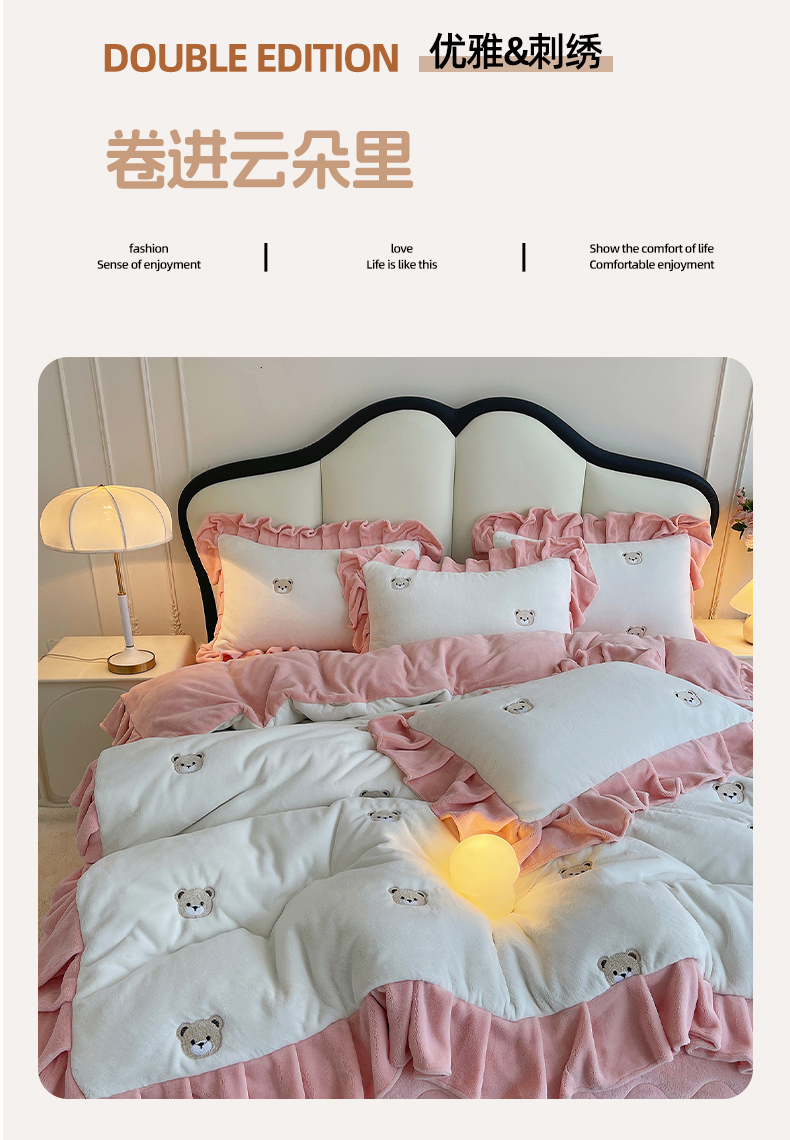 茉保家纺 2025新款高克重9.5斤婴儿绒牛奶绒绣花夹棉床盖四件套 小熊-白拼粉