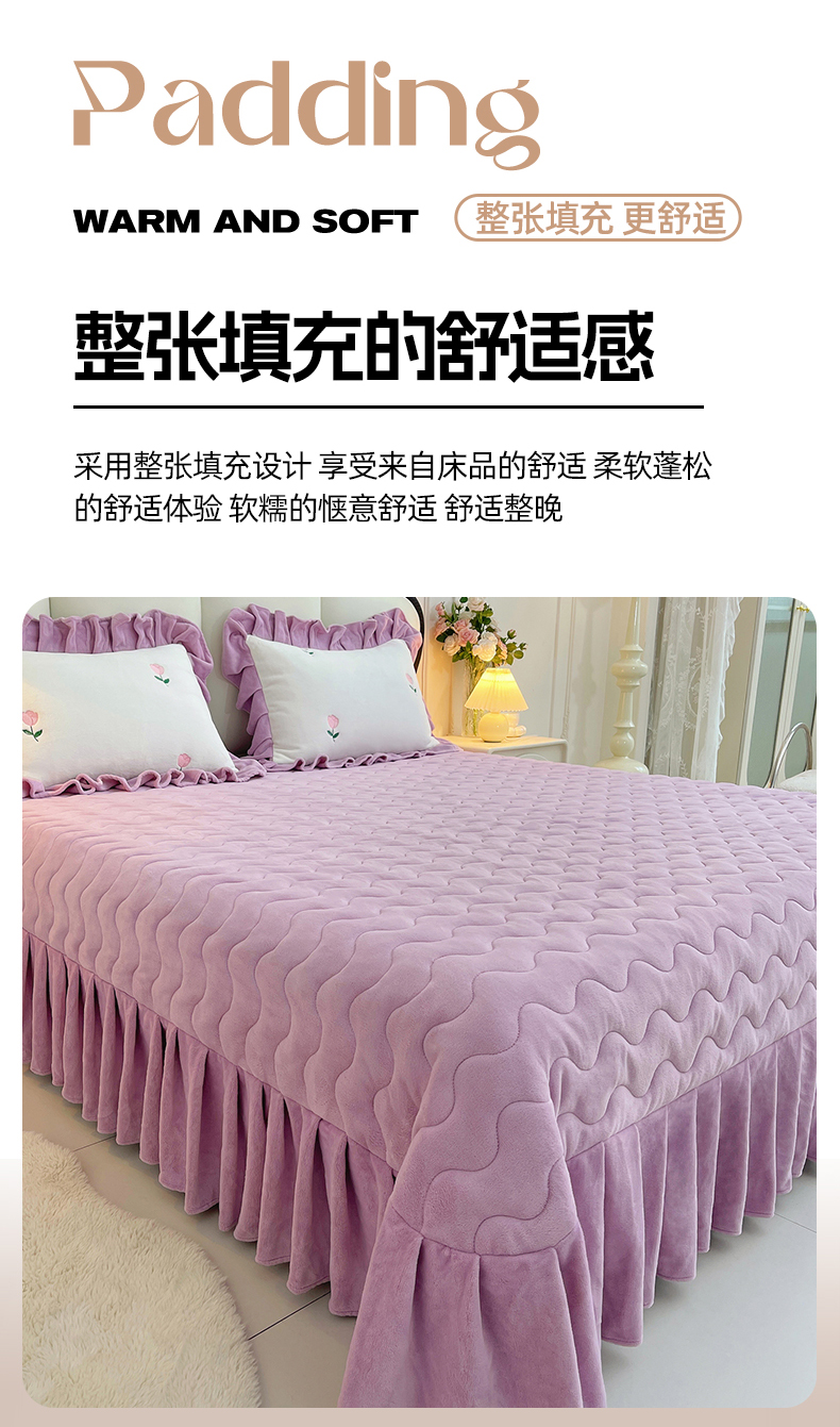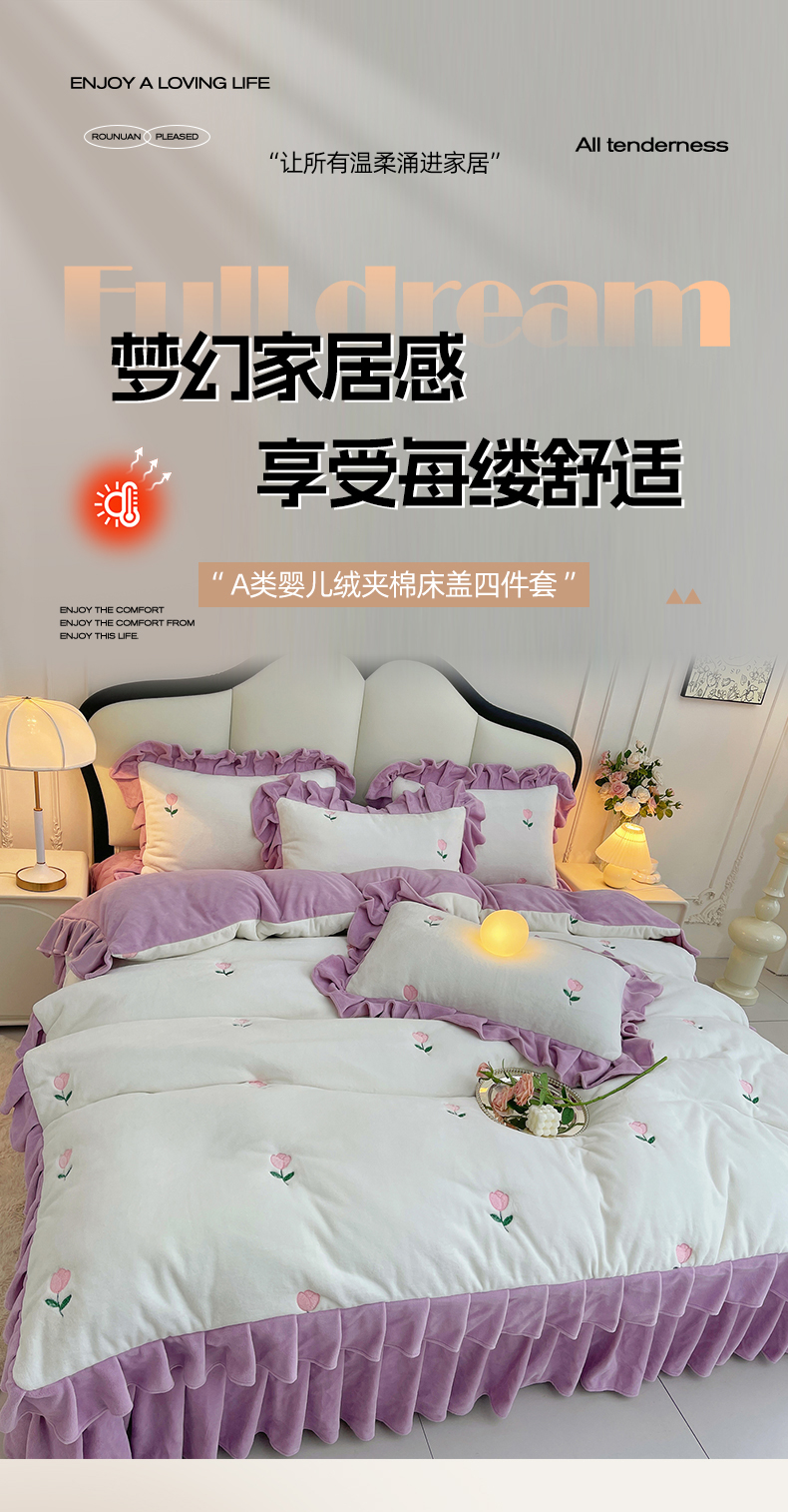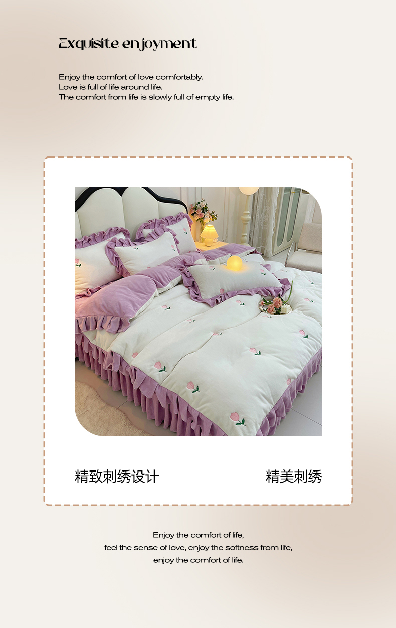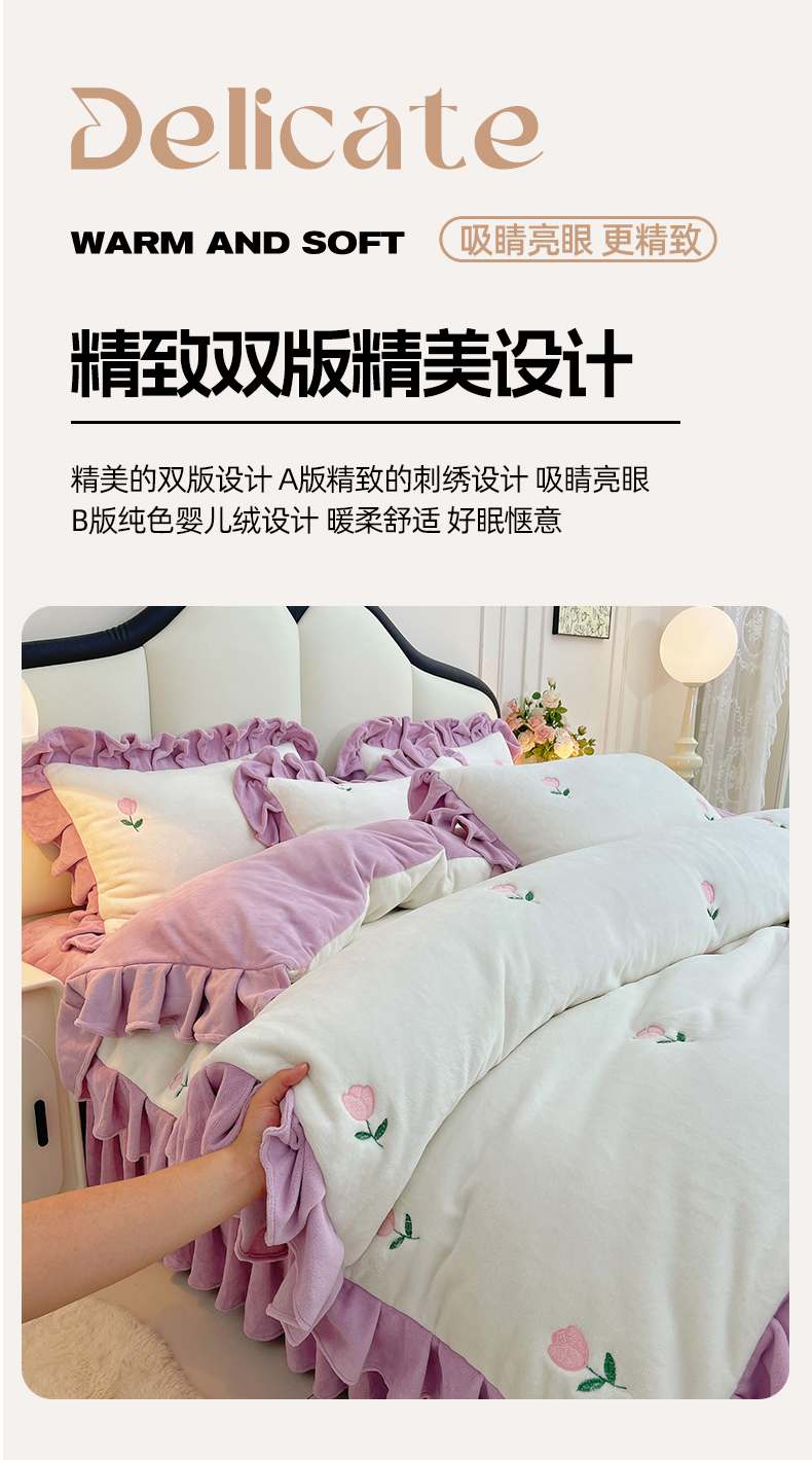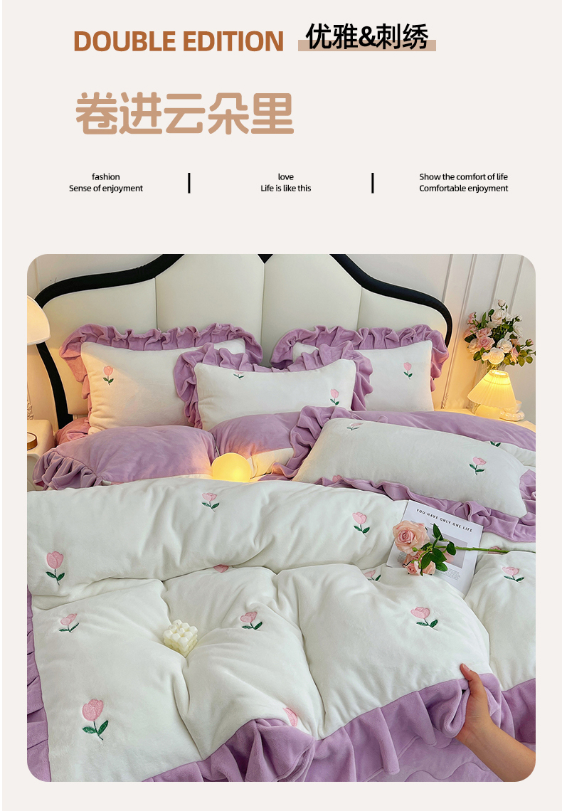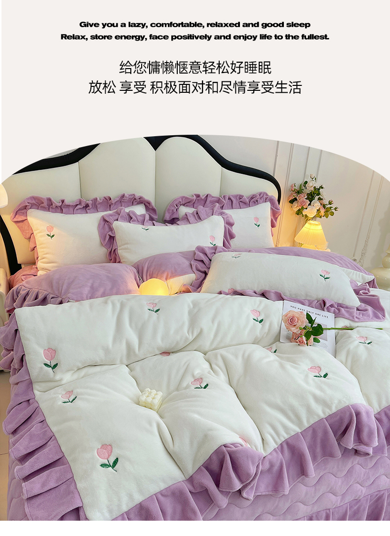 商品名称:茉保家纺 2025新款高克重9.5斤婴儿绒牛奶绒绣花夹棉床盖四件套 郁金香-白拼紫