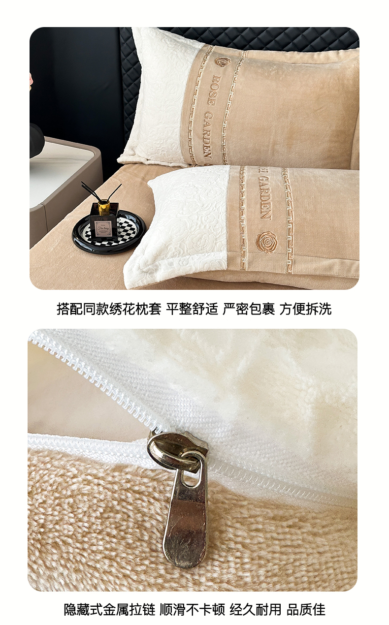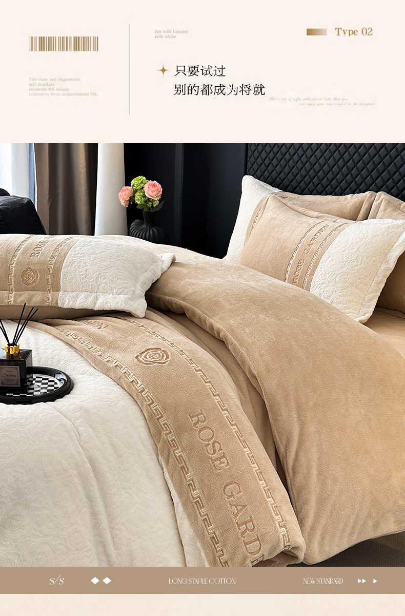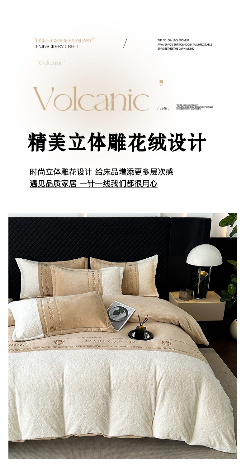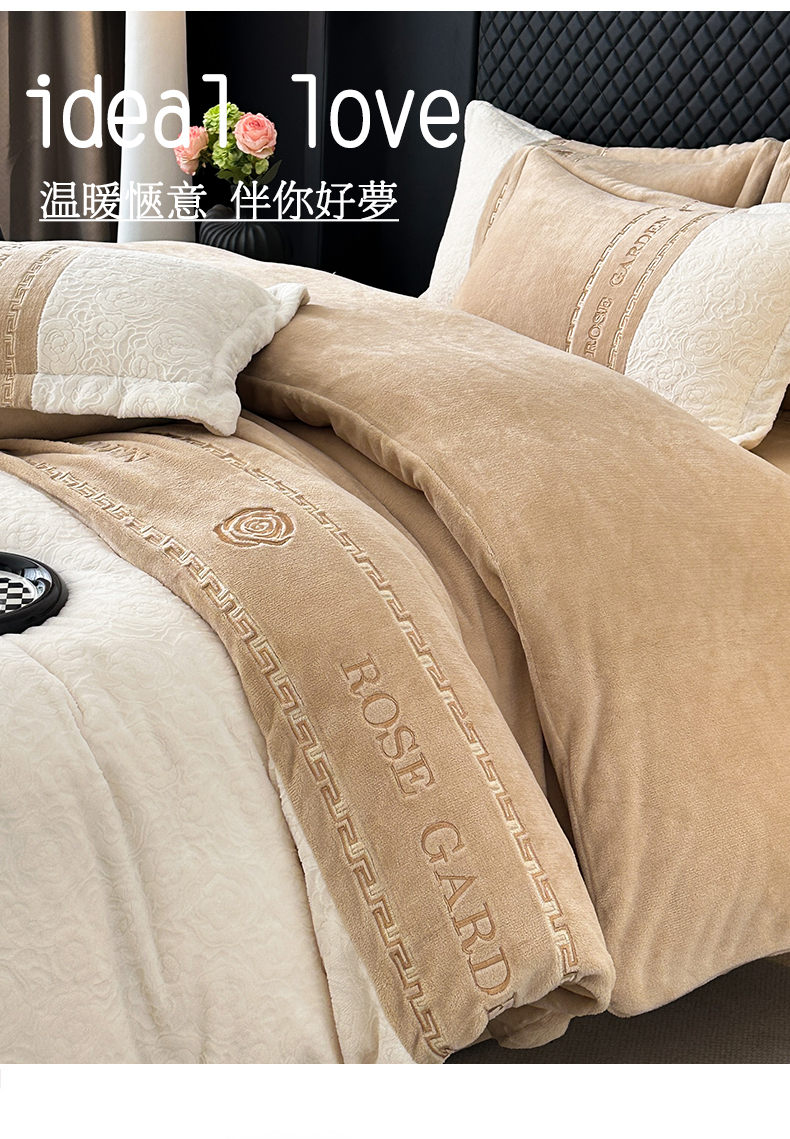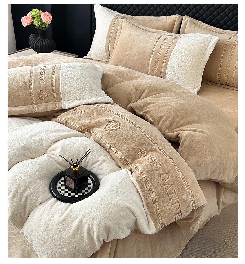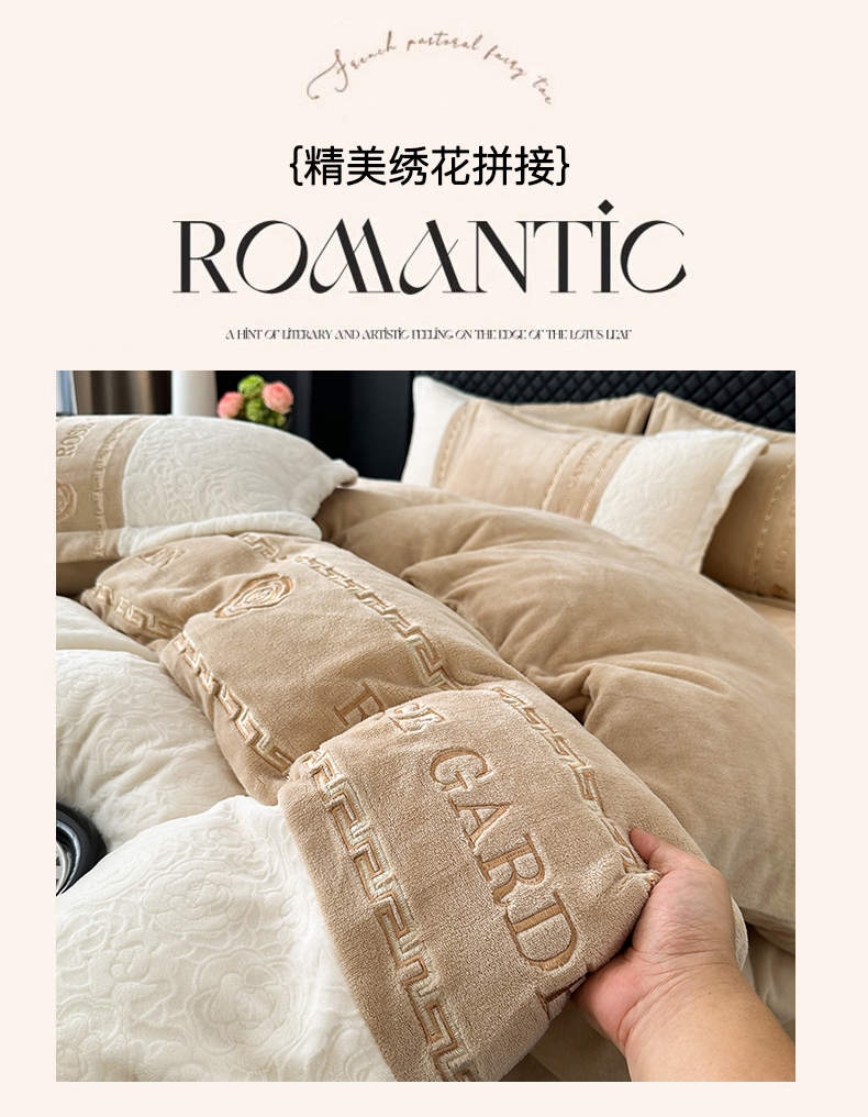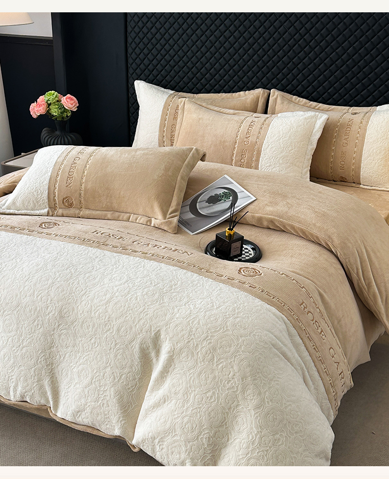 商品名称:沐棉家居 2025新款字母刺绣雕花牛奶绒四件套 花园·奶咖