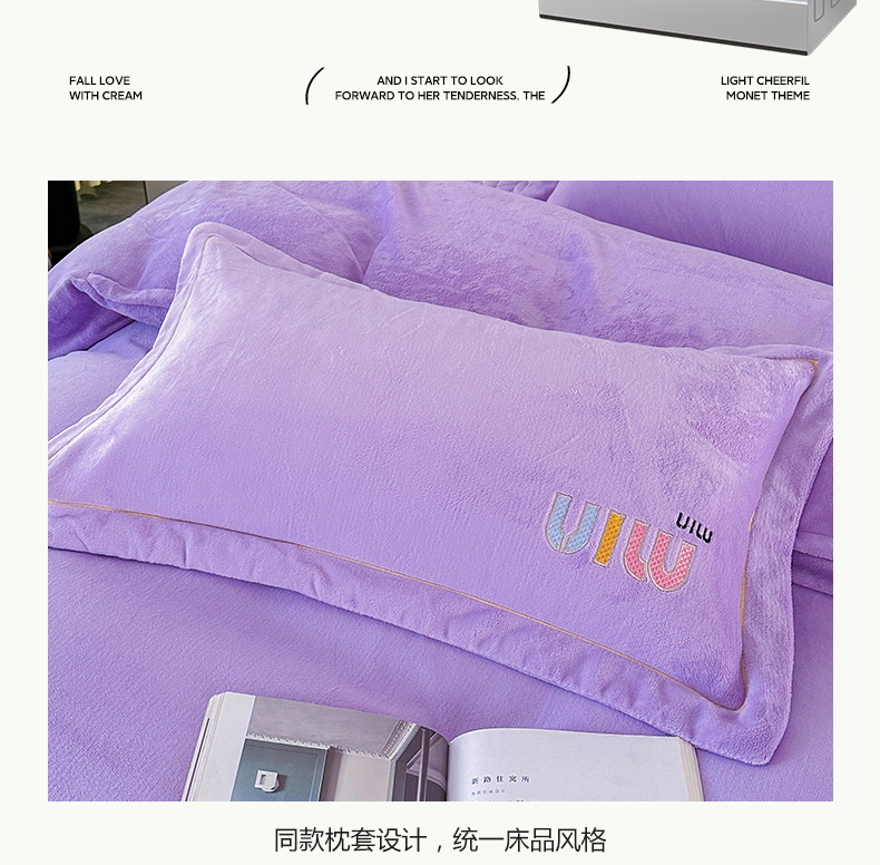 (总)柏薇 2025新款高克重牛奶绒绣花床盖四件套-缪系列,豆沙色,粉色,灰色,梦幻紫,奶蓝色,清新绿