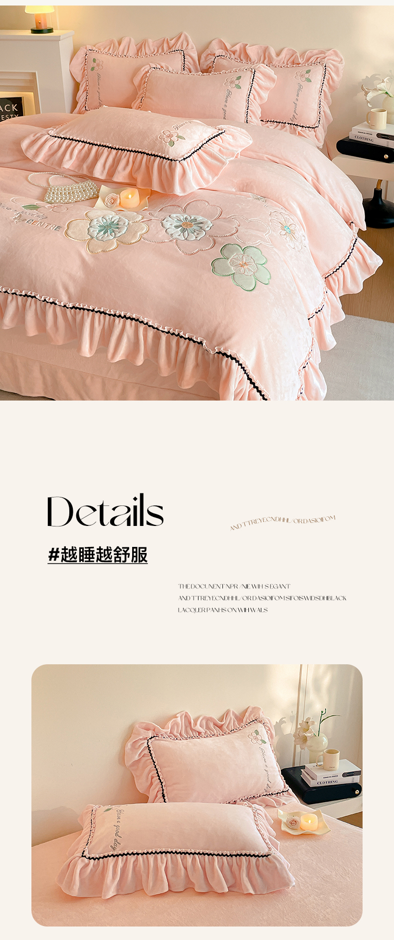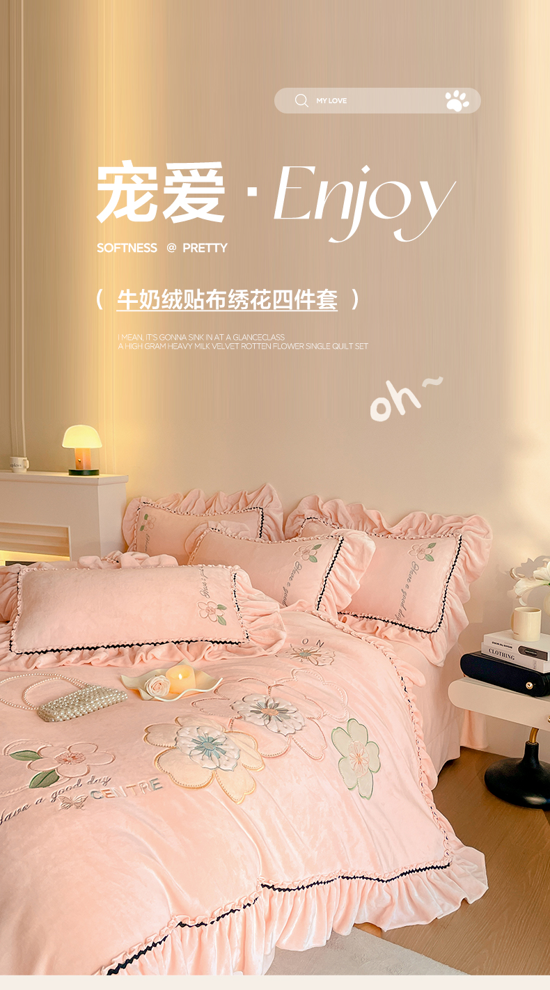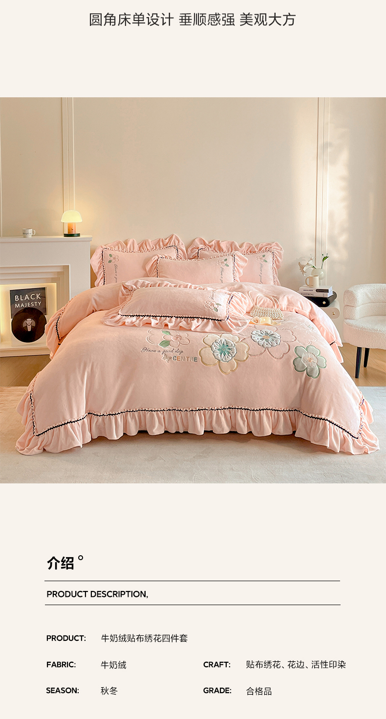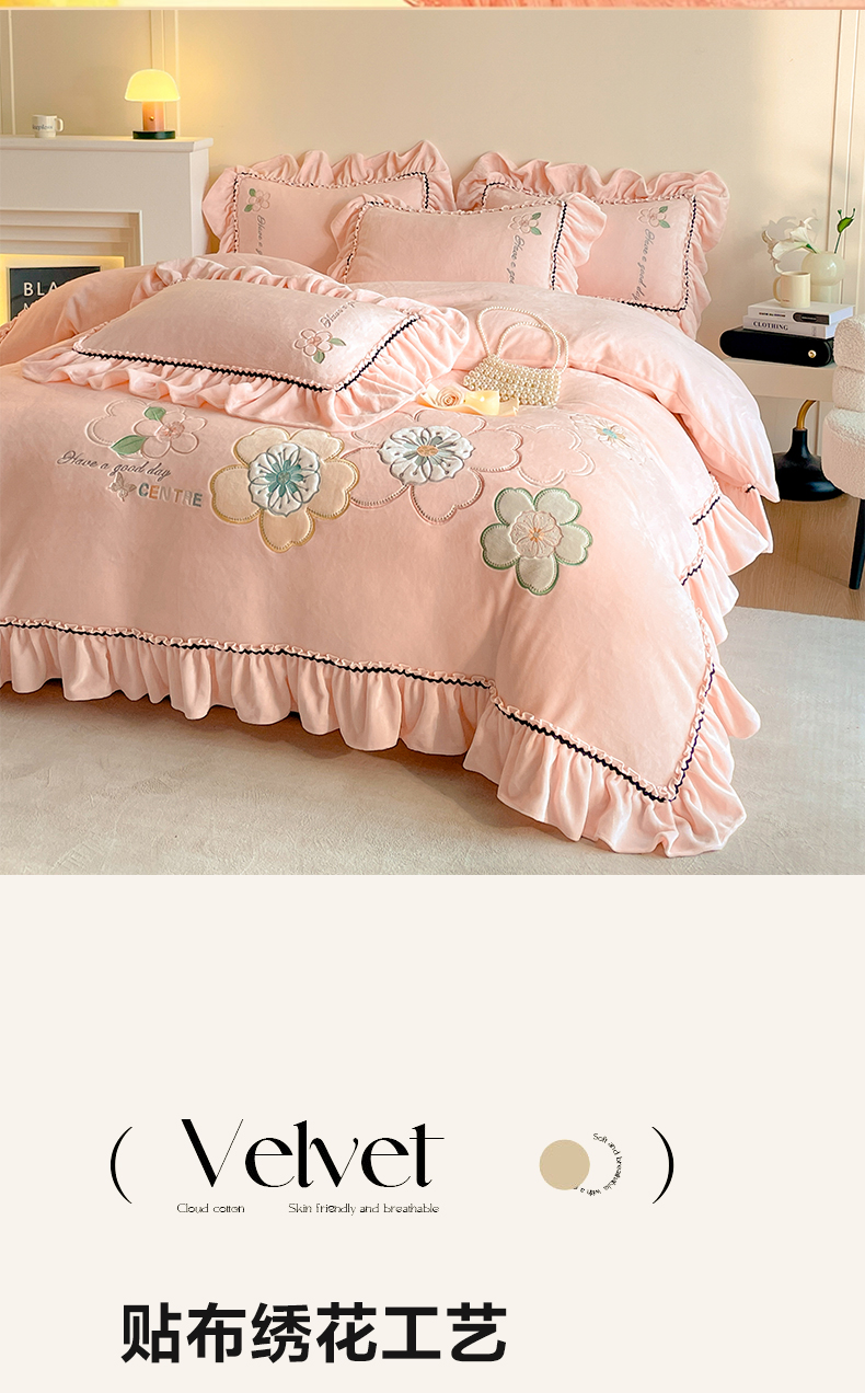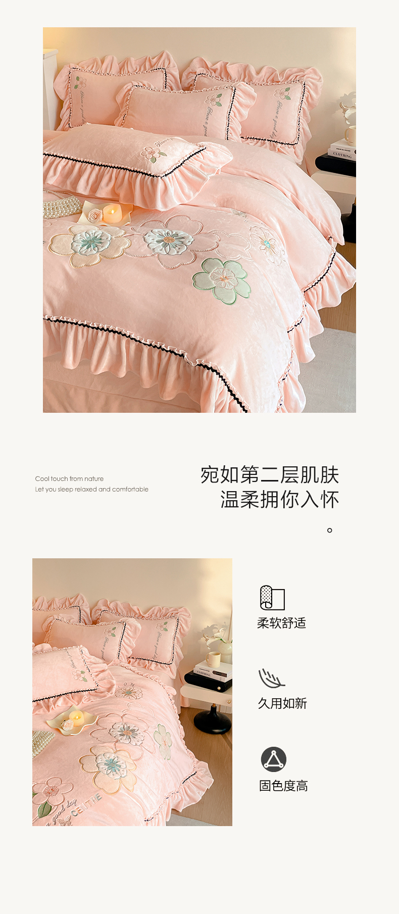 商品名称:民新家纺 2025新款牛奶绒毛巾绣贴布绣花四件套 花韵-樱花粉
