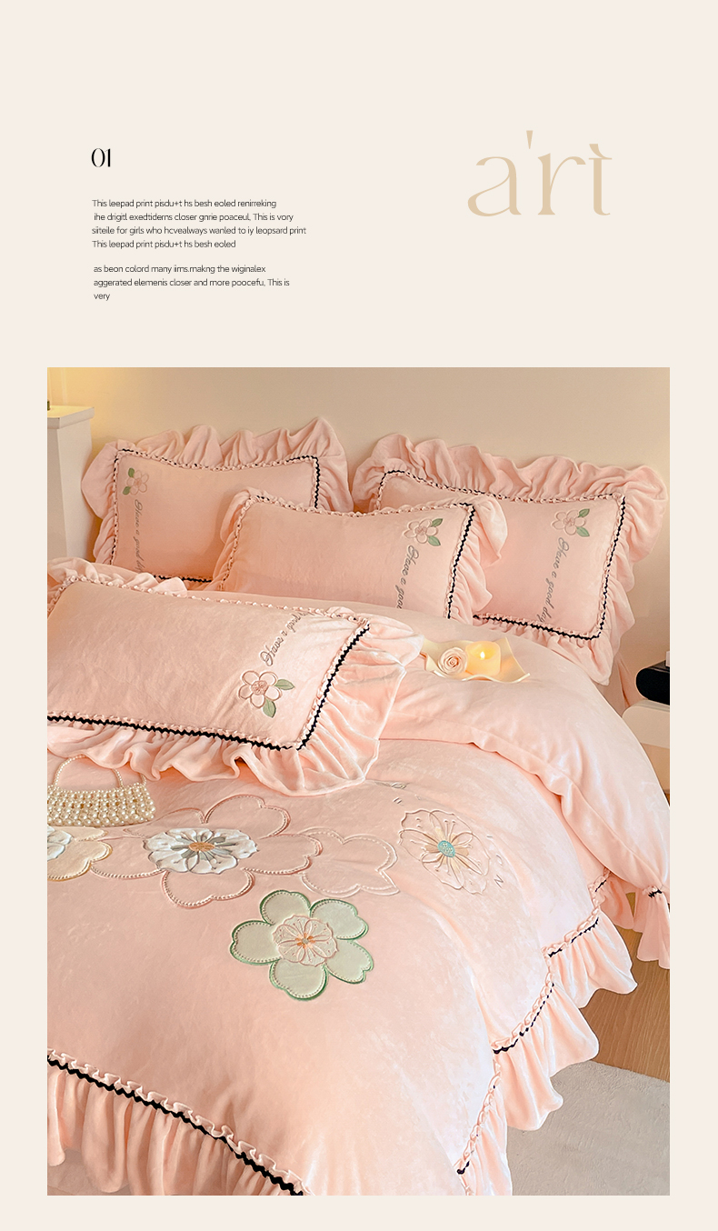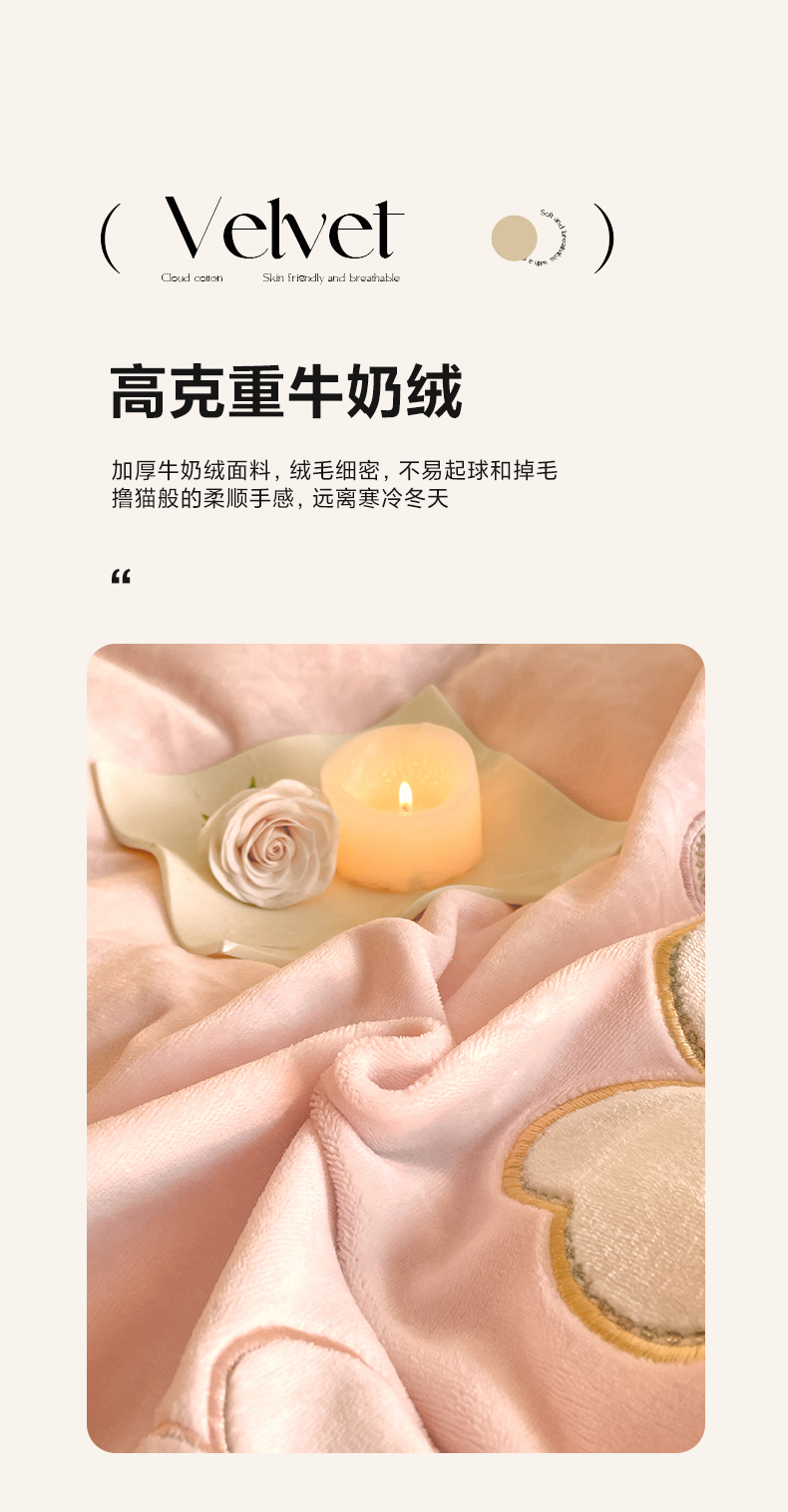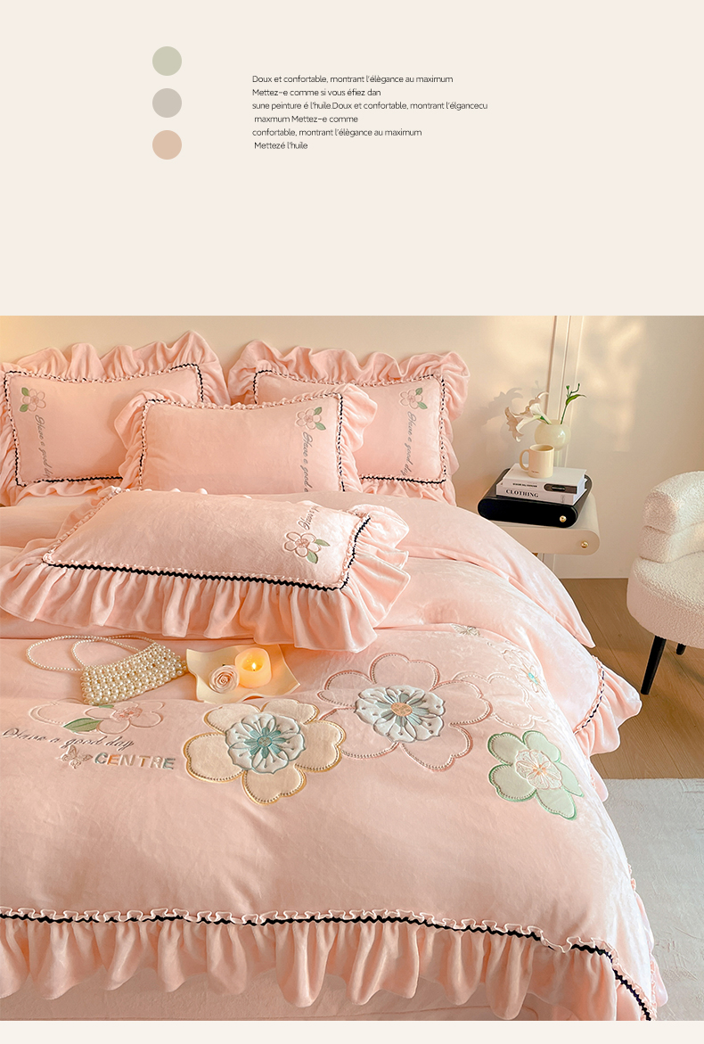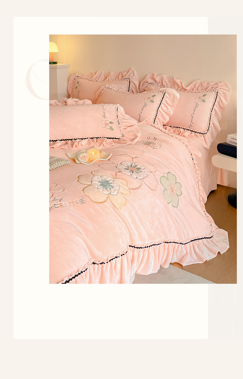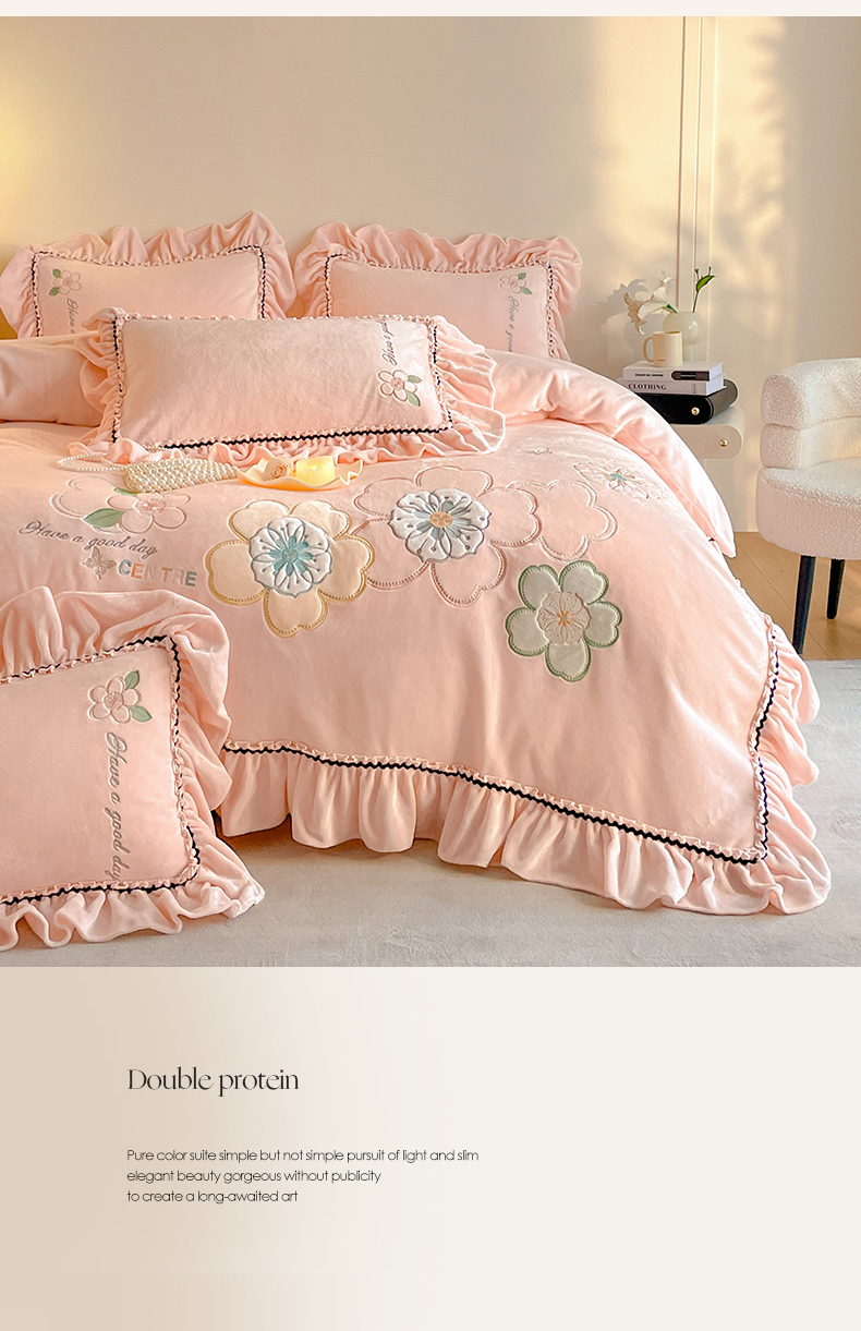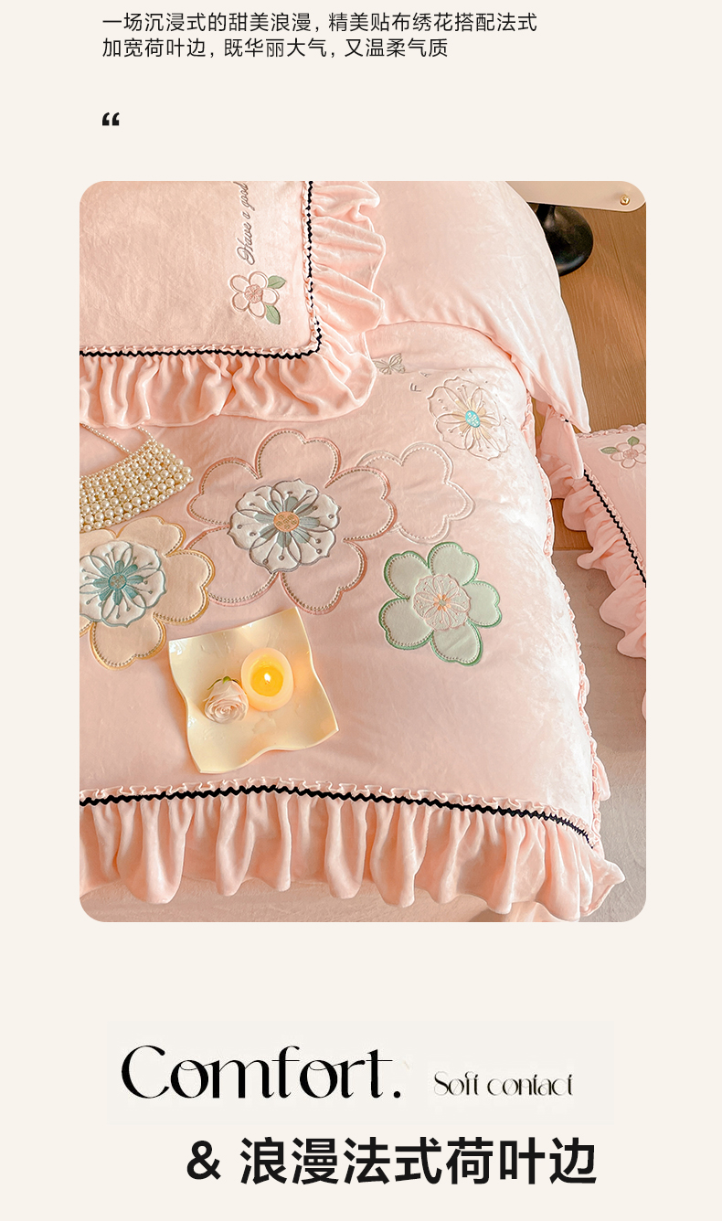 商品名称:民新家纺 2025新款牛奶绒毛巾绣贴布绣花四件套 花韵-樱花粉