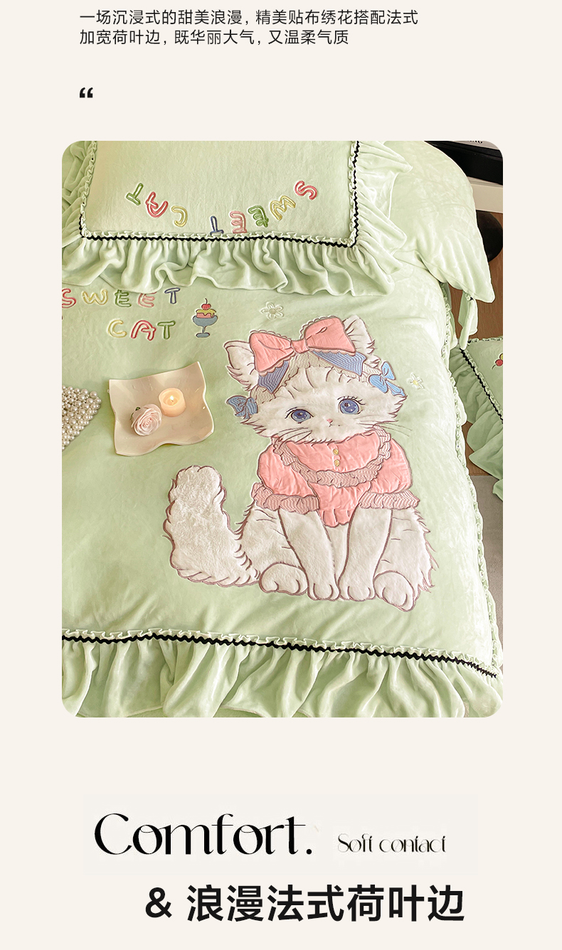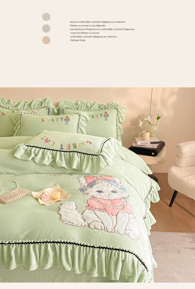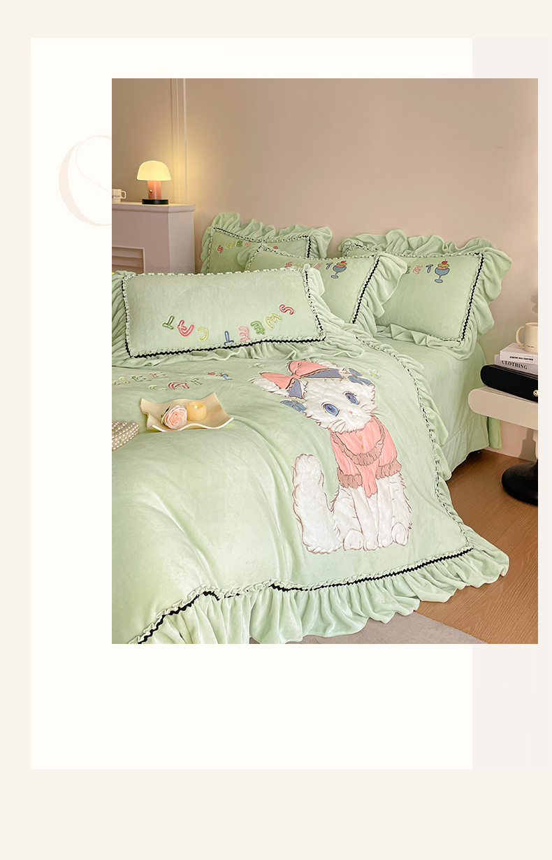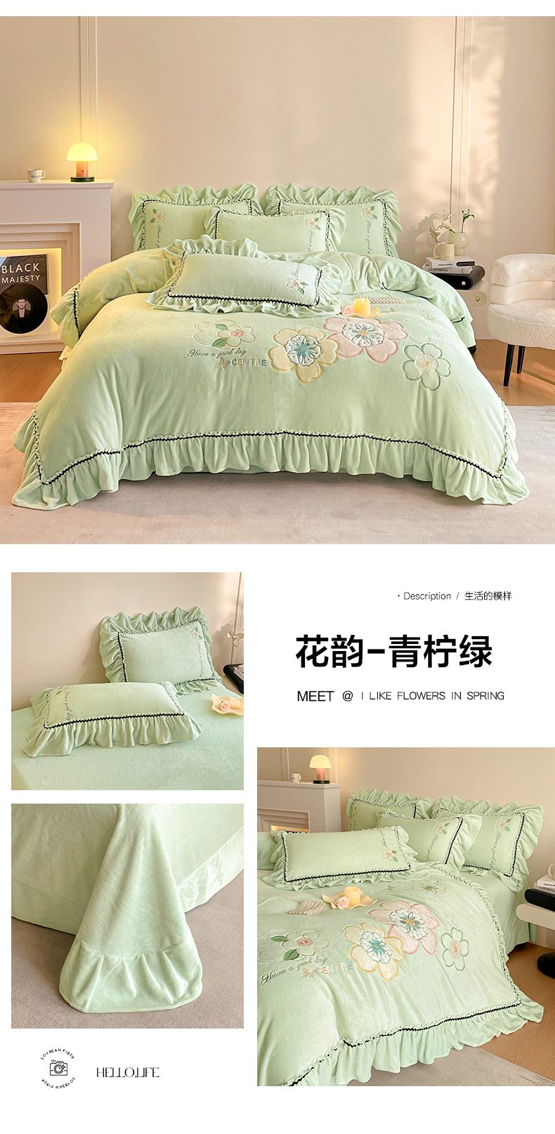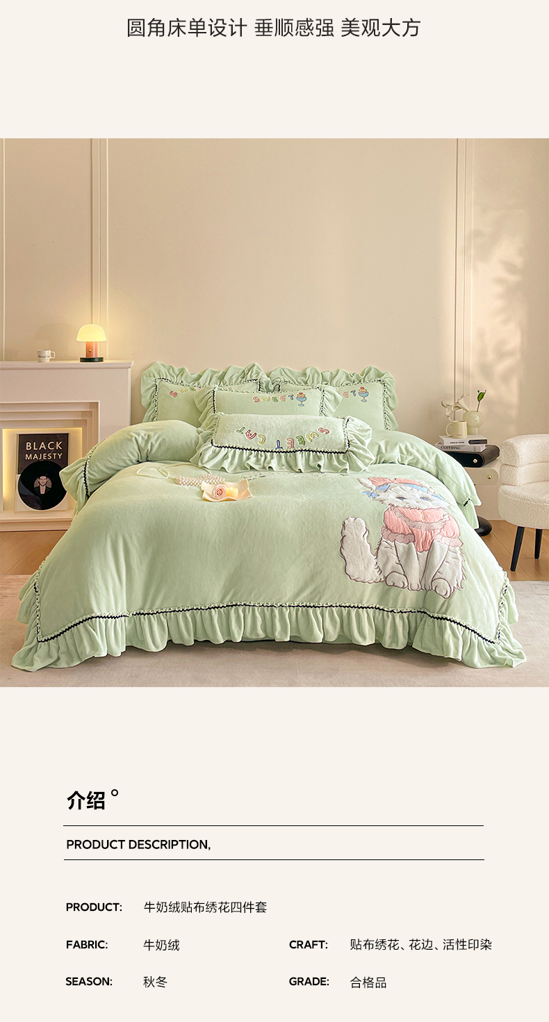 商品名称:民新家纺 2025新款牛奶绒毛巾绣贴布绣花四件套 蜜语-青柠绿