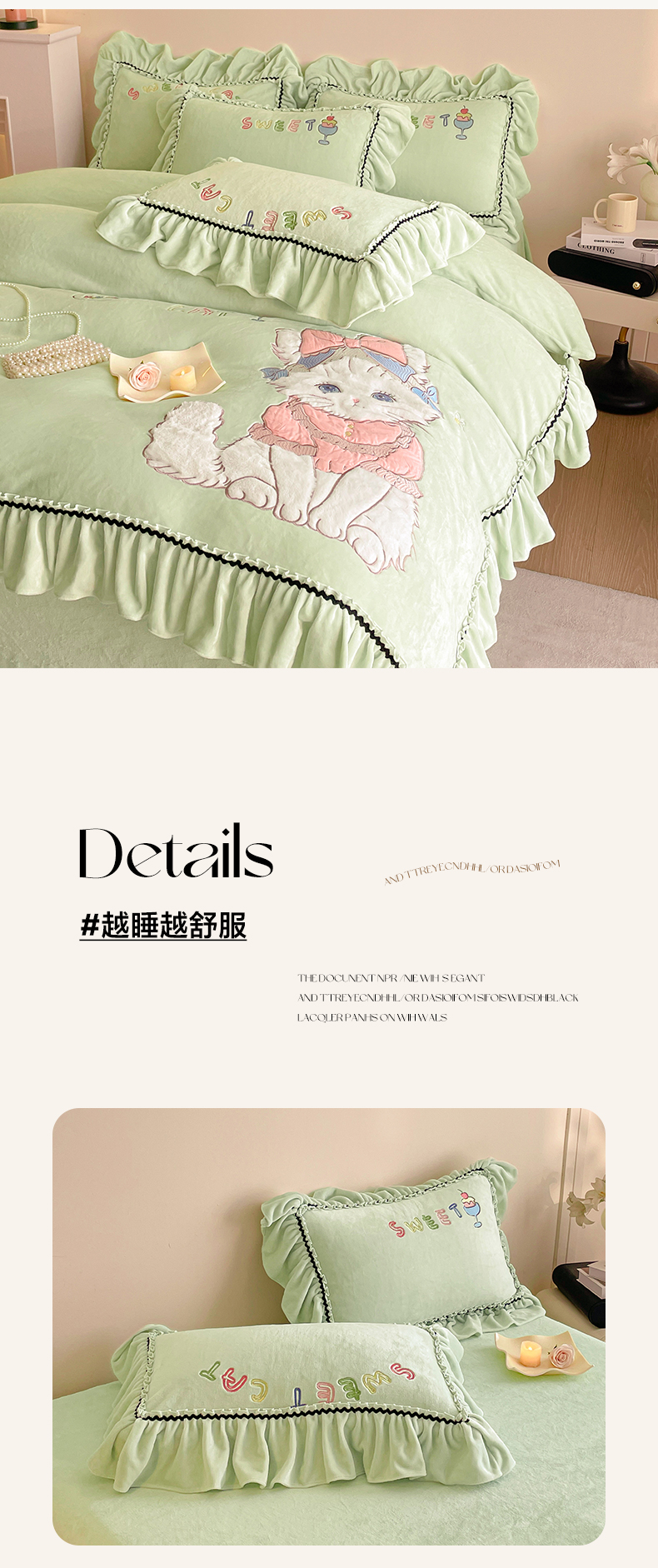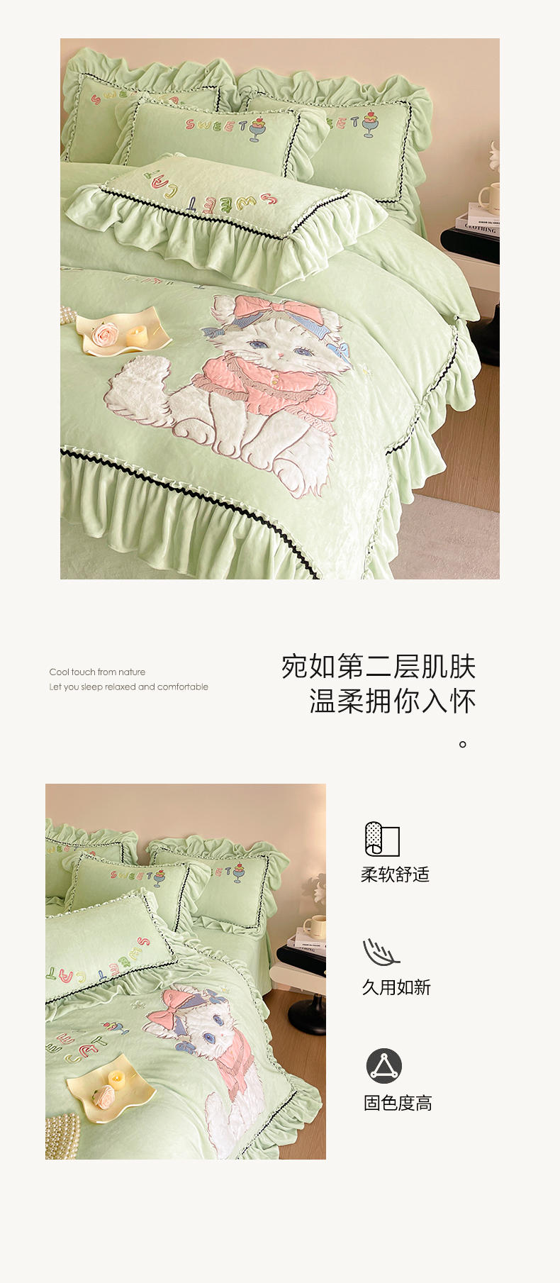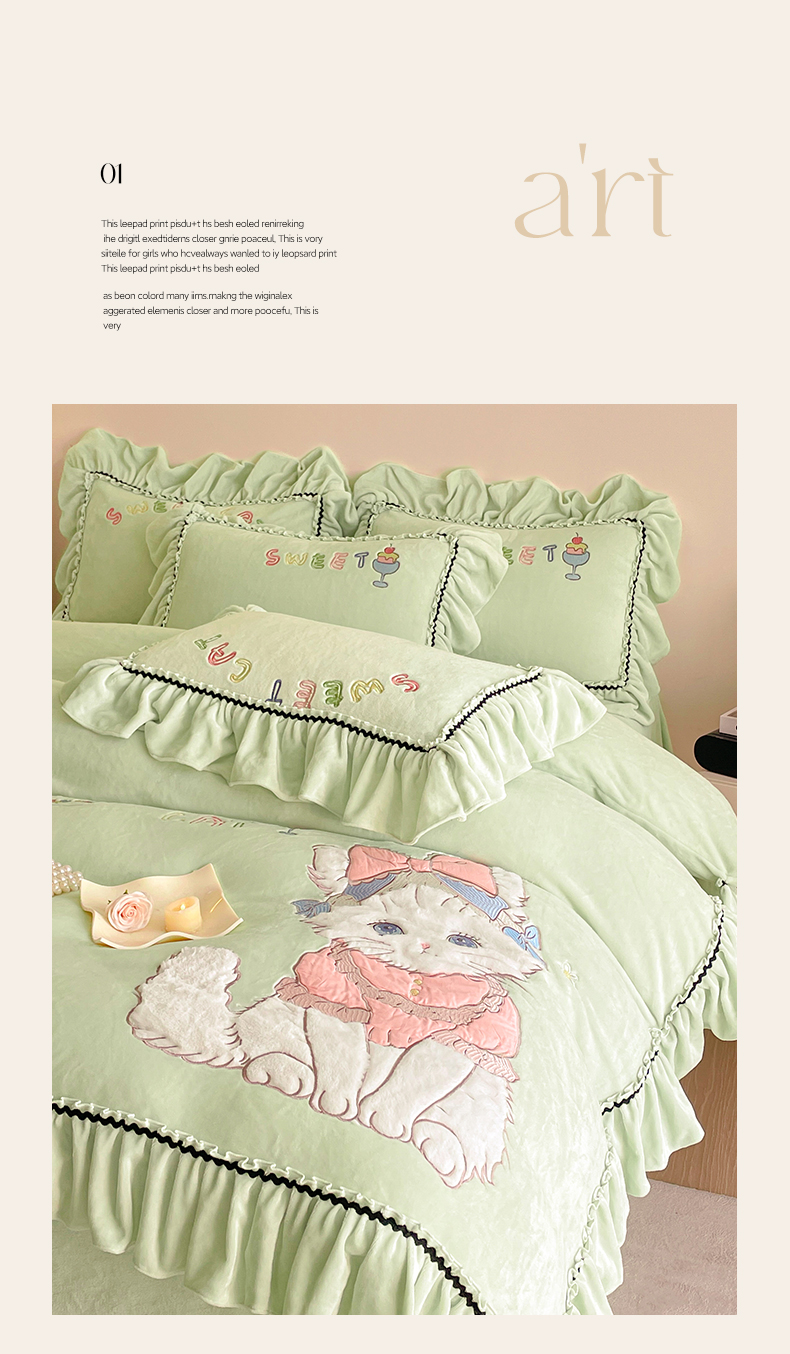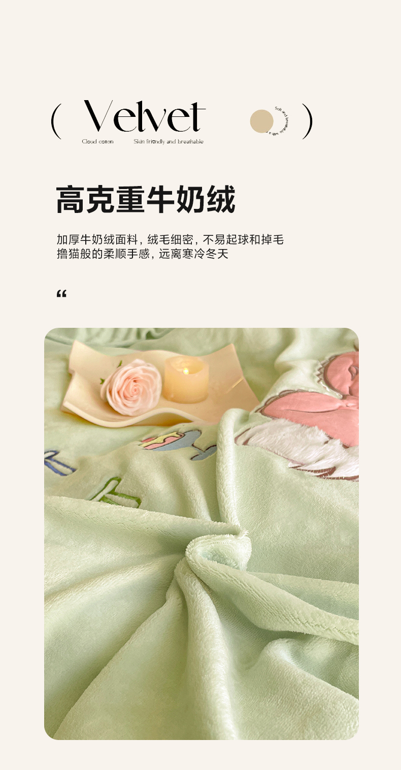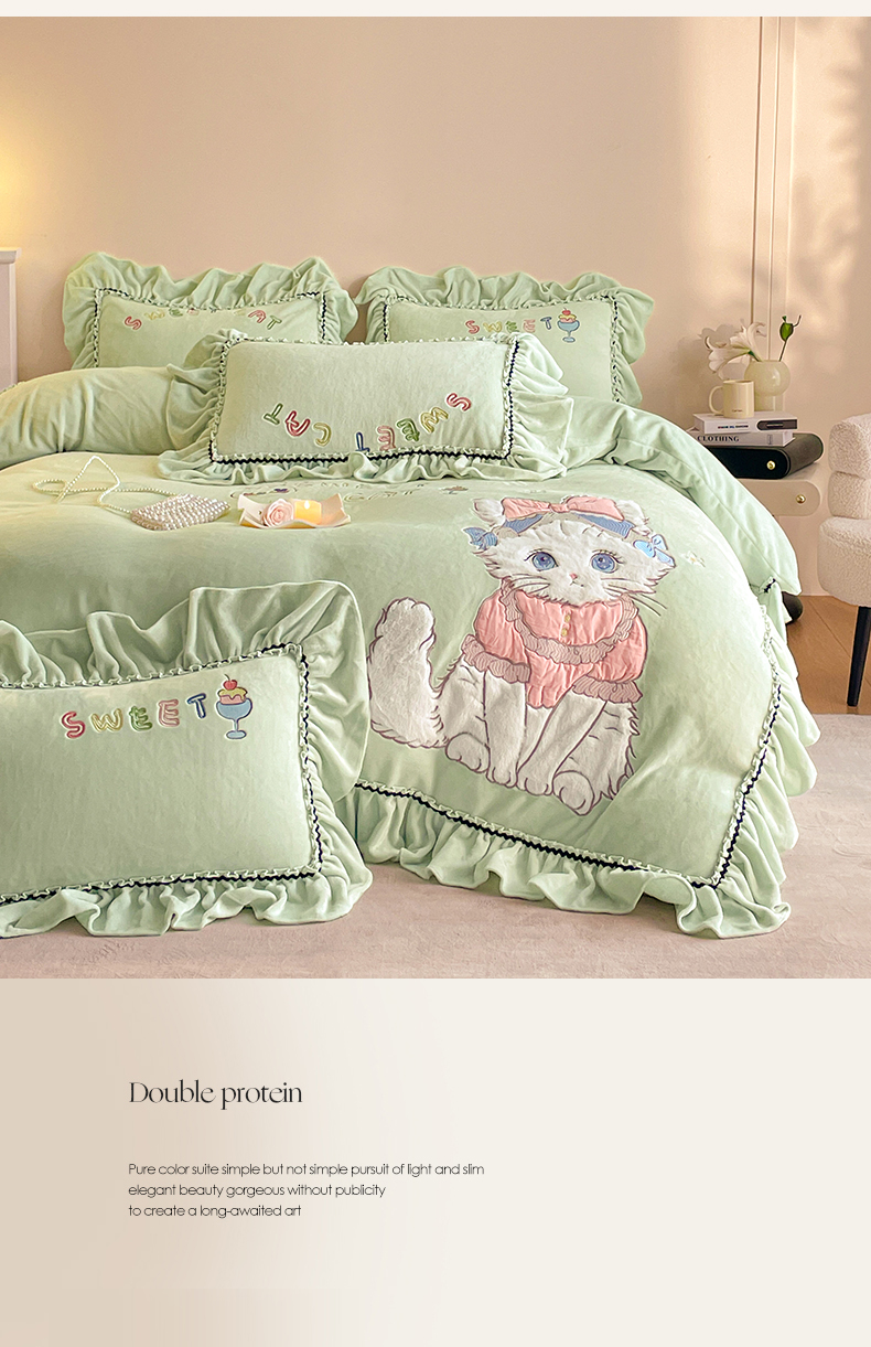 商品名称:民新家纺 2025新款牛奶绒毛巾绣贴布绣花四件套 蜜语-青柠绿