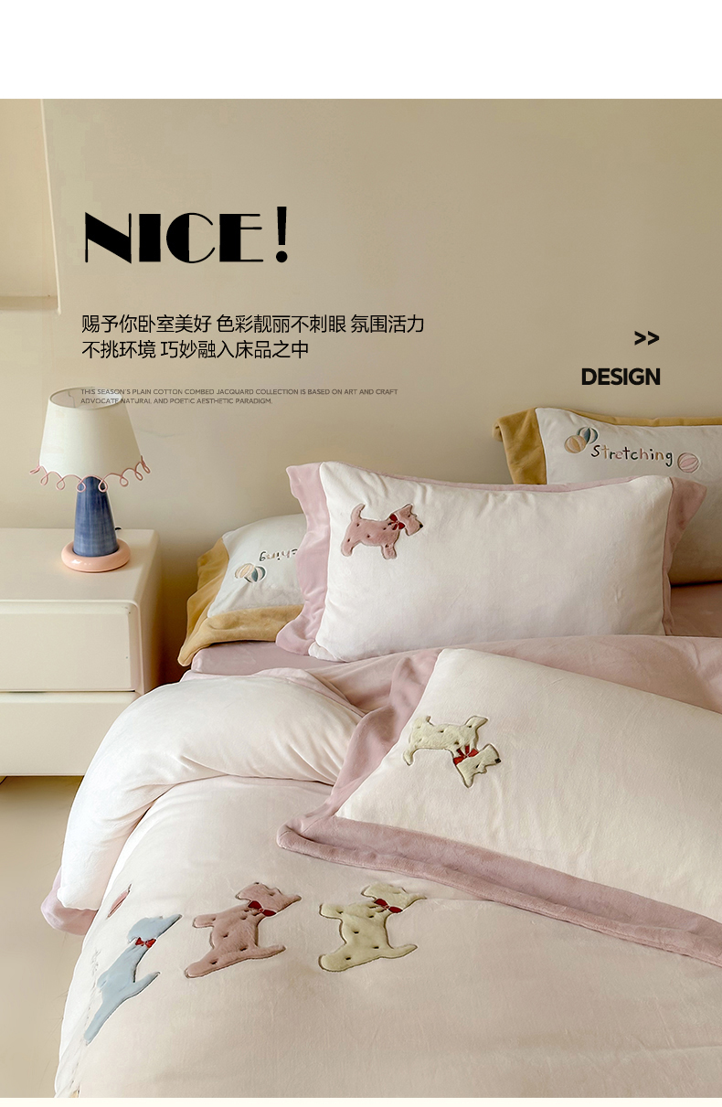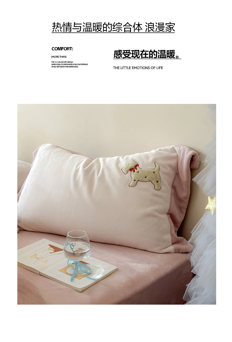 商品名称:泽西家纺+V17798841158发大图 2025新品秋冬加厚保暖240克奶肤绒宽边卡通牛奶绒四件套 奶萌小狗-粉色
