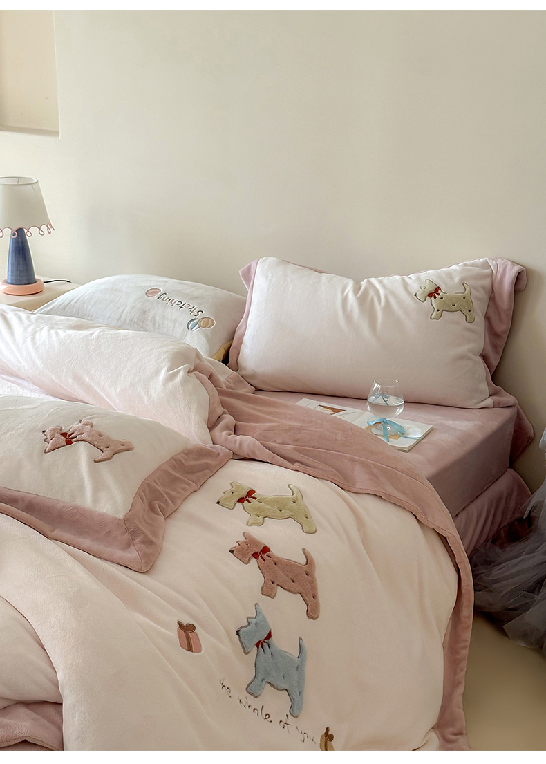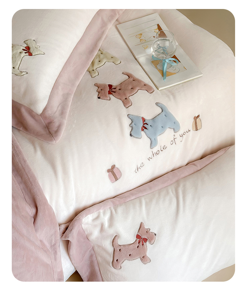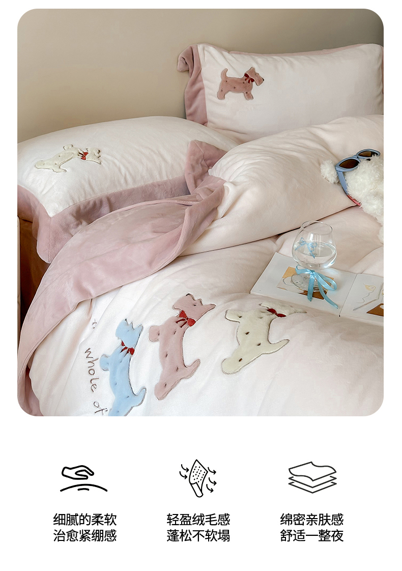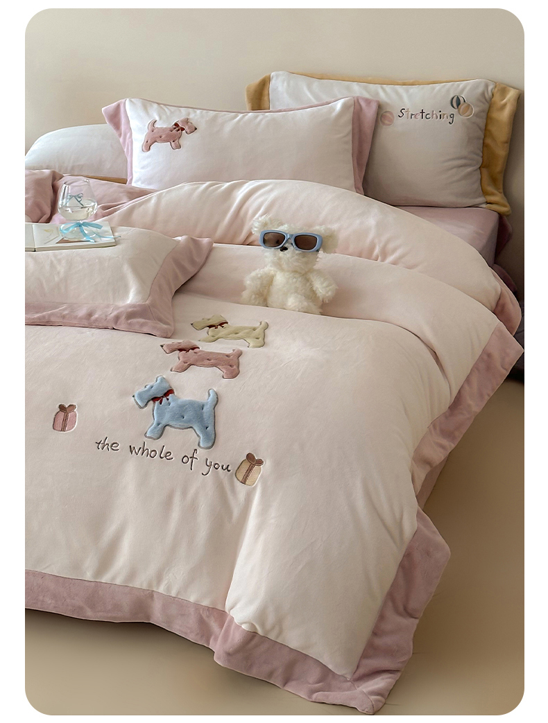 泽西家纺+V17798841158发大图 2025新品秋冬加厚保暖240克奶肤绒宽边卡通牛奶绒四件套 奶萌小狗-粉色
