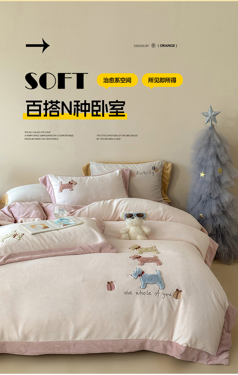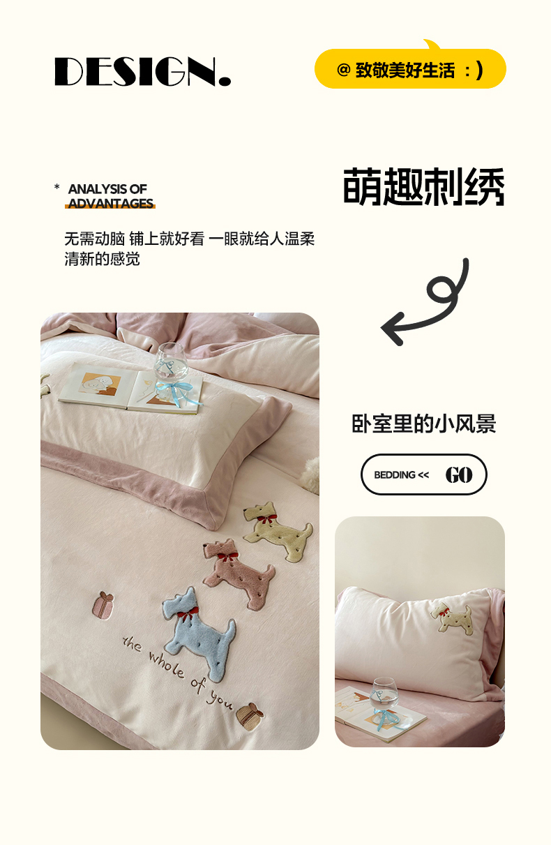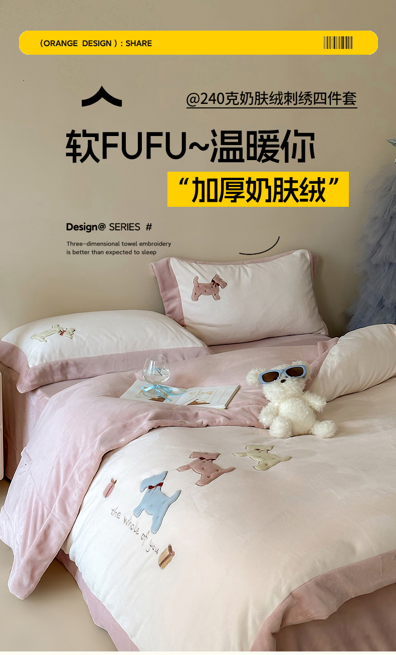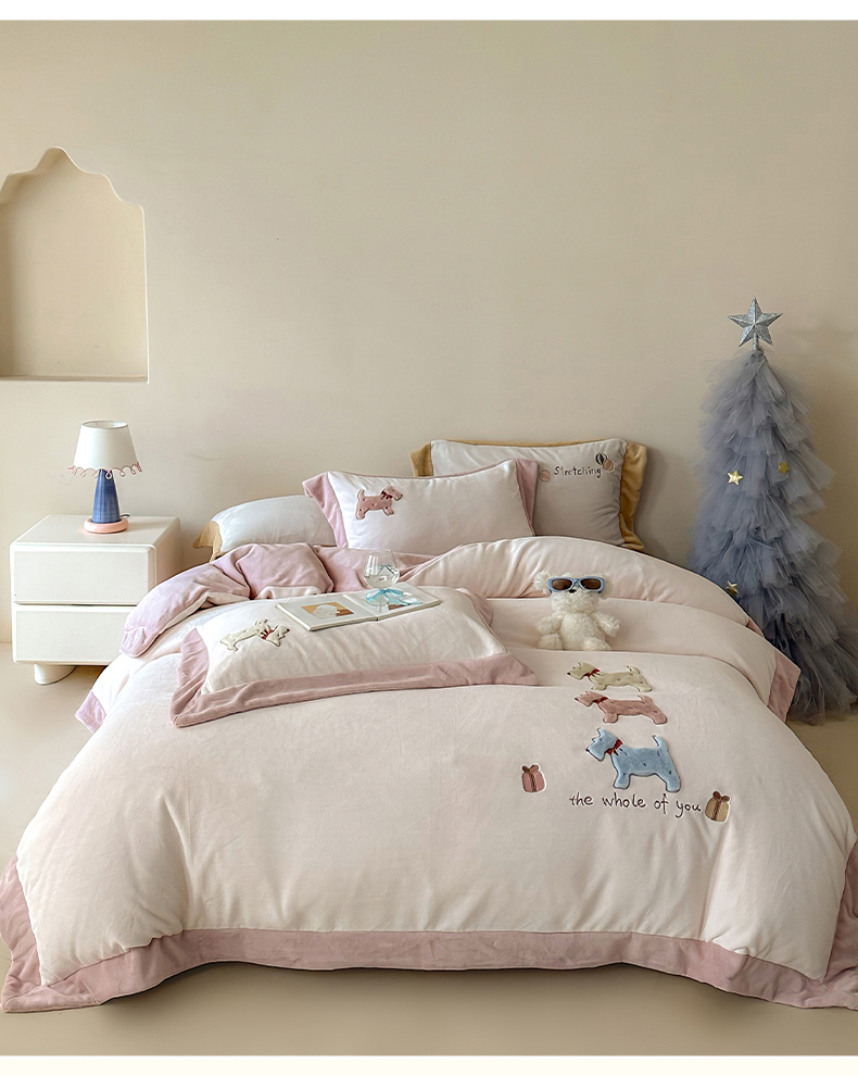 泽西家纺+V17798841158发大图 2025新品秋冬加厚保暖240克奶肤绒宽边卡通牛奶绒四件套 奶萌小狗-粉色