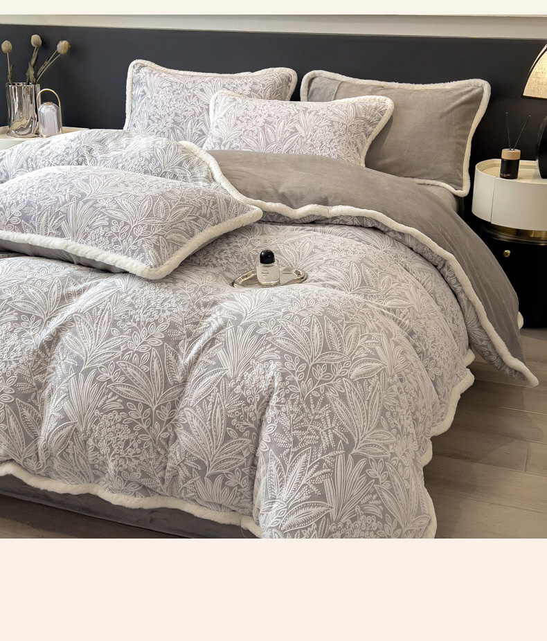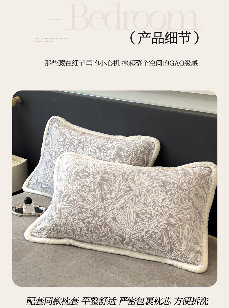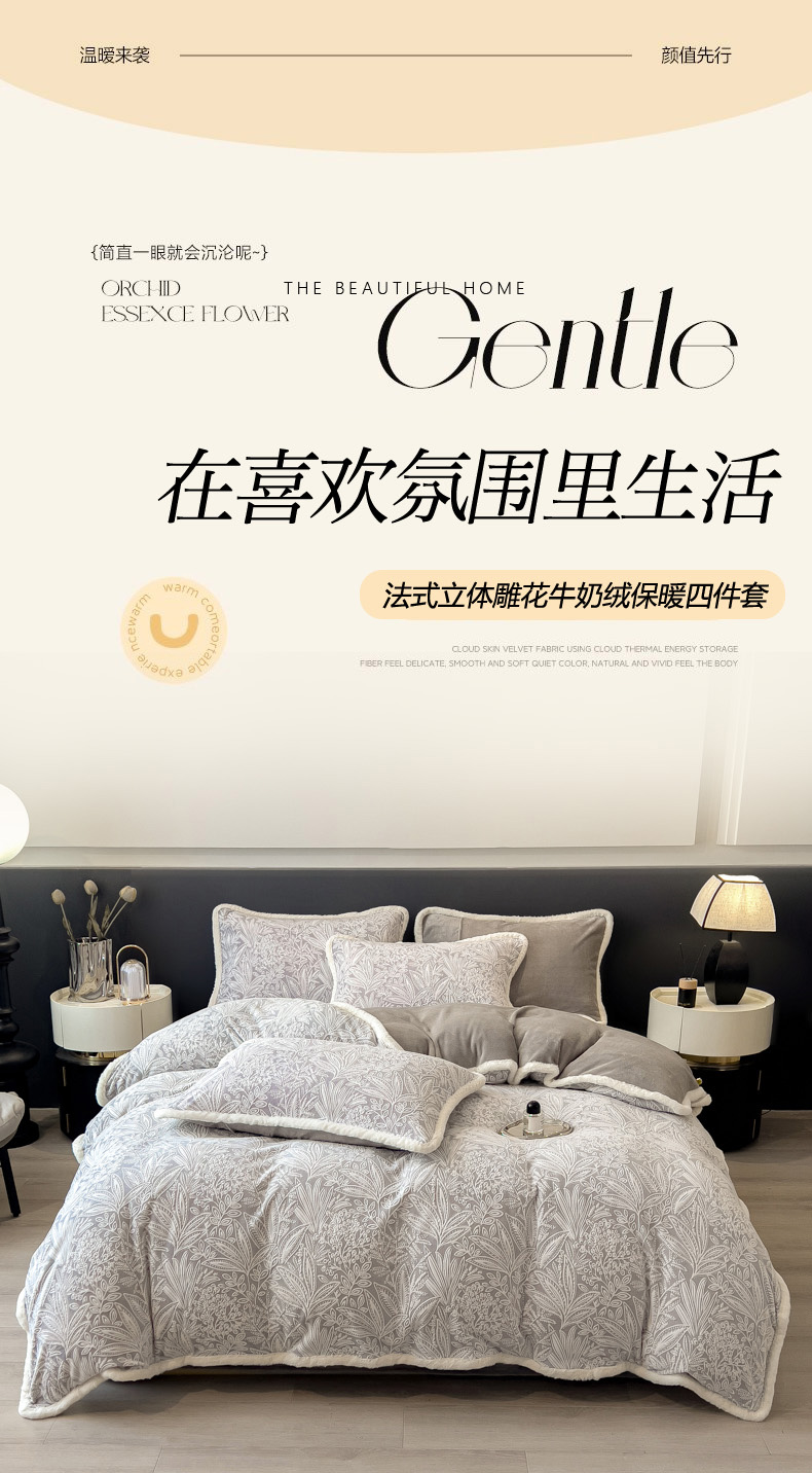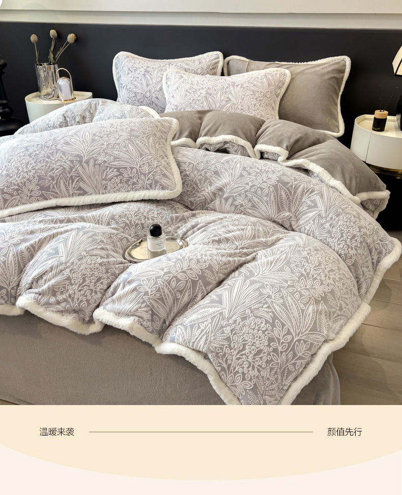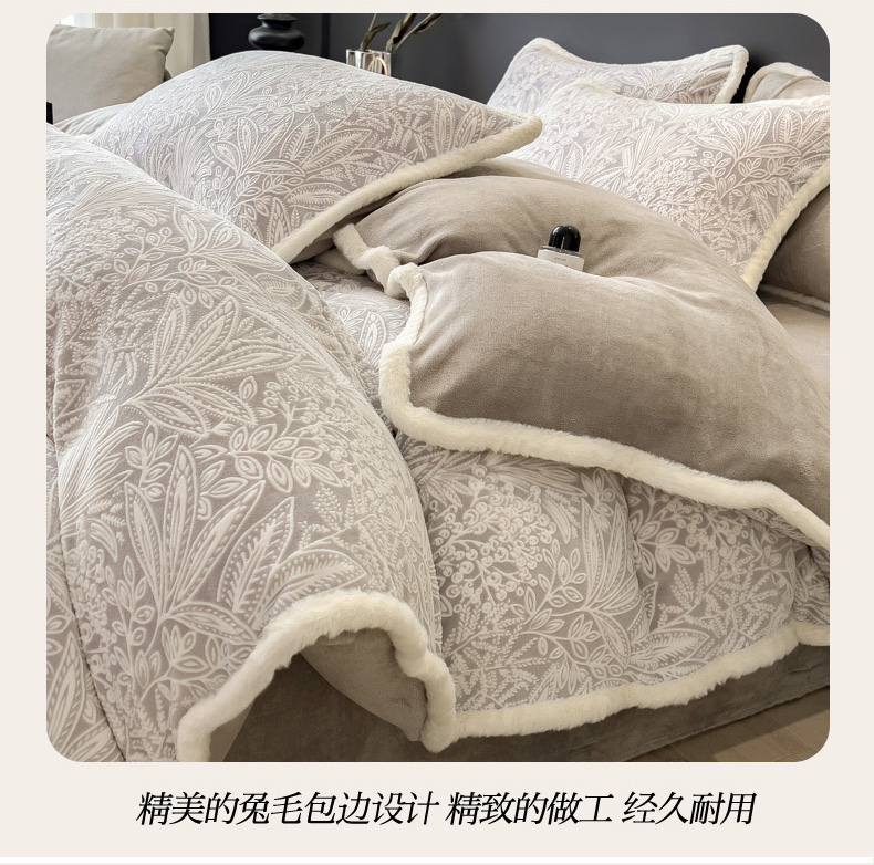 当前位置: 91家纺网 > 商品网购 > 床品套件 > 四件套 > 兔毛绒四件套 > 印季家纺 2025新款法式立体雕花绒兔毛包边四件套 山茶庄园-灰