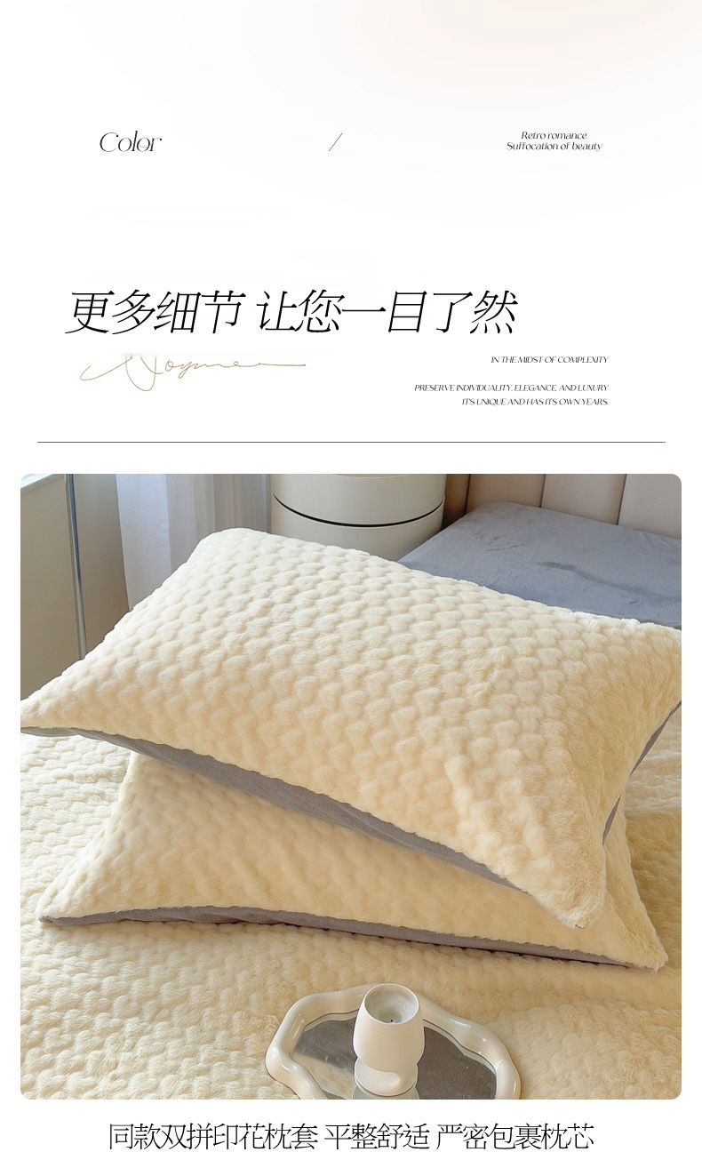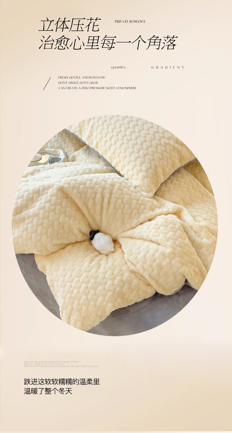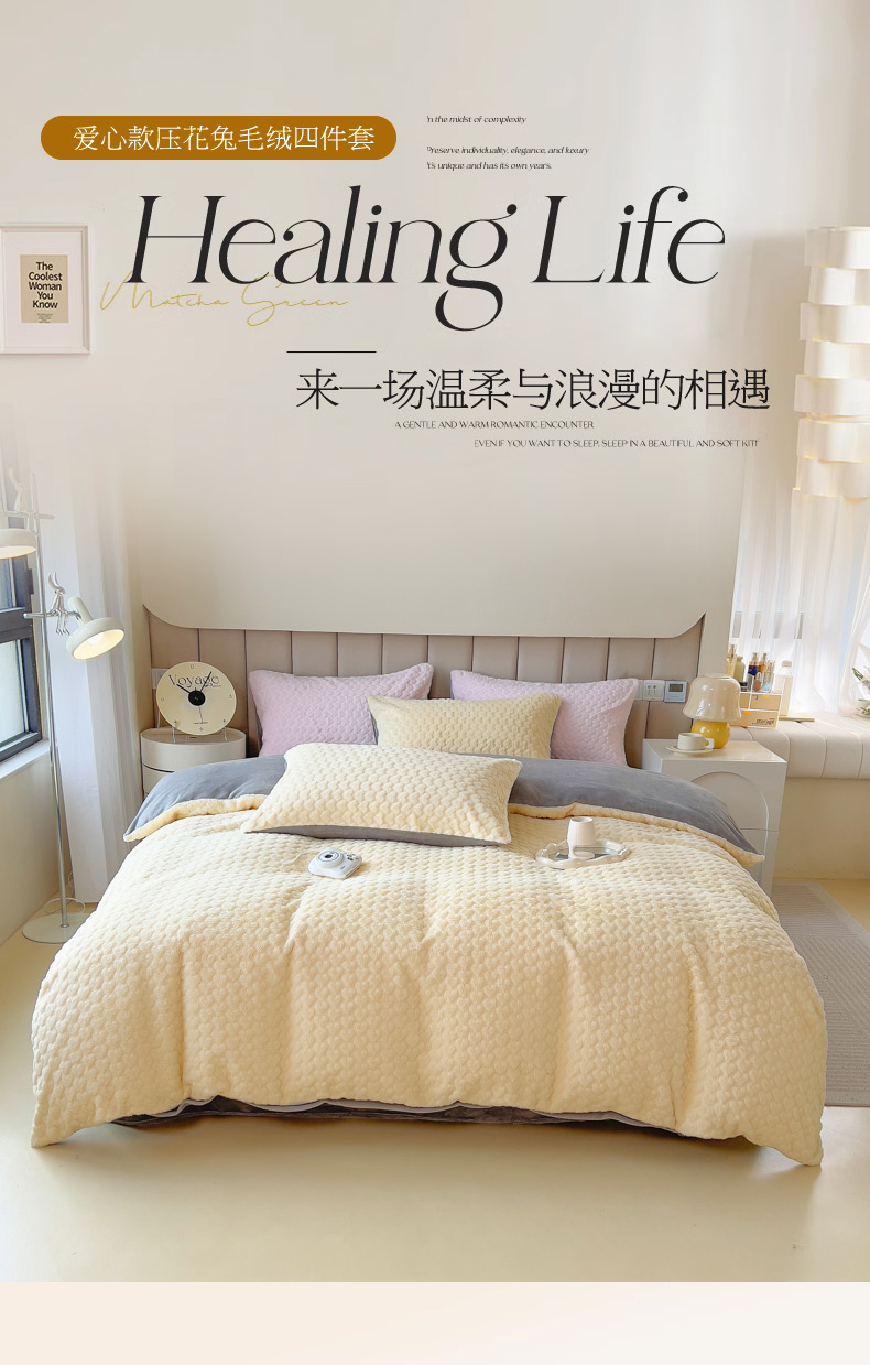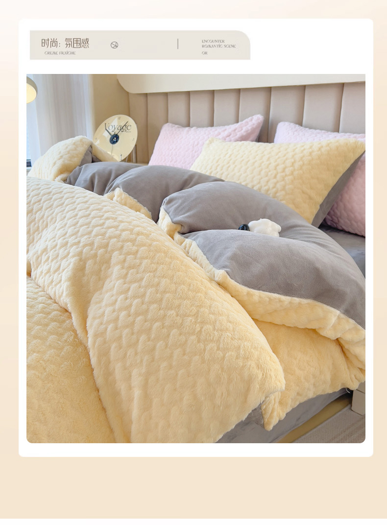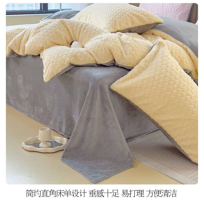 当前位置: 91家纺网 > 商品网购 > 床品套件 > 四件套 > 兔毛绒四件套 > 印季家纺 2025新款爱心款压花兔毛绒四件套 鹅黄-灰