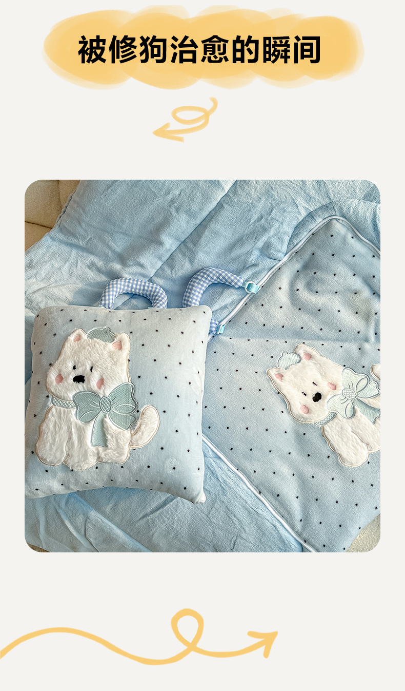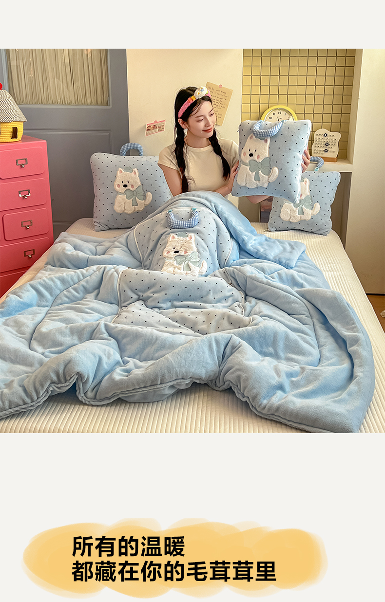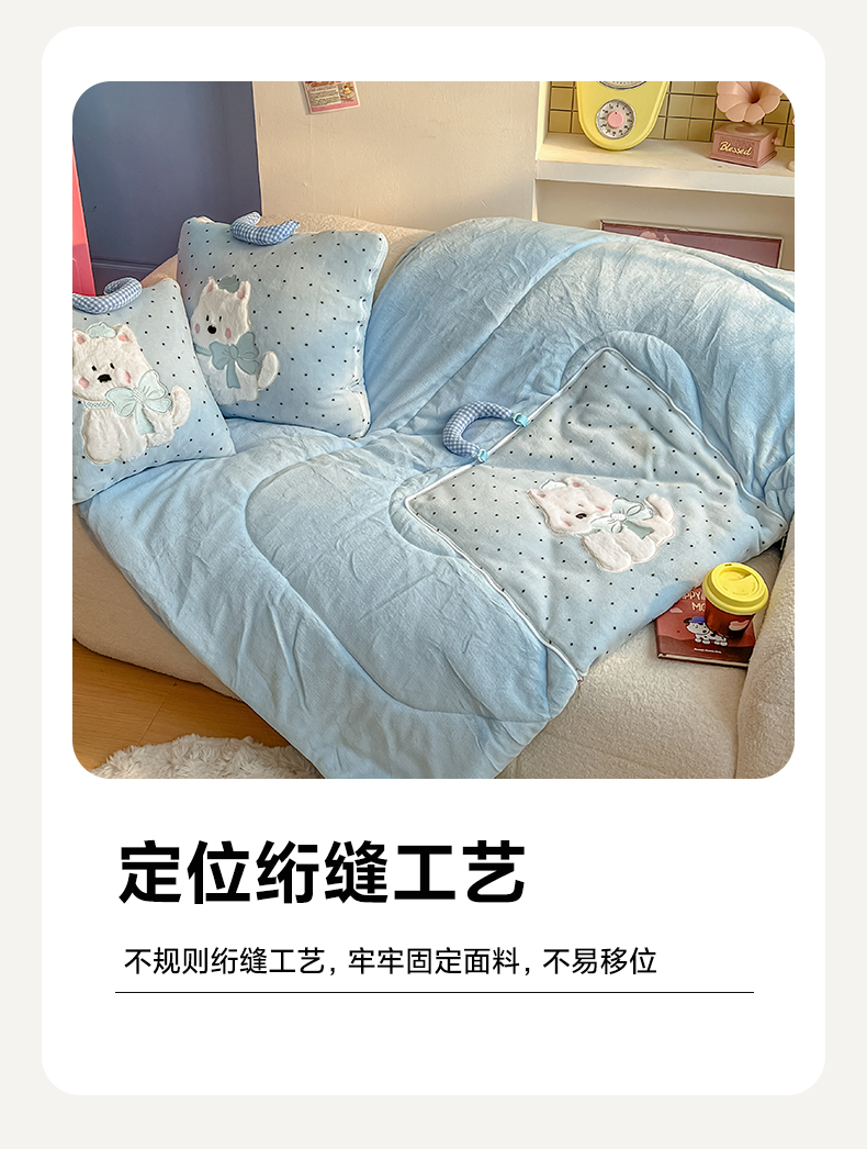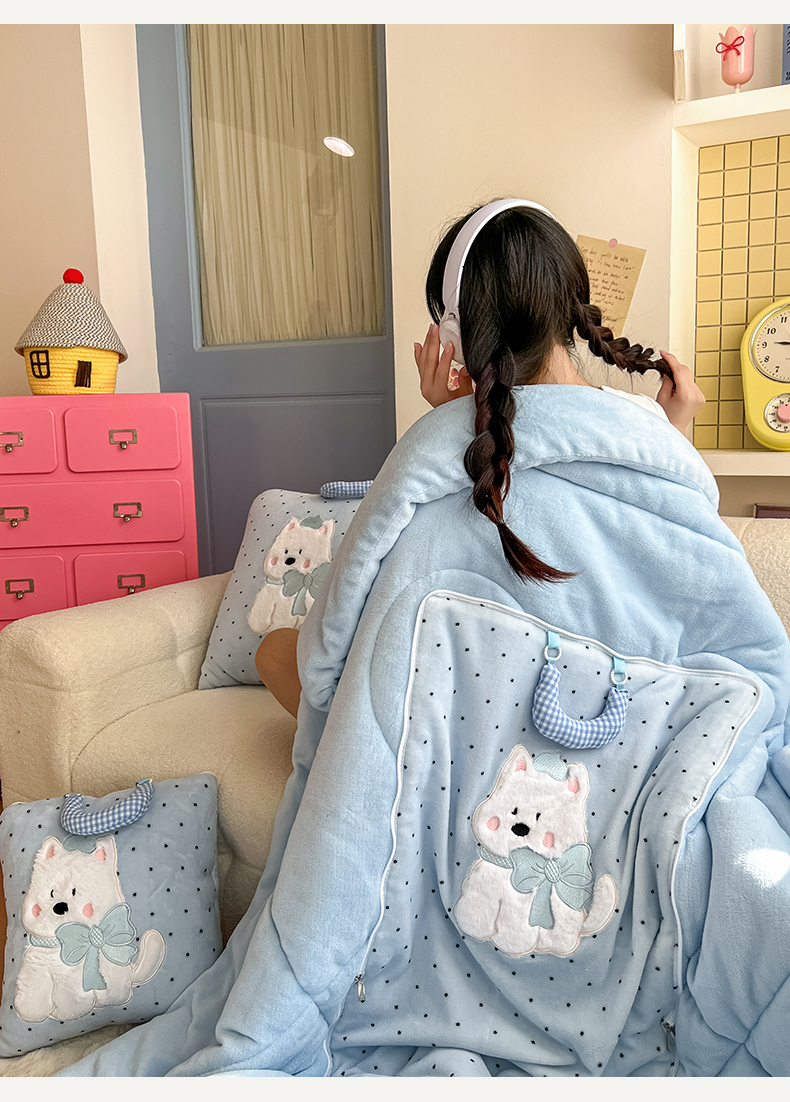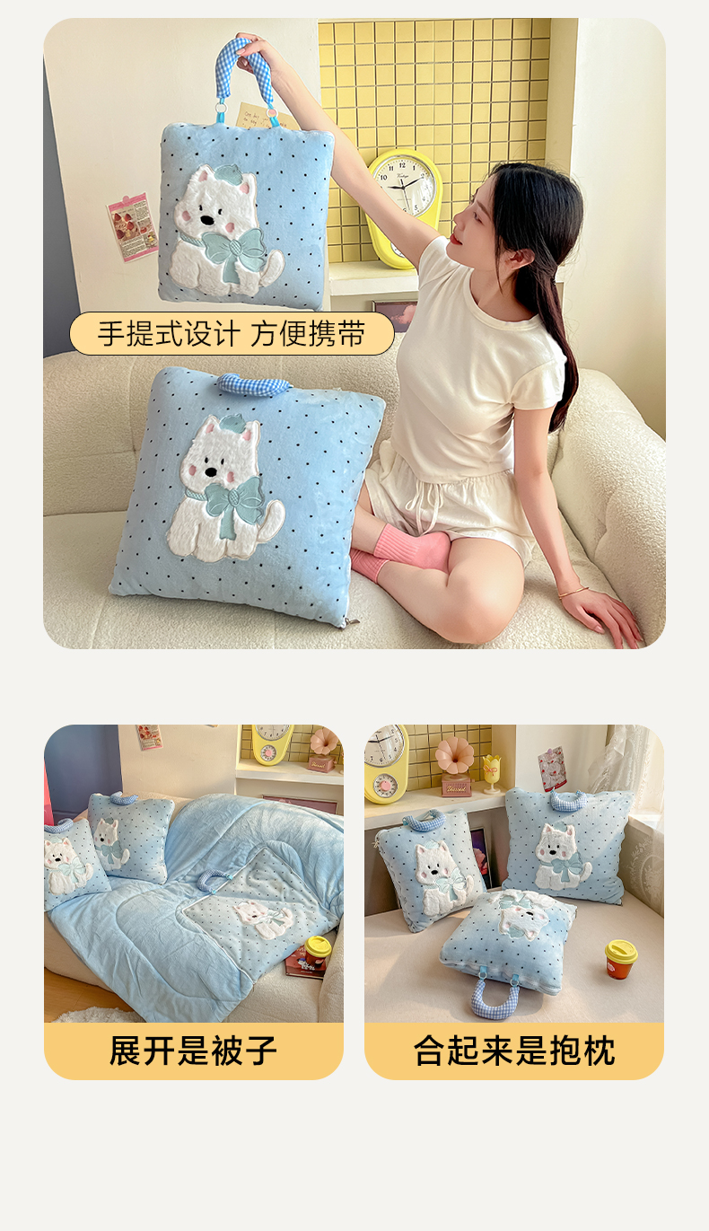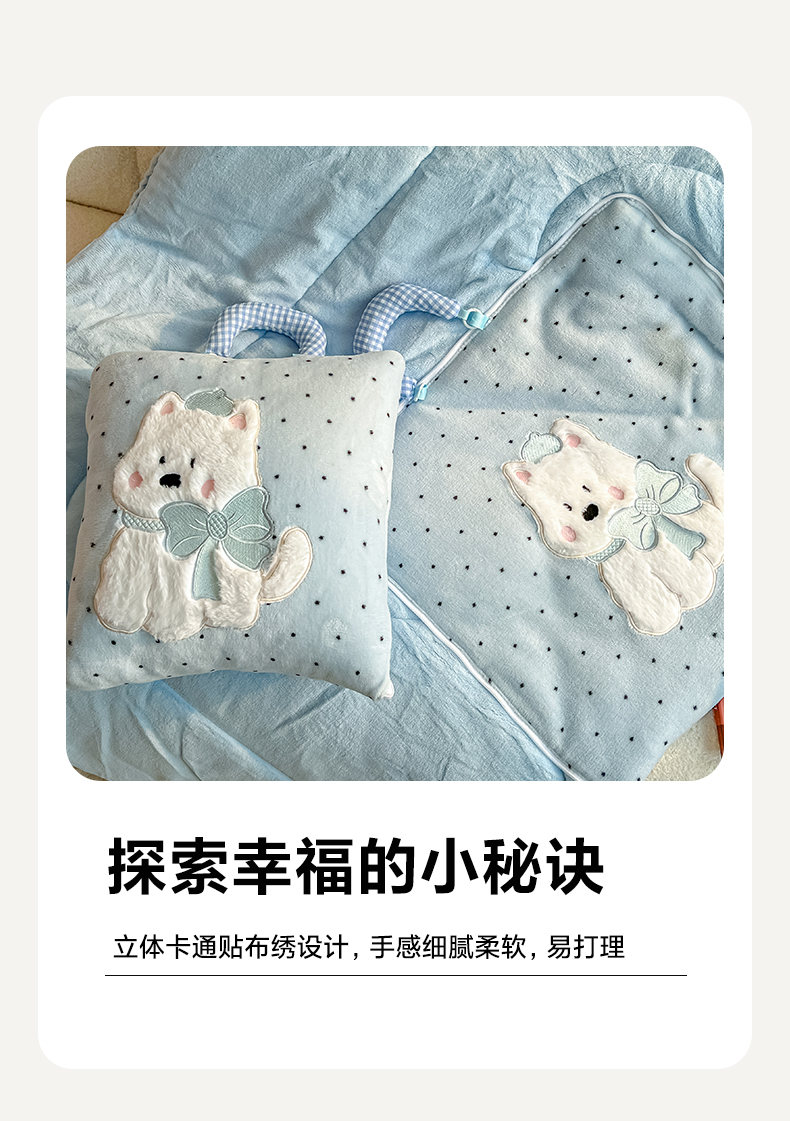 商品名称:番茄+ 2025新款牛奶绒贴布绣西高地抱枕被 波点-蓝