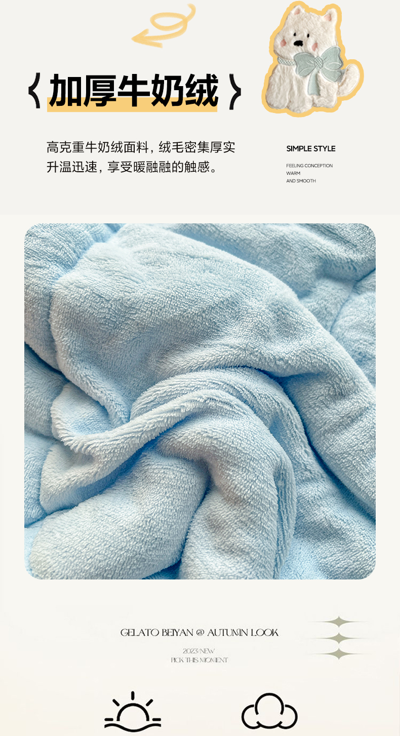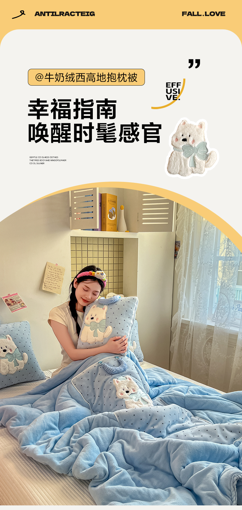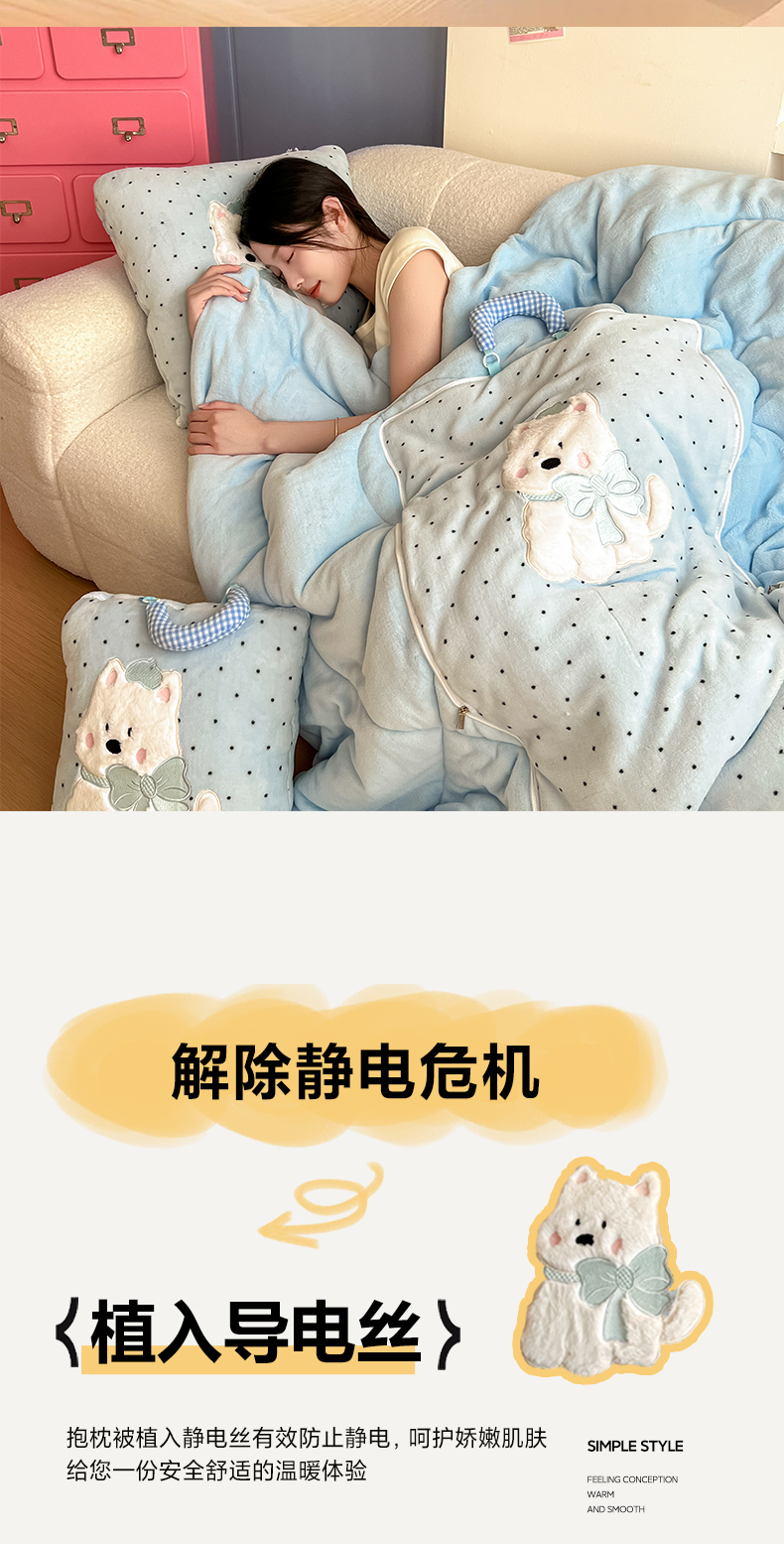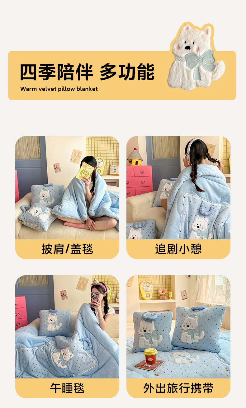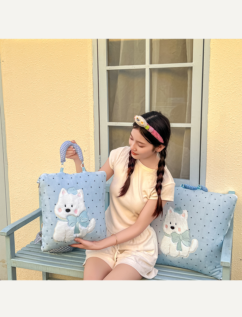 商品名称:番茄+ 2025新款牛奶绒贴布绣西高地抱枕被 波点-蓝