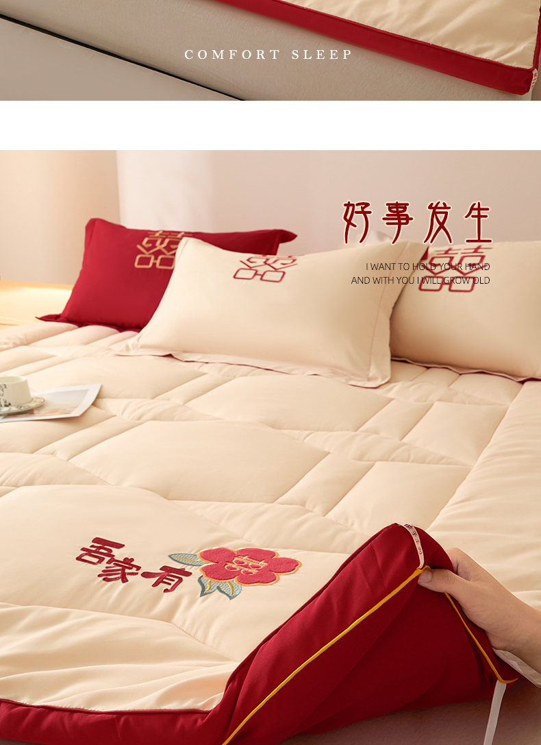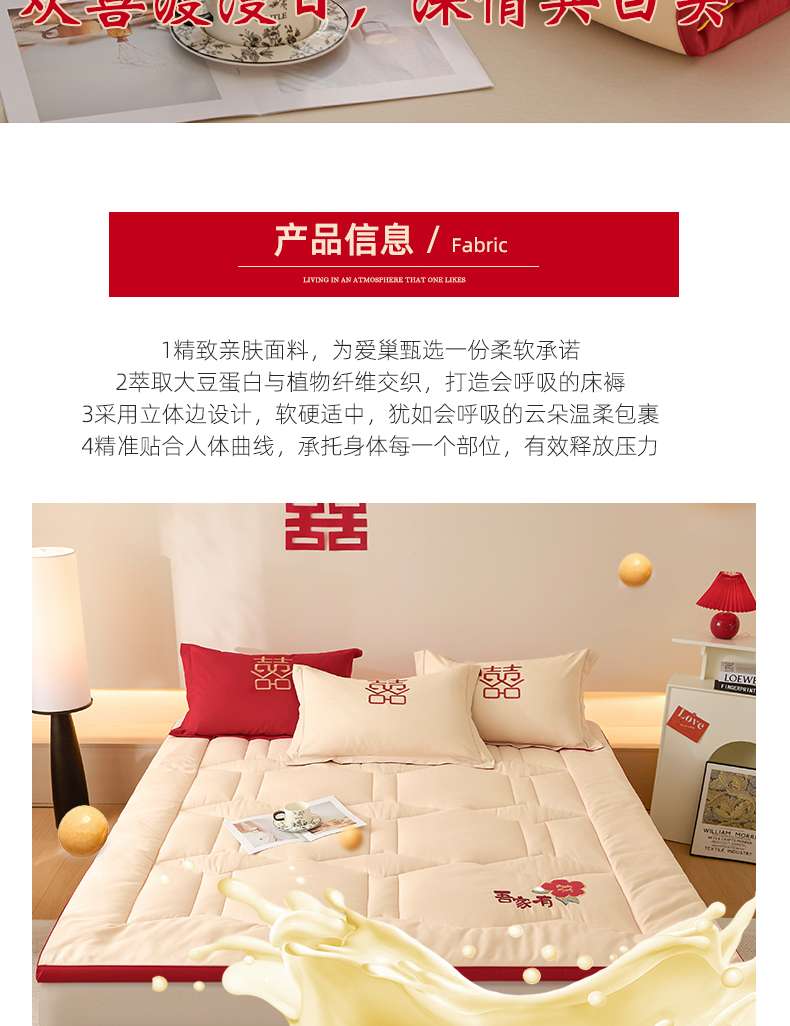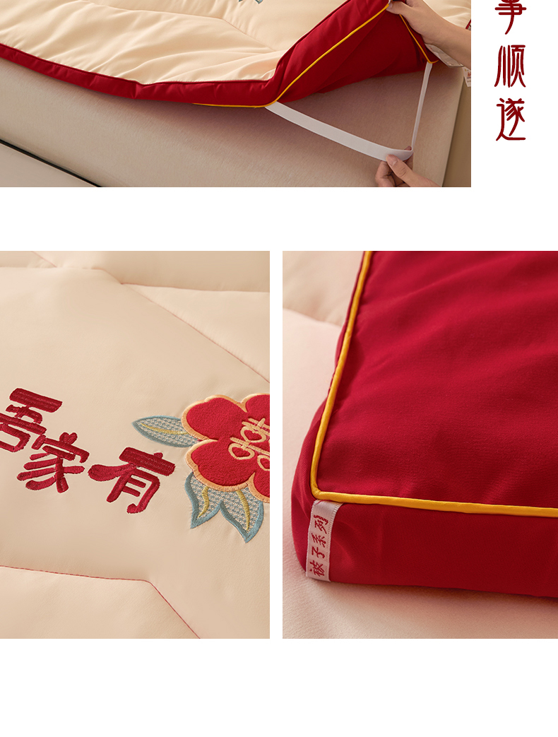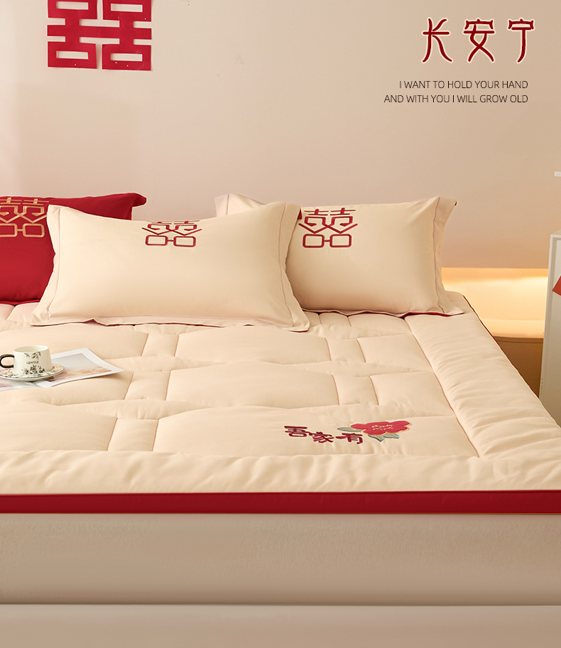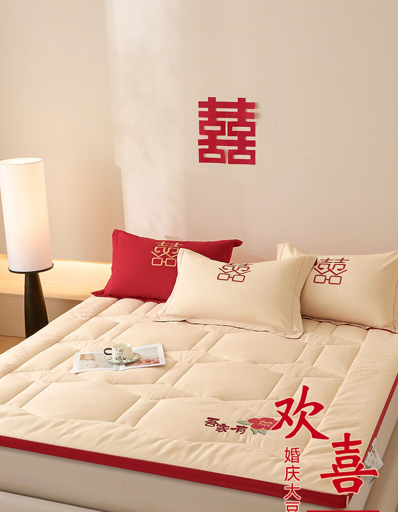 (总)玉雅家纺 2025新款立体婚庆绣花大豆床垫床褥加厚垫被,圆圆满满-红,圆圆满满-米