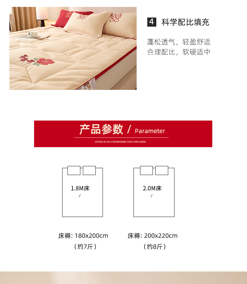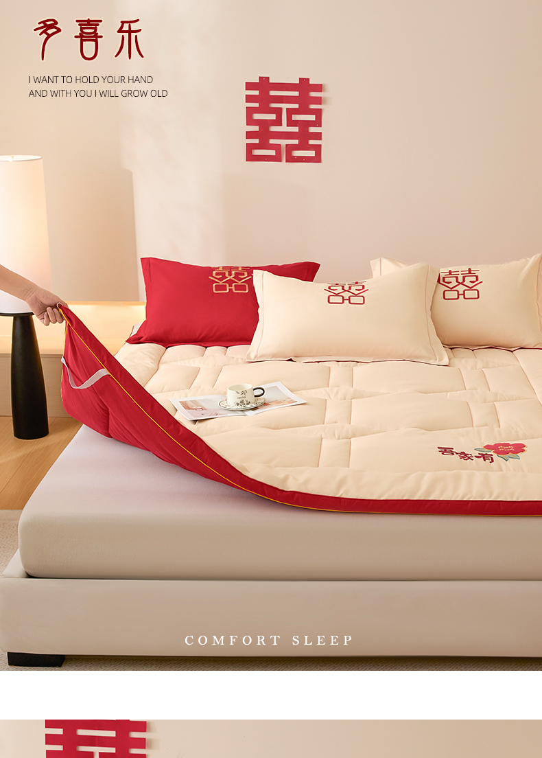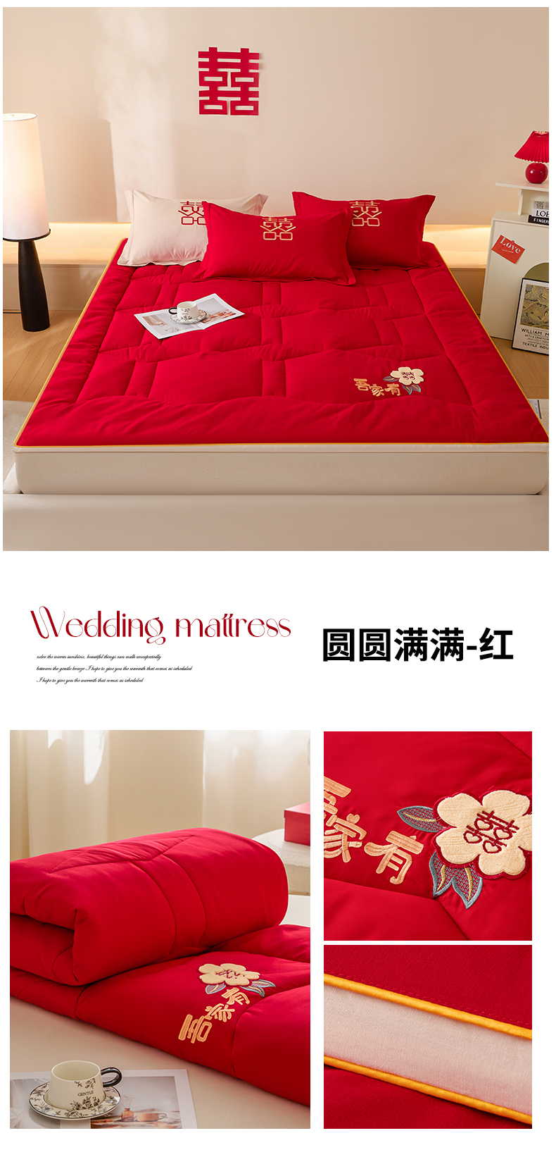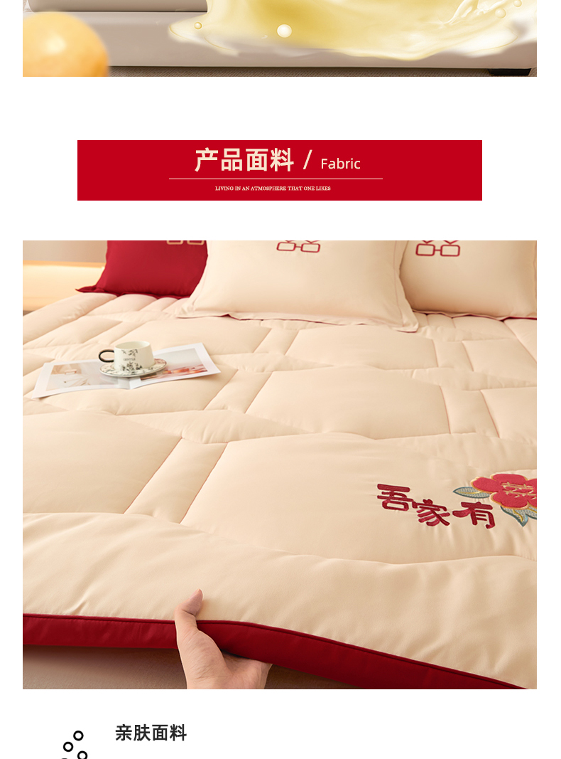 (总)玉雅家纺 2025新款立体婚庆绣花大豆床垫床褥加厚垫被,圆圆满满-红,圆圆满满-米