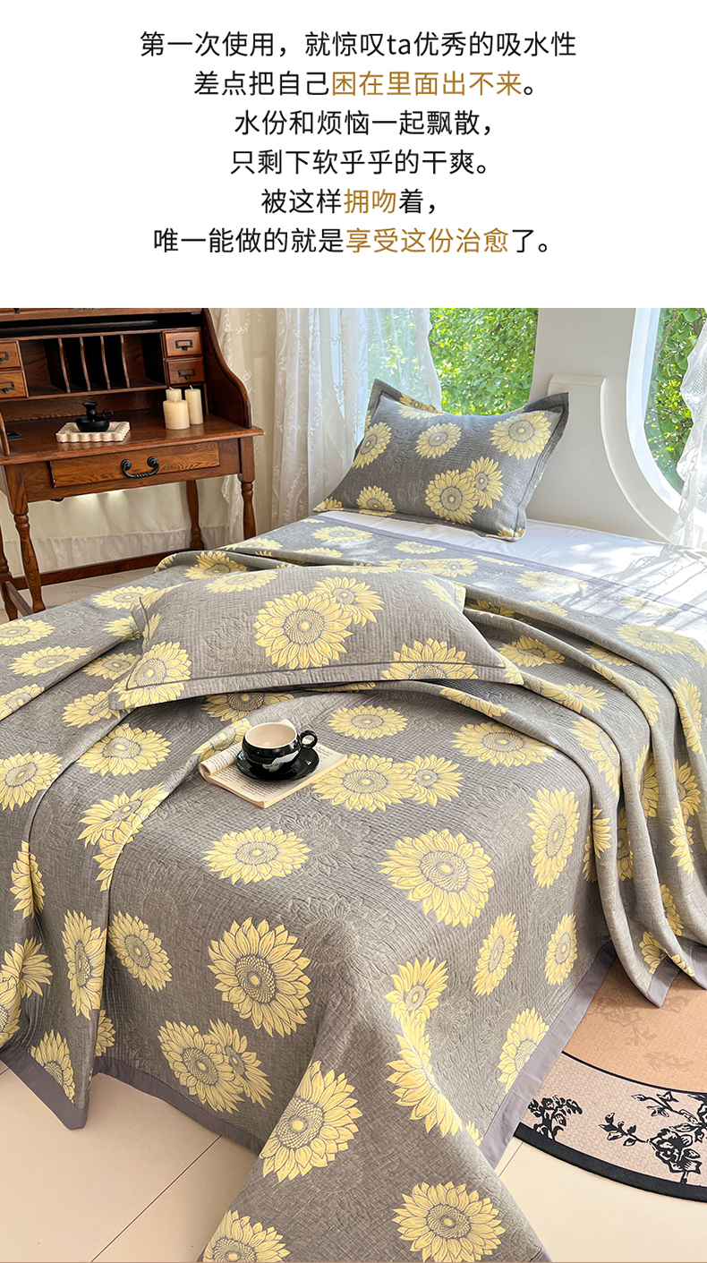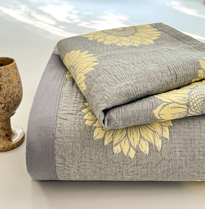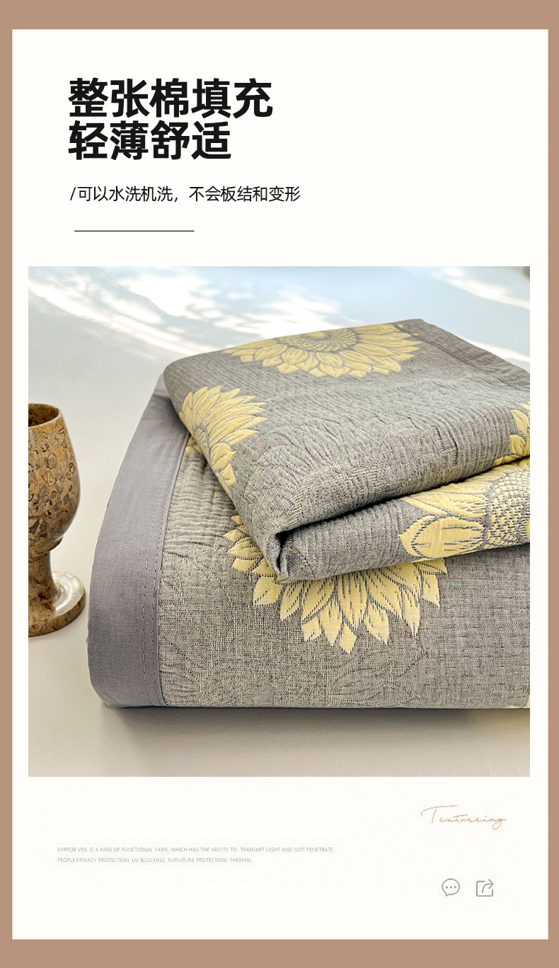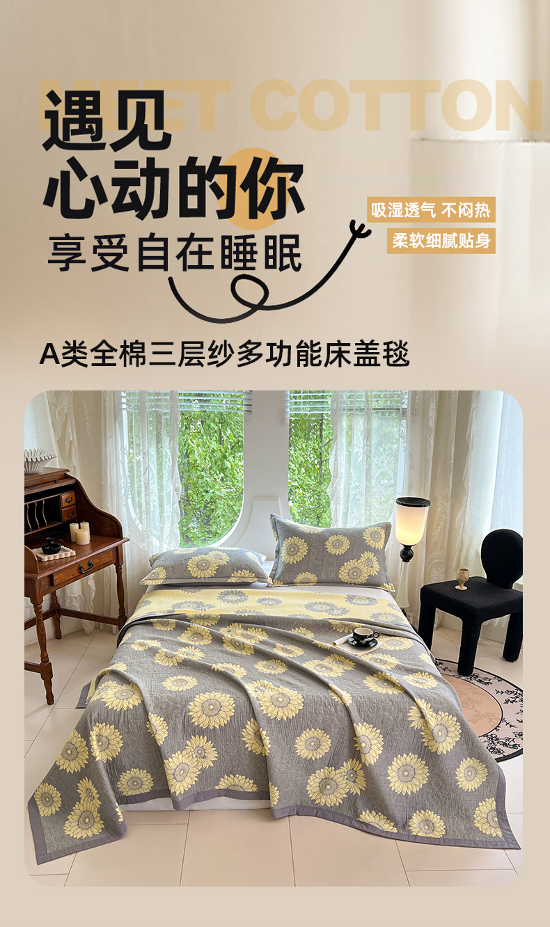 商品名称:yyds网供 2025新款A类色织全棉三层纱布床盖三件套喷气夹棉盖毯夏被厚床单多功能榻榻米风格一 暖阳灰黄