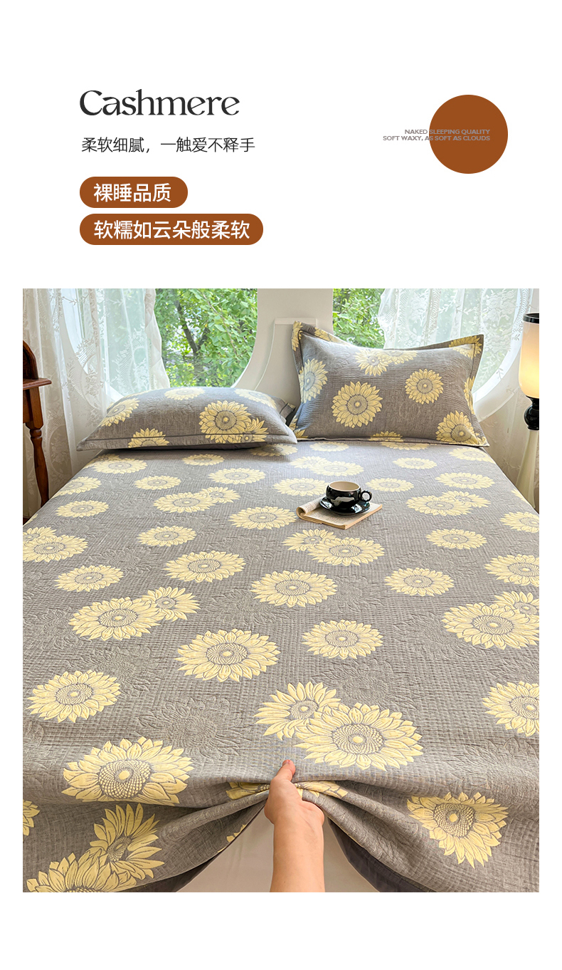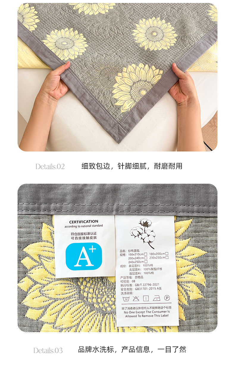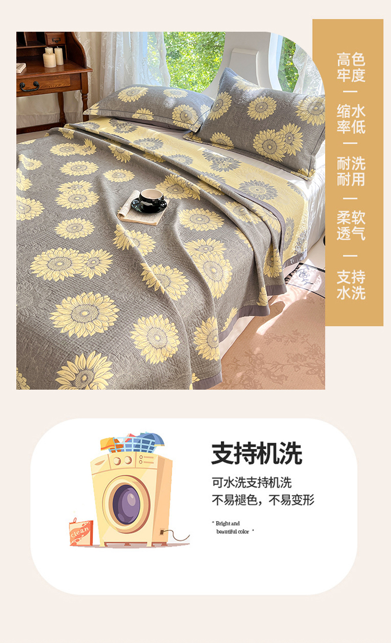 商品名称:yyds网供 2025新款A类色织全棉三层纱布床盖三件套喷气夹棉盖毯夏被厚床单多功能榻榻米风格一 暖阳灰黄