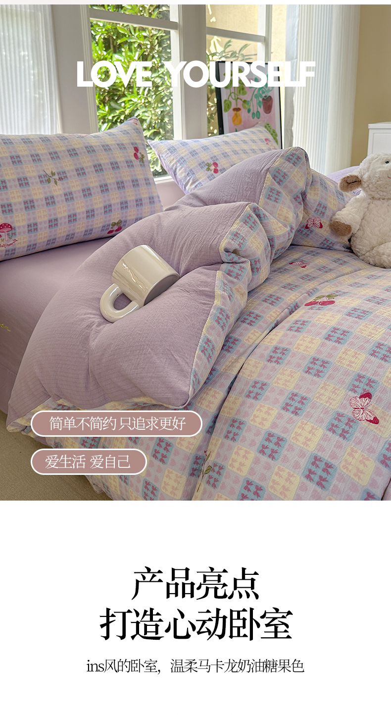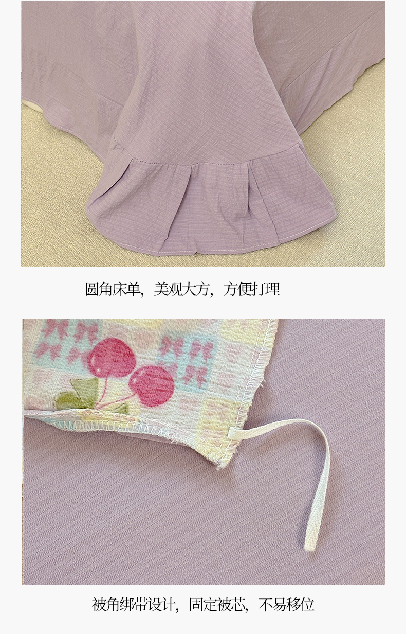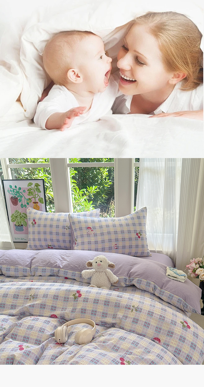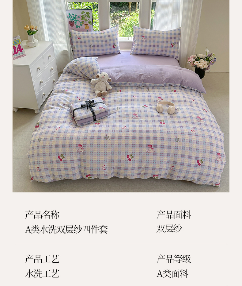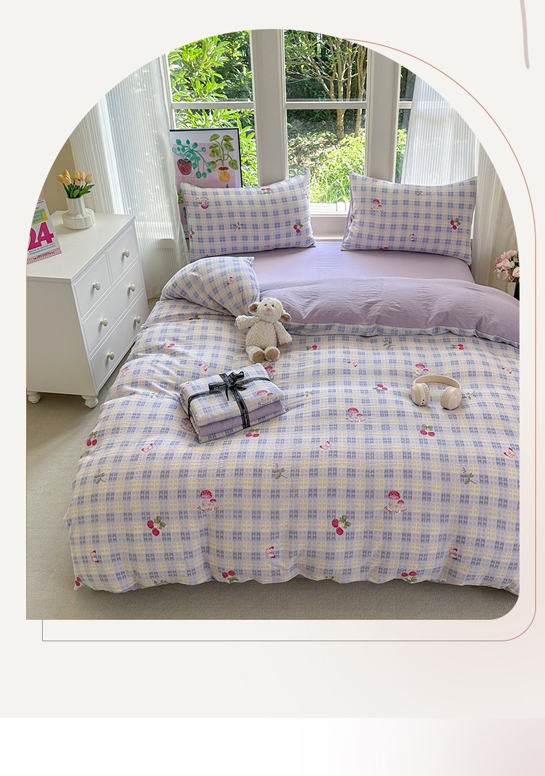 当前位置: 91家纺网 > 商品网购 > 床品套件 > 四件套 > 化纤普通四件套 > 桔禾家纺 2025新款小清新水洗棉有氧双层纱印花云感木棉皱皱纱四件套 樱桃紫
