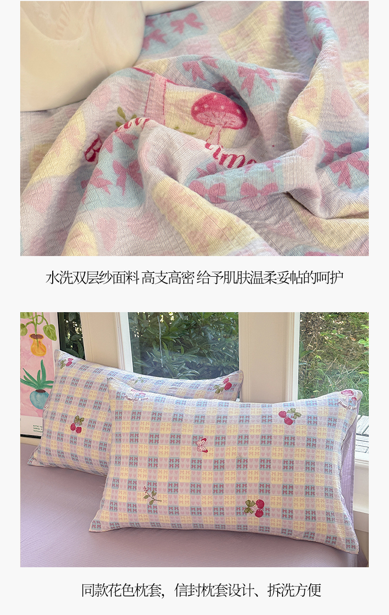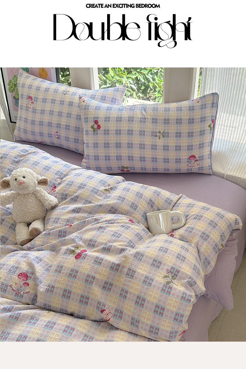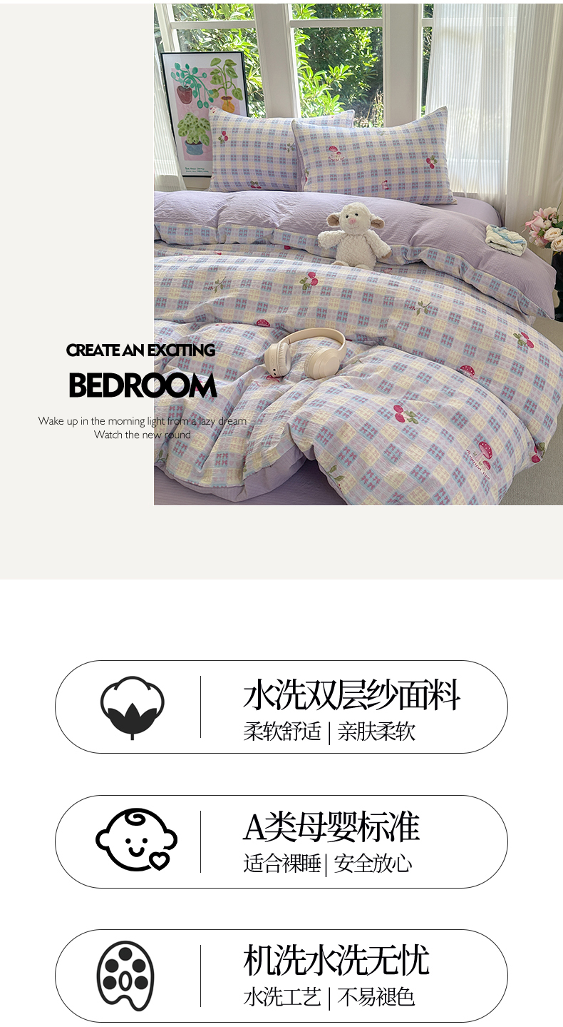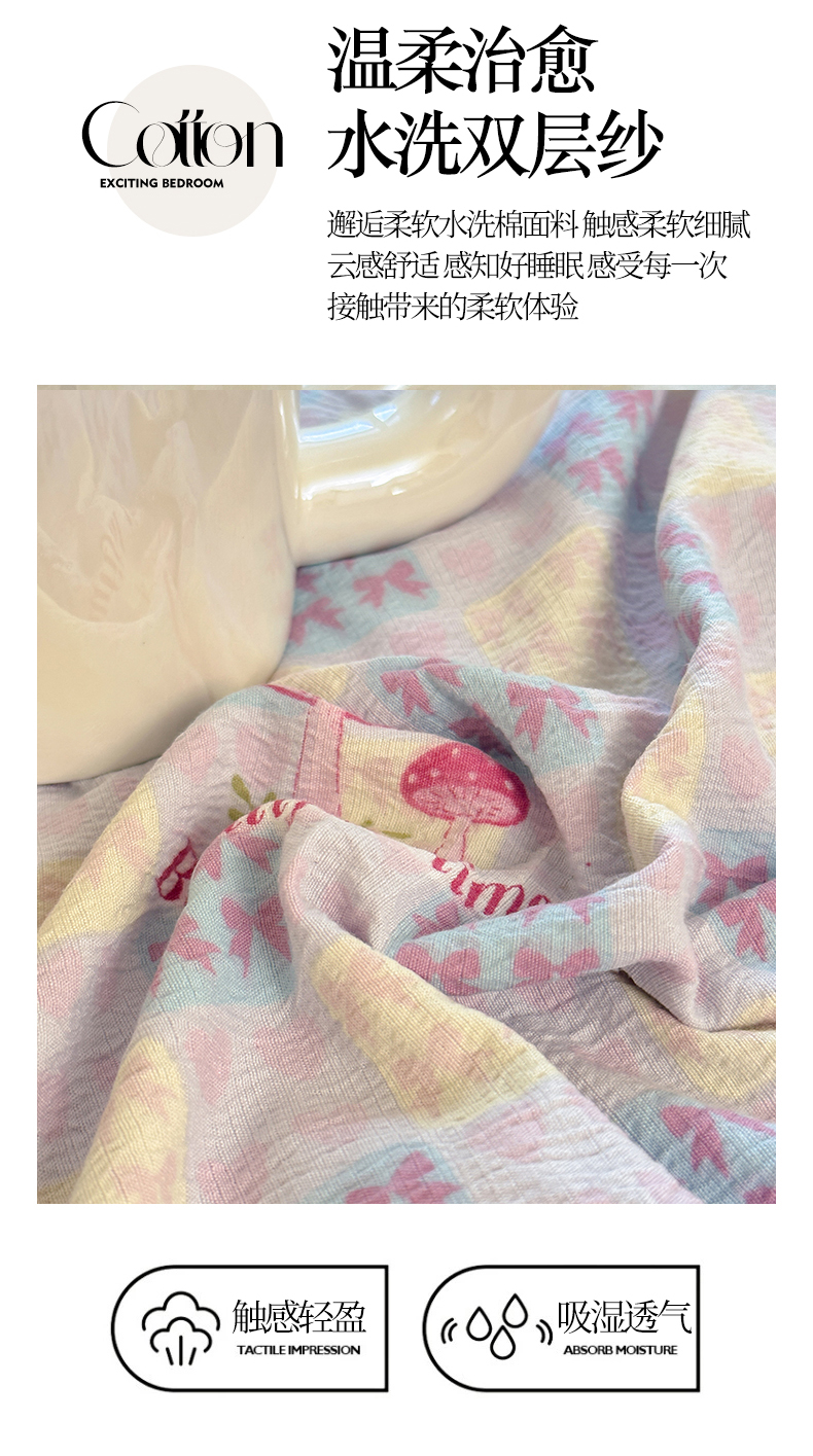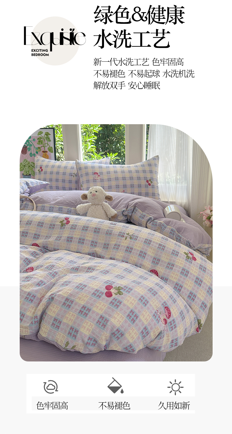 当前位置: 91家纺网 > 商品网购 > 床品套件 > 四件套 > 化纤普通四件套 > 桔禾家纺 2025新款小清新水洗棉有氧双层纱印花云感木棉皱皱纱四件套 樱桃紫