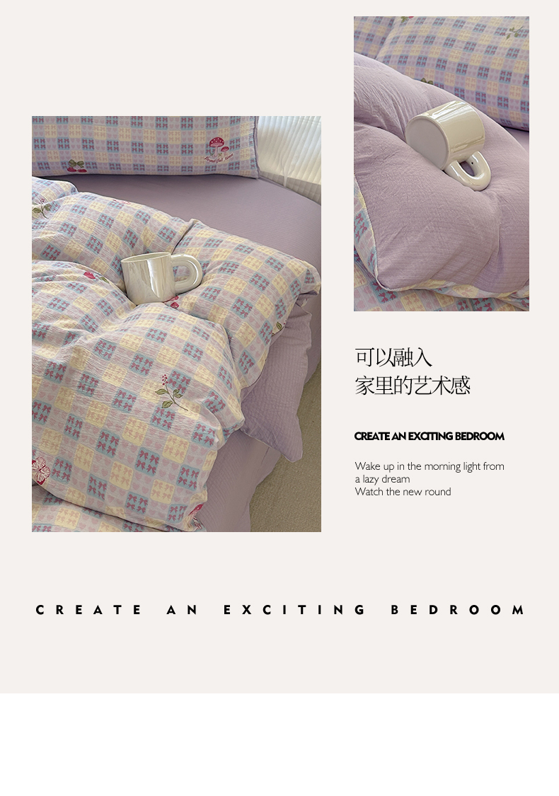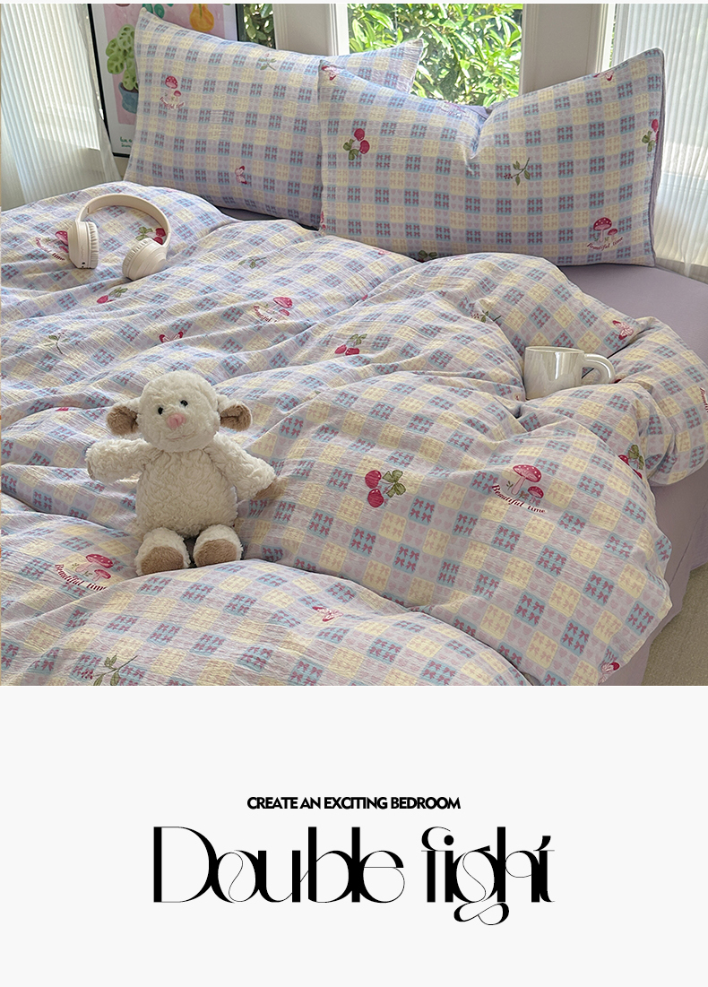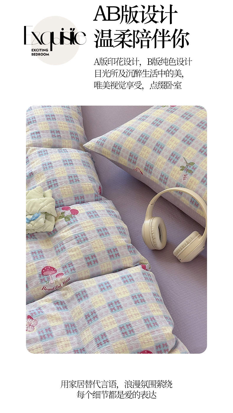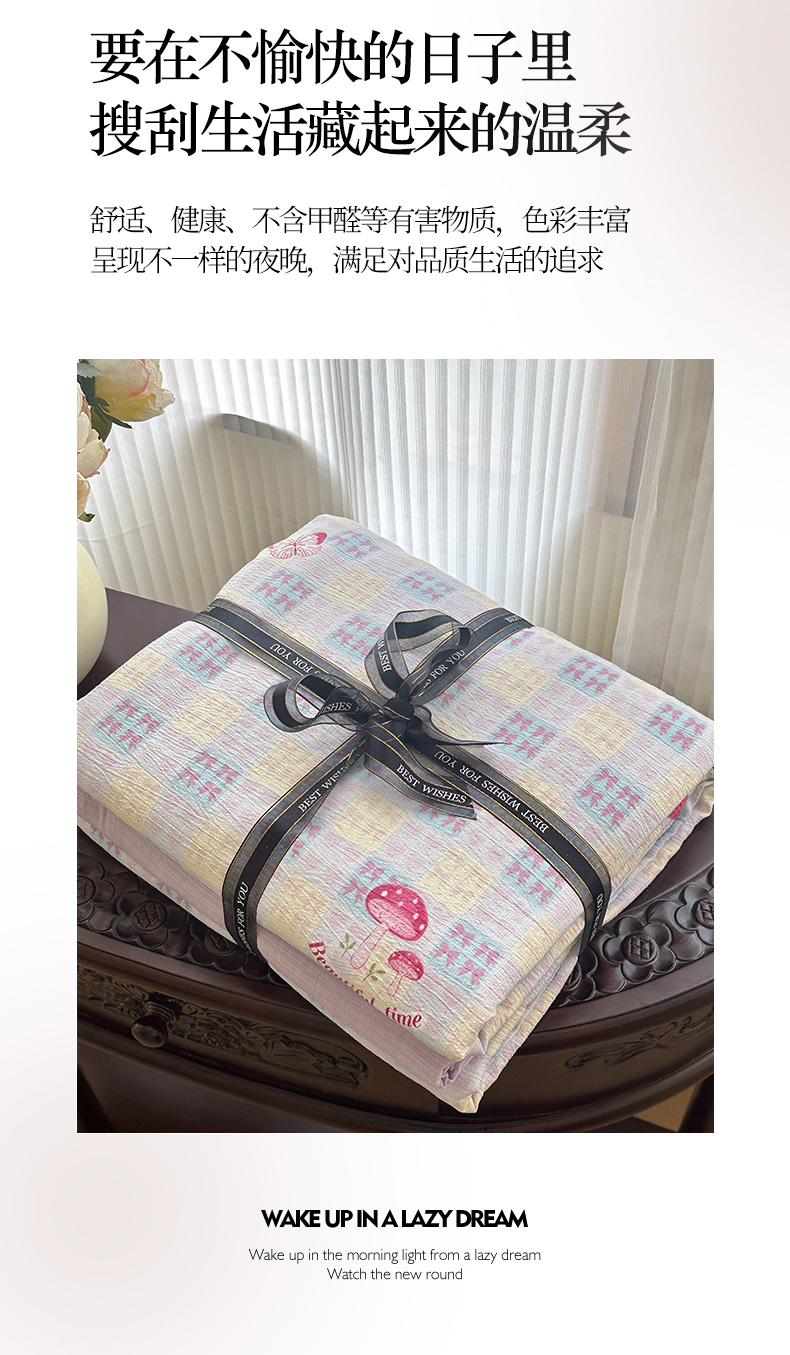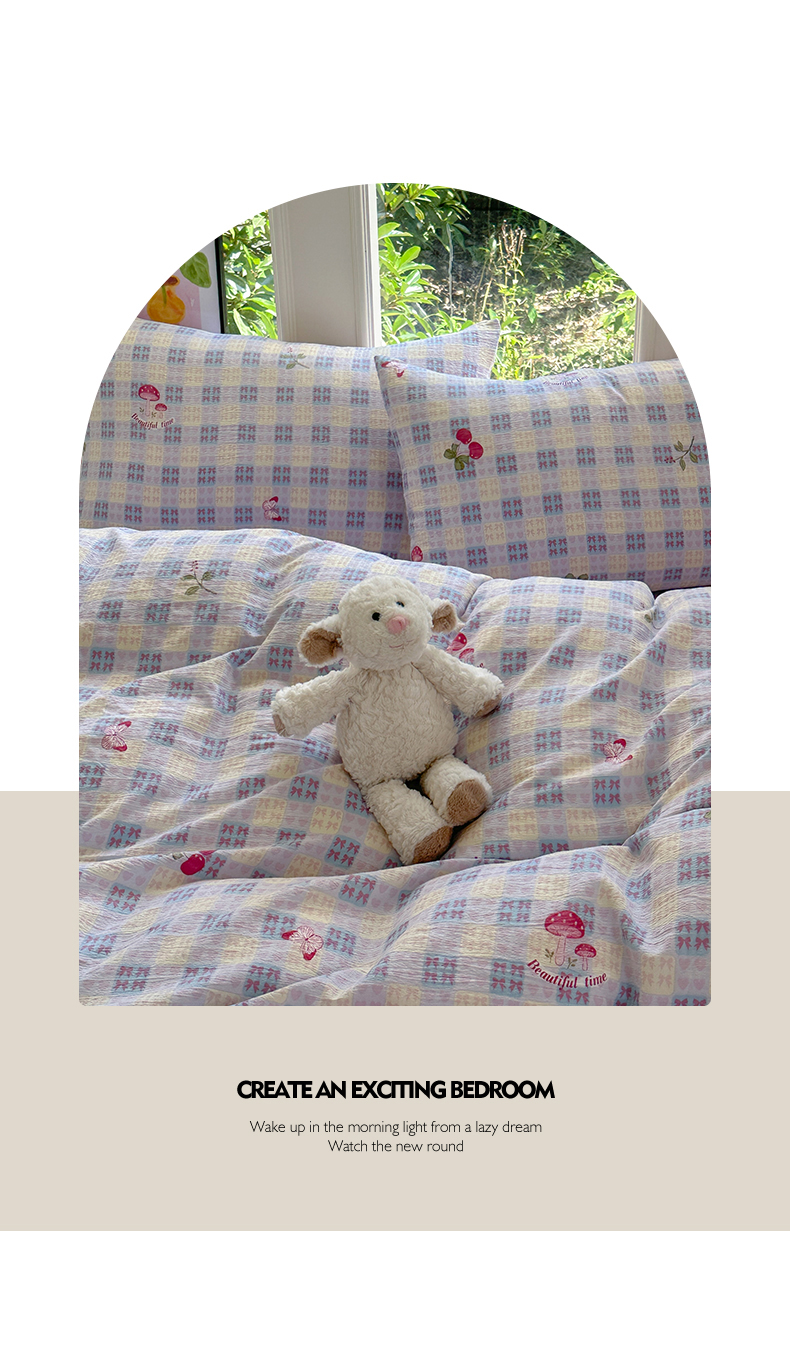 当前位置: 91家纺网 > 商品网购 > 床品套件 > 四件套 > 化纤普通四件套 > 桔禾家纺 2025新款小清新水洗棉有氧双层纱印花云感木棉皱皱纱四件套 樱桃紫