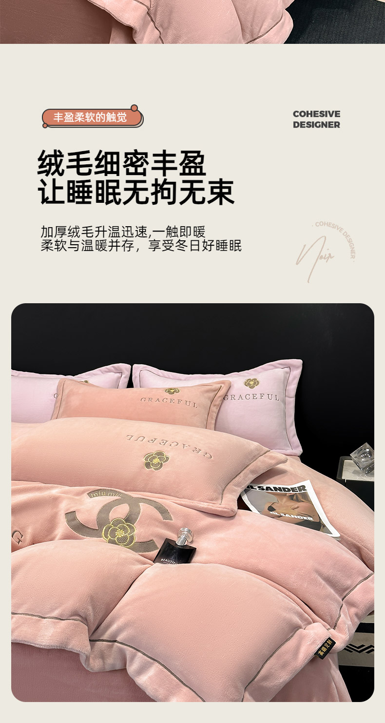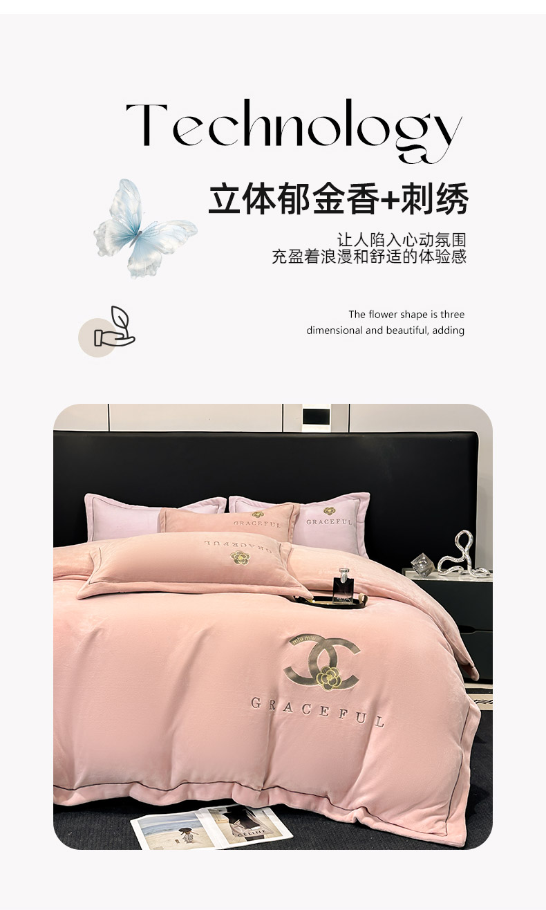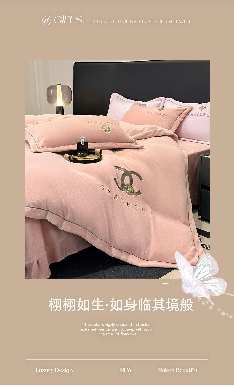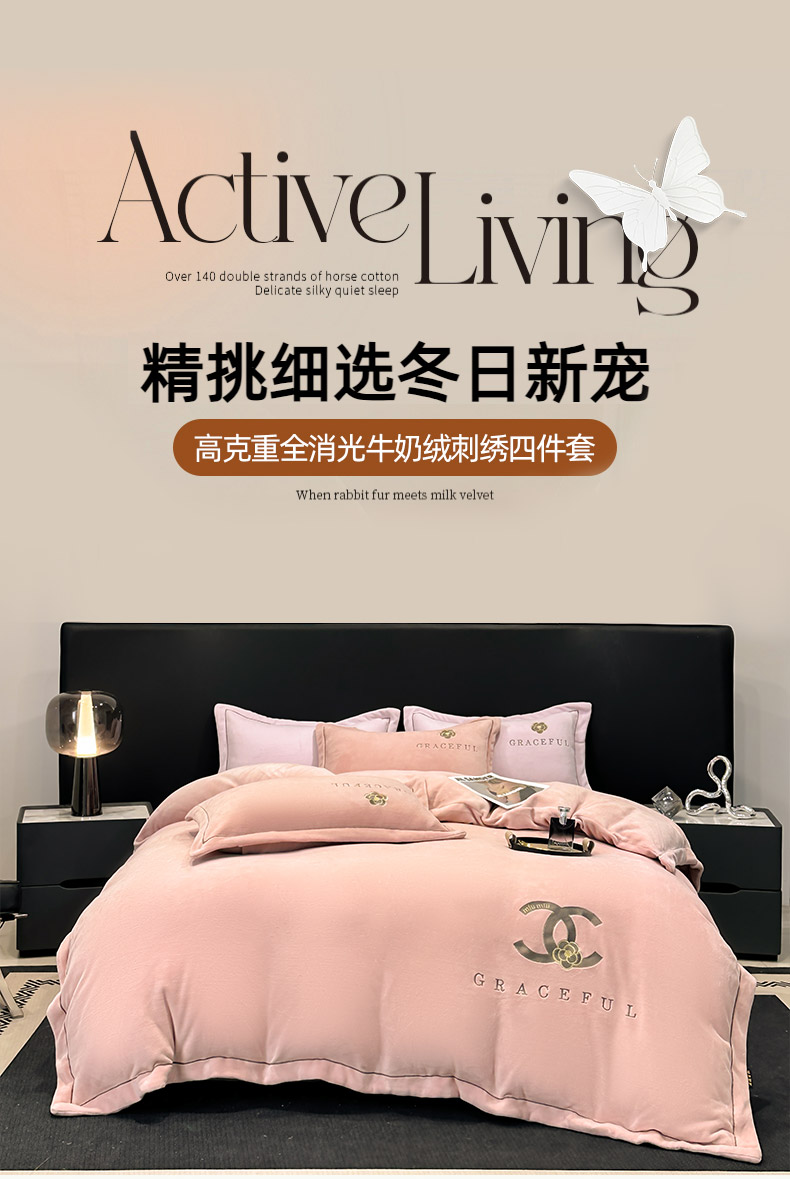 商品名称:合欢(原天一阁) 2025新款A类高克重230克全消光全工艺牛奶绒刺绣四件套 巴黎密语-奶油黄
