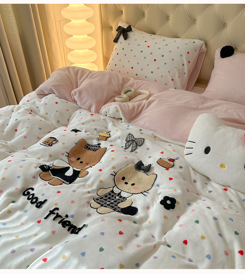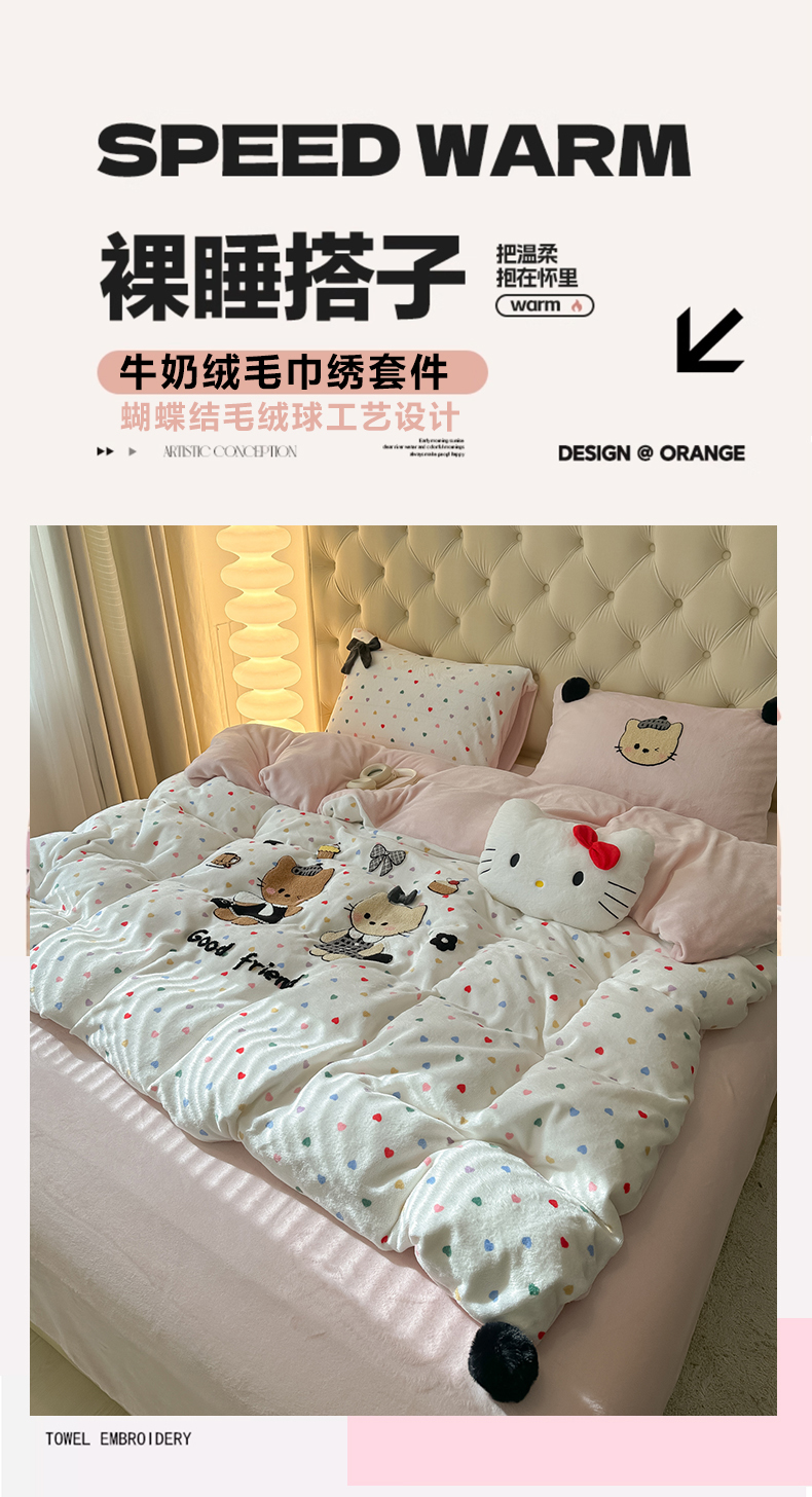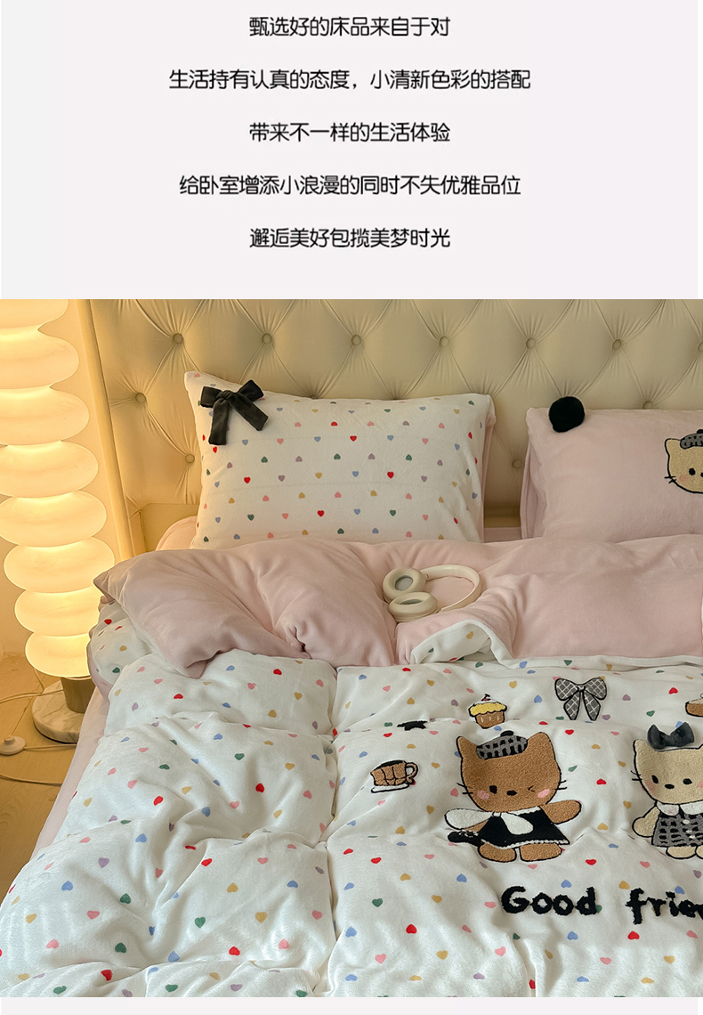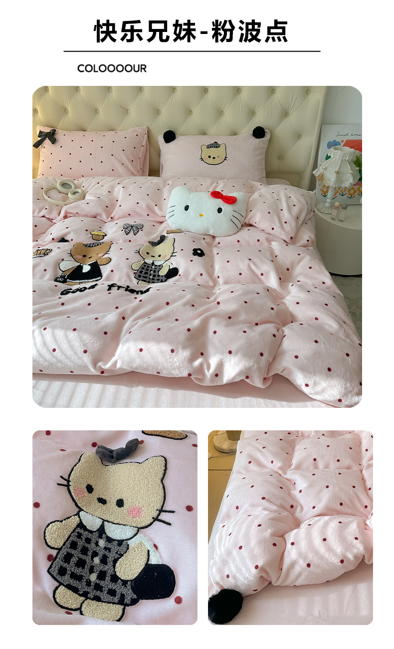 子钦家纺 2025秋冬新款暗黑系小红书同款加厚牛奶绒蝴蝶结款毛巾绣床单床笠四件套-快乐兄妹场景一 快乐兄妹-满满的爱