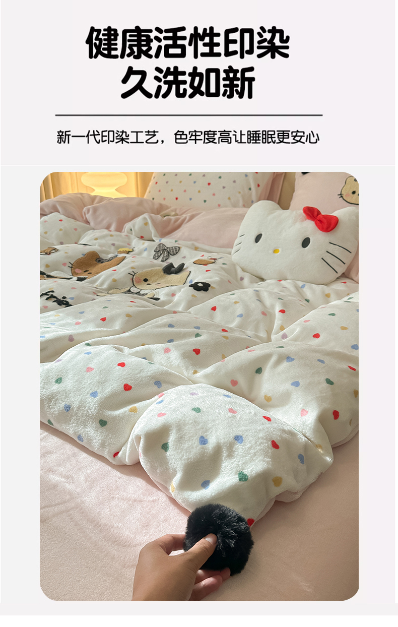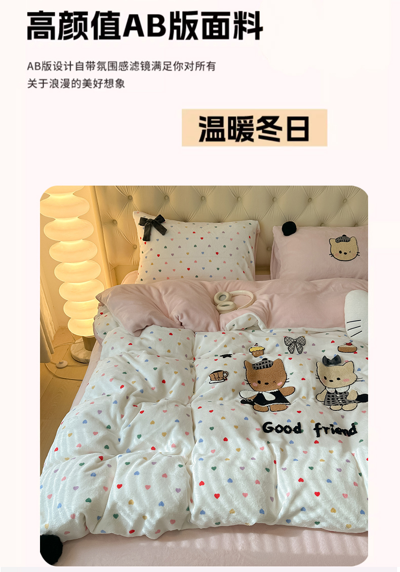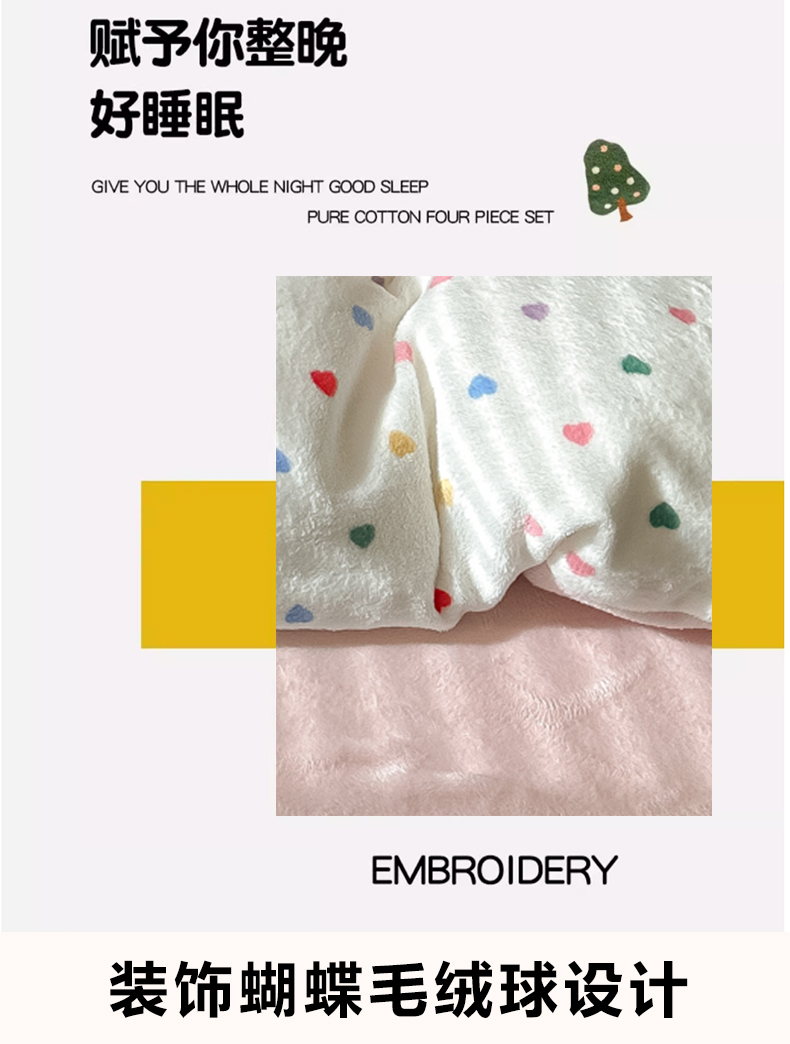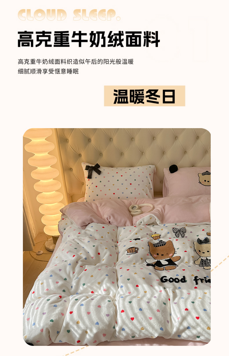 (总)子钦家纺 2023新款赫本风棉加绒牛奶绒四件套,爱心,斑纹,豹纹,蝴蝶结,可爱熊,奶牛,山茶花,神秘花园,素描花,田园风情