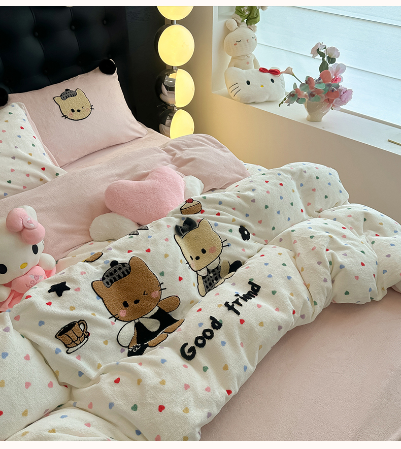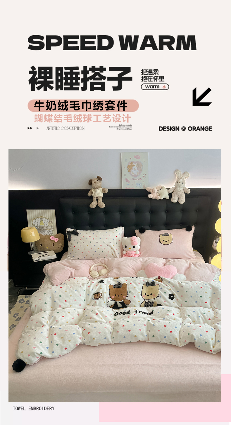 子钦家纺 2025秋冬新款暗黑系小红书同款加厚牛奶绒蝴蝶结款毛巾绣床单床笠四件套-快乐兄妹场景二 快乐兄妹-满满的爱