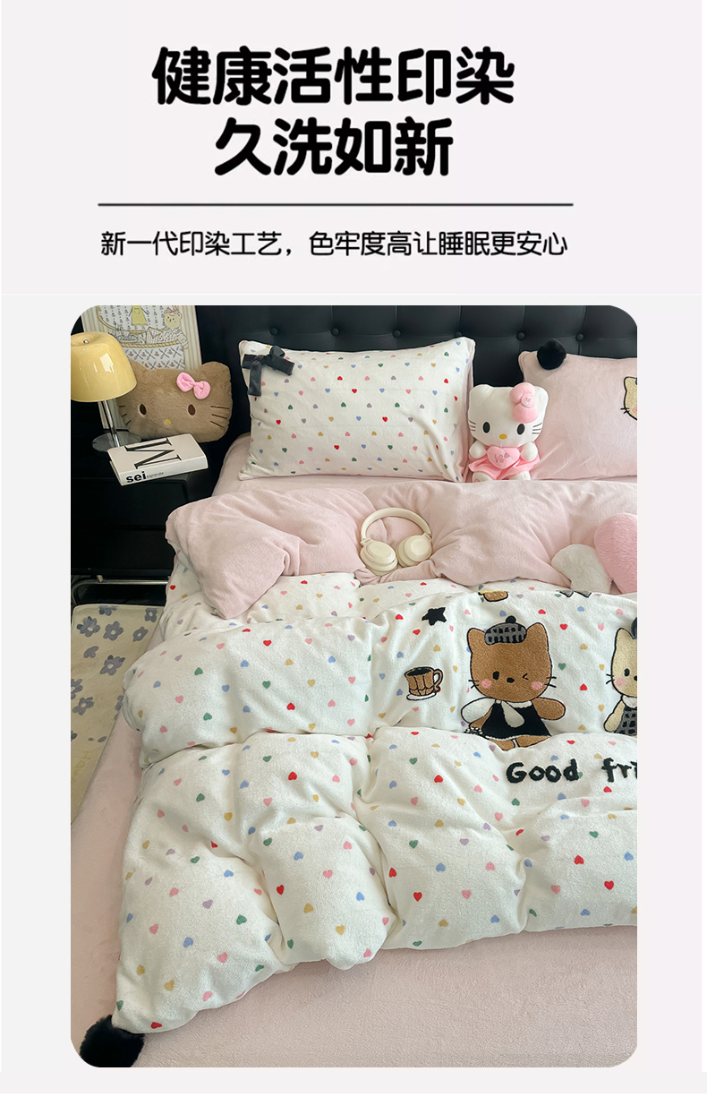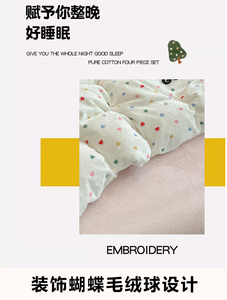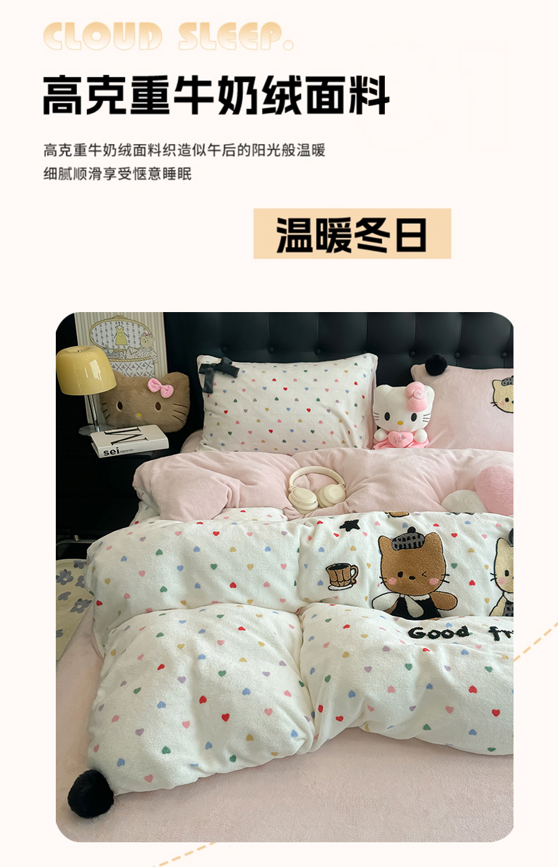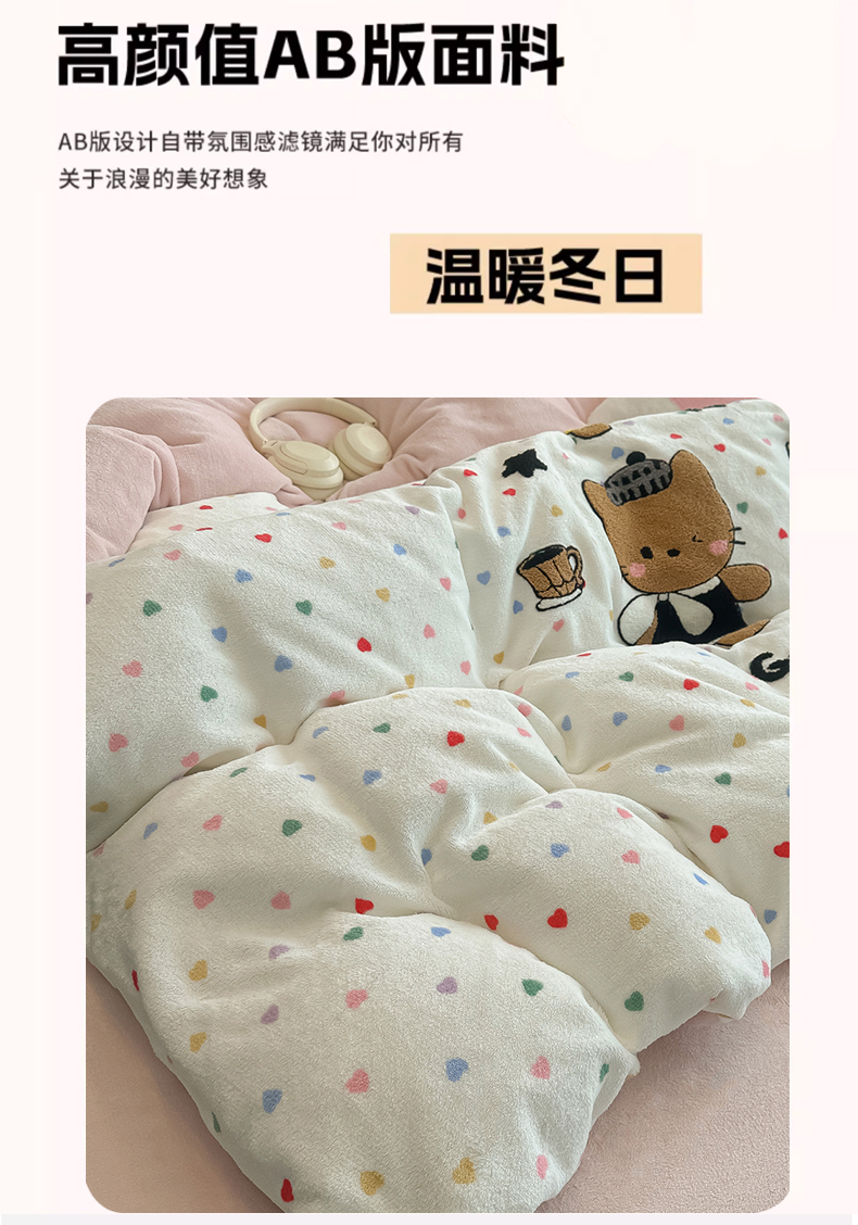 (总)子钦家纺 2023新款赫本风棉加绒牛奶绒四件套,爱心,斑纹,豹纹,蝴蝶结,可爱熊,奶牛,山茶花,神秘花园,素描花,田园风情