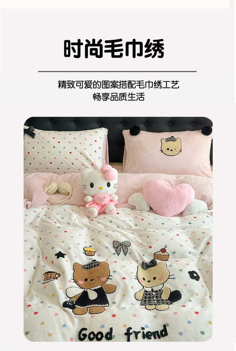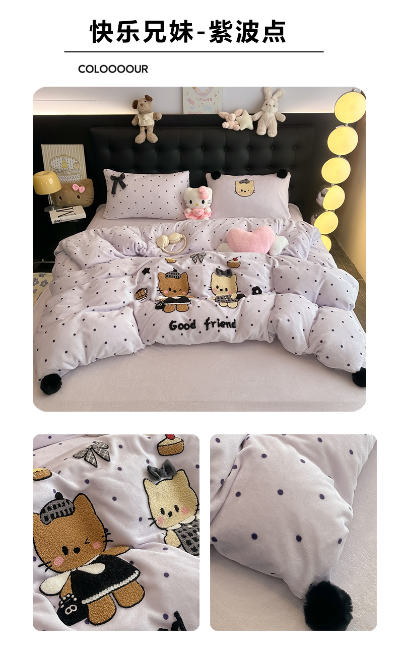 商品名称:子钦家纺 2025秋冬新款暗黑系小红书同款加厚牛奶绒蝴蝶结款毛巾绣床单床笠四件套-快乐兄妹场景二 快乐兄妹-满满的爱