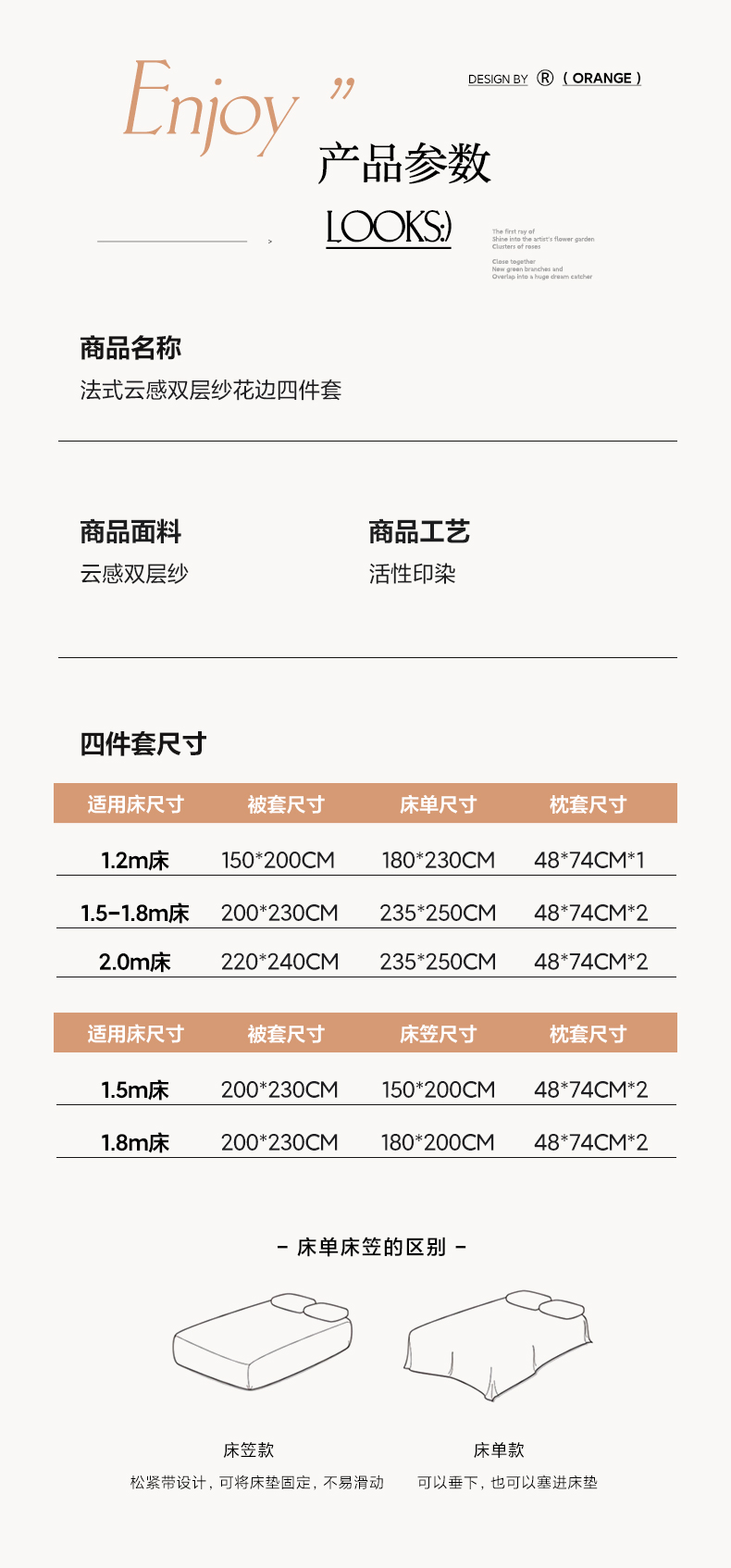 (总)美乐迪家纺 2026新款法式云感双层纱花边四件套,花梦紫,花仙子,花园小猫,咖色小花,浪漫小花,迷你小花,觅悠悠,枝槿米白