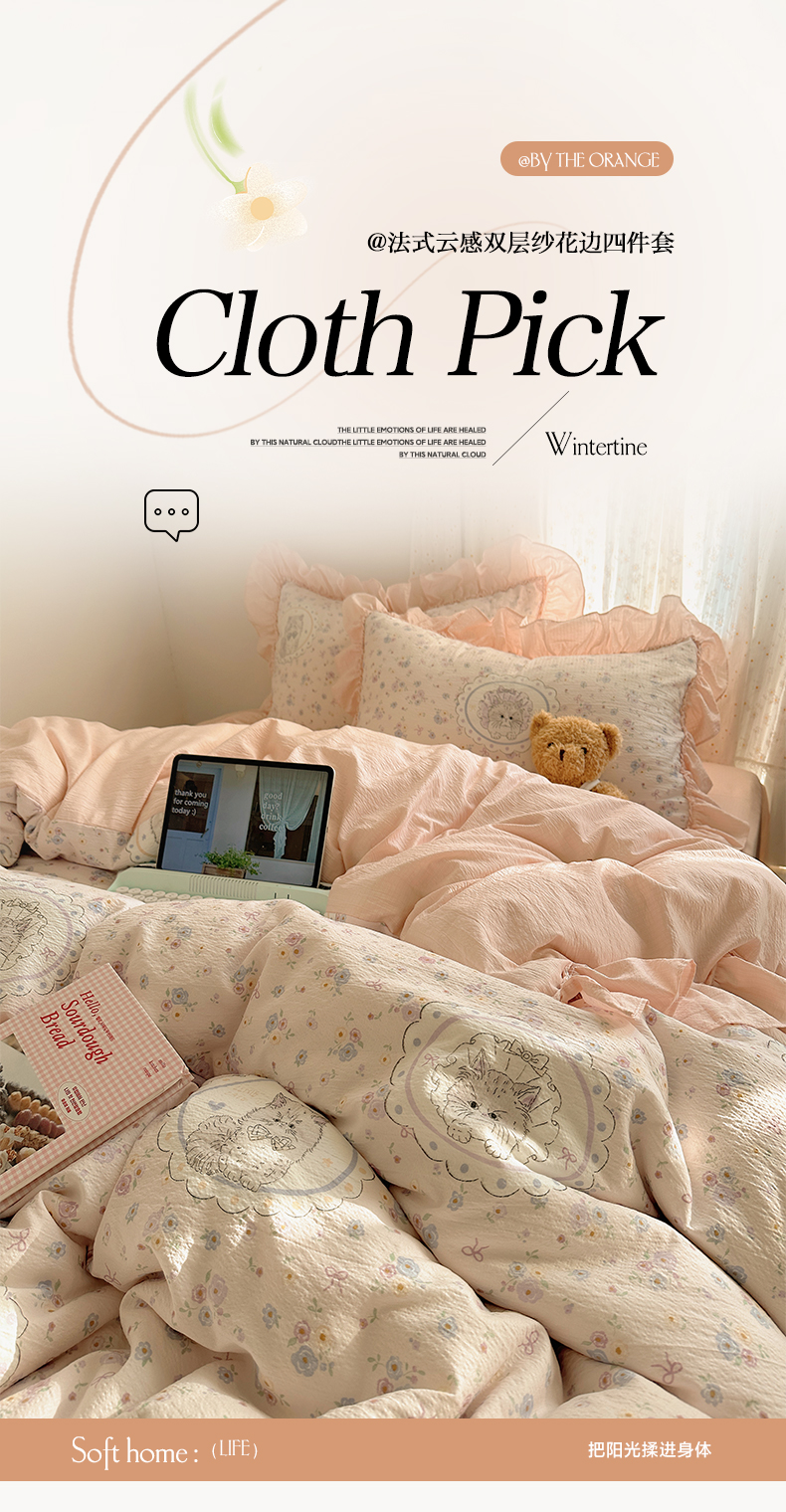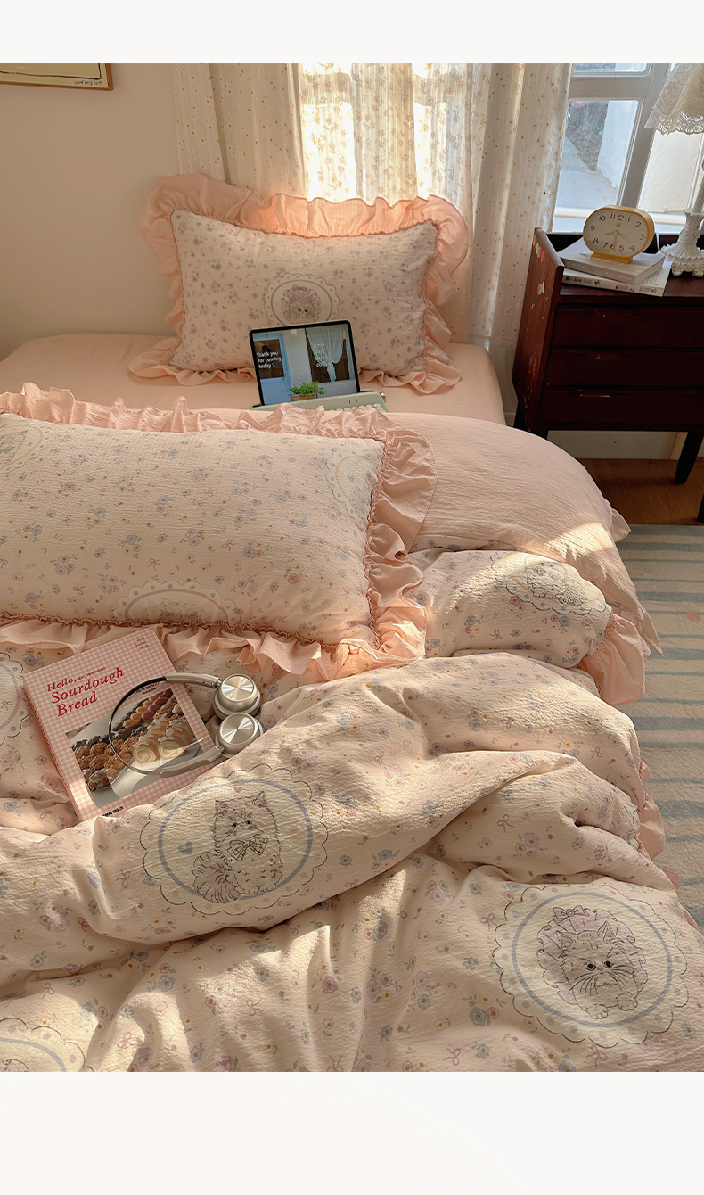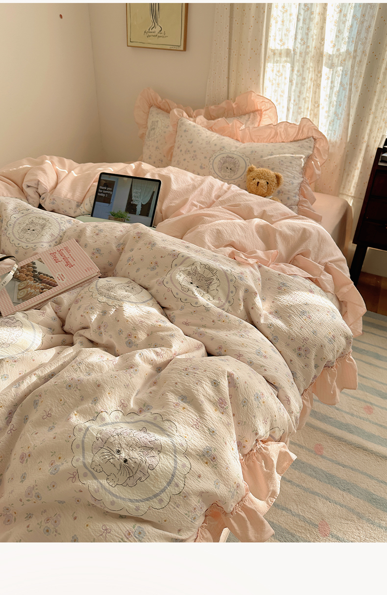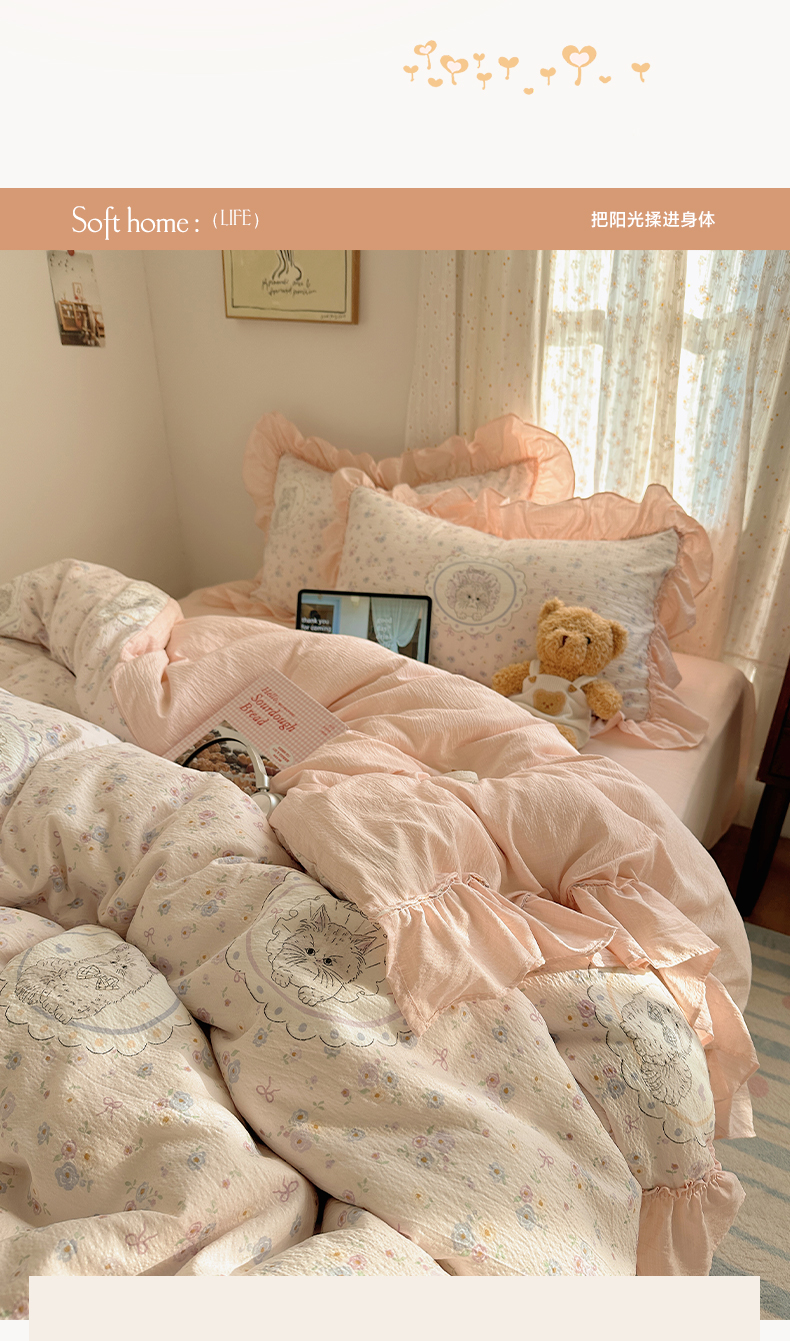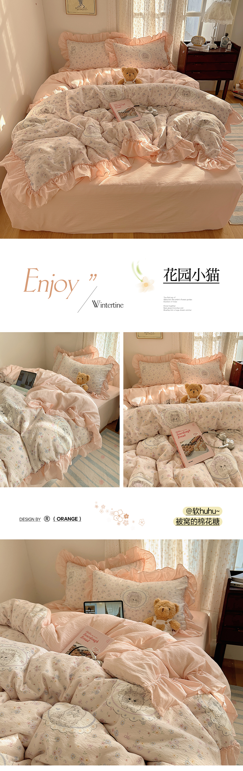 商品名称:美乐迪家纺 2026新款法式云感双层纱花边四件套 花园小猫